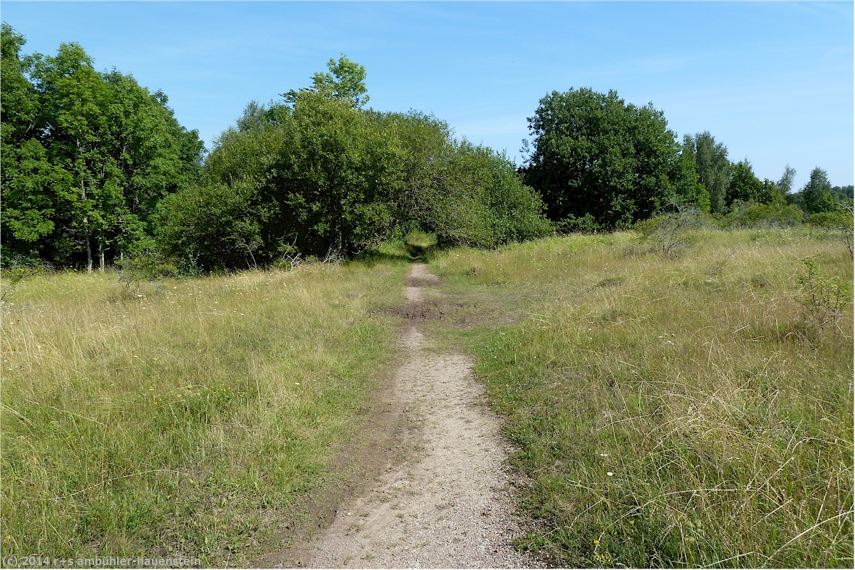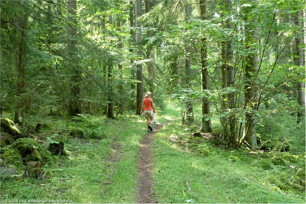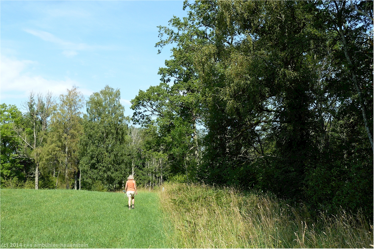 durch einen schmalen waldstreifen erreichen wir den dorfrand. an einem bauernhof vorbei gelangen wir zum bahngleis, aber der auf der karte vermerkte bahnübergang ist aufgehoben, wir müssen deshalb einen kleinen umweg machen. auf der anderen seite des bahngleises folgen wir für ein kurzes stück der überlandstrasse, auf welcher wir gestern richtung lidköping gefahren sind. es ist nicht ganz einfach, den anfang des pfades zu finden, welcher uns durch einen dichten laubwald zu einer schutzhütte führt. es begegnet uns eine gruppe biker, welche wir heute noch mehrmals antreffen werden. kurz nach der hütte führt der wanderweg auf's offene feld hinaus, sofort wird es deutlich wärmer.
