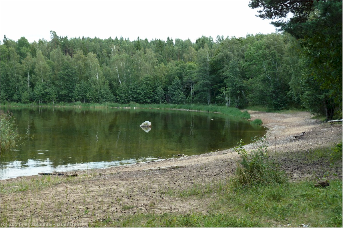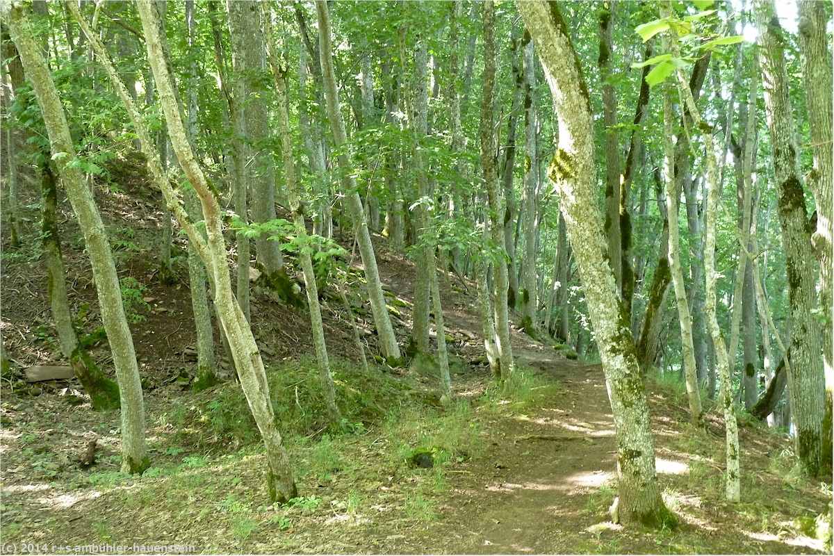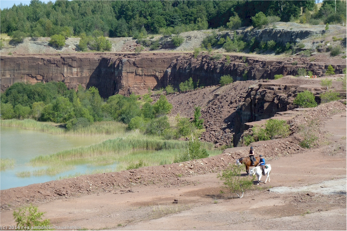 nach etwa 45 minuten gelangen wir an einen see in einem canyonartigen gebiet. wir erfahren später, dass hier kies für die nahe zementfabrik abgebaut wurde, nach der stilllegung dieses tagbaues wurde daraus ein naturreservat gemacht. in diesem künstlichen see wurden offenbar fische ausgesetzt, die man nun fangen kann. auf unseren karten gibt es einen weg rund um den see, dieser ist jedoch nicht durchgängig eingezeichnet. wir finden aber einen pfad hoch über dem ufer. gerade als wir zu diesem hinuntersteigen, tauchen am gegenüberliegenden ende zwei reiter auf. das rote gestein, das weite tal und die beiden reiter erinnern uns an einen western. nach dem wir etwa einen viertel des sees umrundet haben, führt der pfad in einen dichten wald hinein, dies ist der nicht durchgängige teil auf der karte. der pfad ist aber immer noch gut erkennbar. ausnahmsweise gehe ich einmal voraus und trete um ein haar auf eine schlange oder wohl eher eine blindschleiche. das tier verschwindet blitzartig im dickicht.