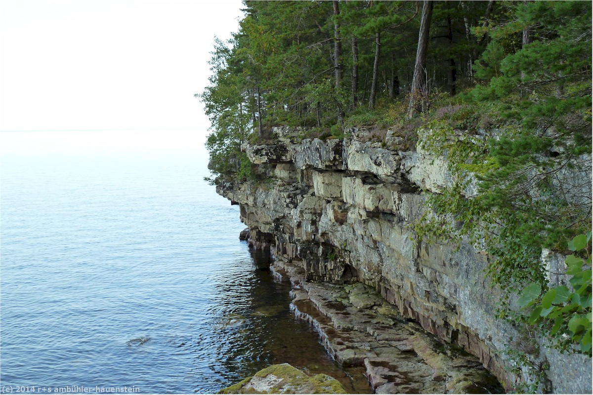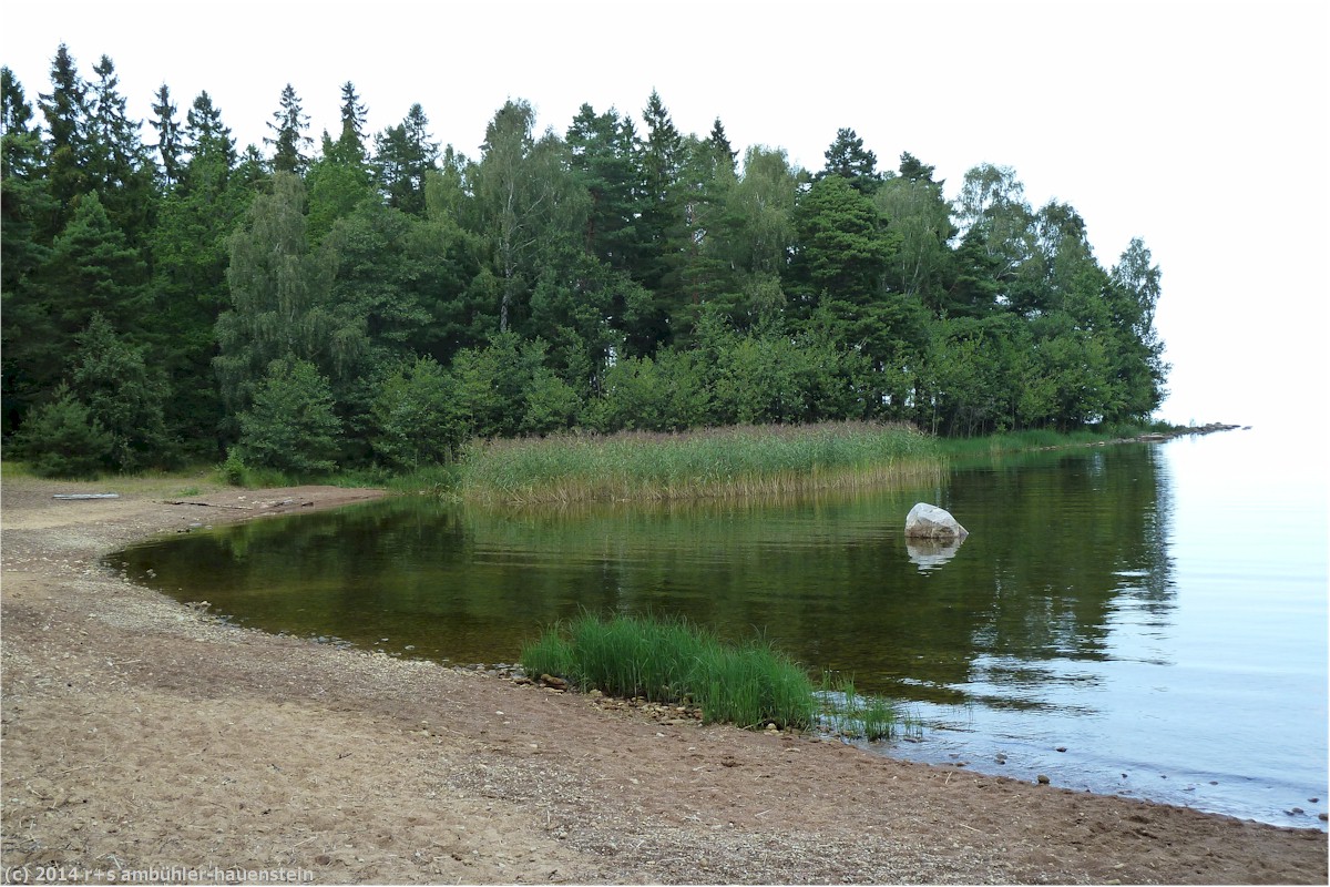 um 15:30 uhr sind wir beim kleinen coop, wo susanne einige lebensmittel einkauft. auf dem weg zurück zum campingplatz müssen wir an einem riesigen industriegelände vorbei, doch der wanderweg führt durch einen wunderschönen wald. wäre nicht der lärm der fabrik, man würde sich in einer einsamen gegend wähnen. einen kilometer vor dem campingplatz überqueren wir dessen zufahrtsstrasse und wandern direkt dem ufer entlang. wir kommen an einer schönen bucht vorbei, dann folgt der weg einer steilküste, vielleicht etwa 10 meter über dem wasserspiegel.