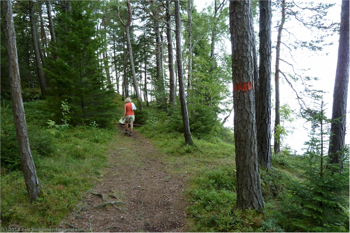 kurz nach 11 uhr starten wir zu unserer wanderung, welche direkt beim campingplatz beginnt. susanne mit karte und ich mit GPS suchen einen weg zum aussichtsturm auf dem kinnekulletornet. es gibt zwar einen wanderweg - eigentlich ein pilgerweg, dieser führt insgesamt 46 km durch dieses gebiet, wir möchten aber eine rundwanderung machen. gemeinsam finden wir eine route richtung turm.