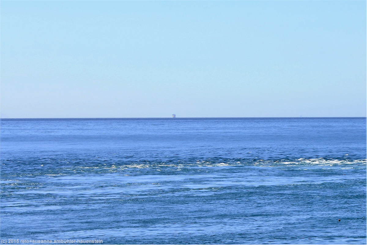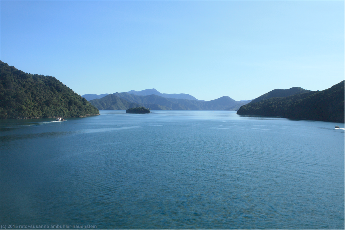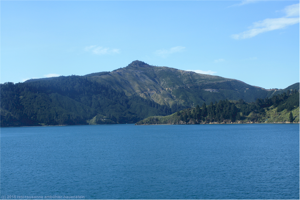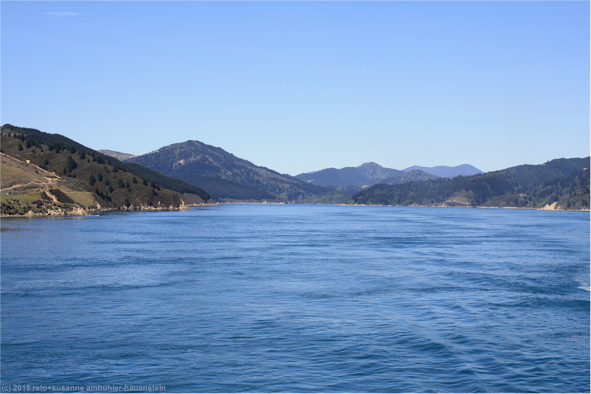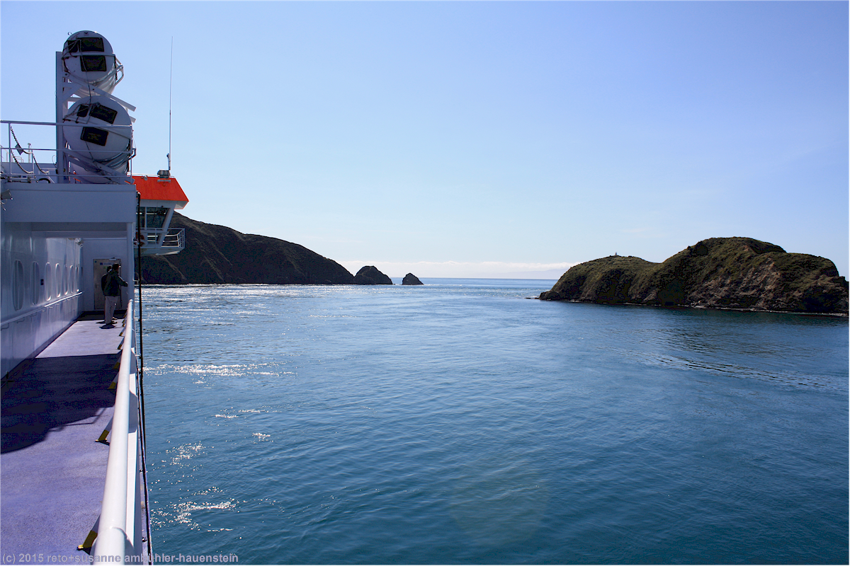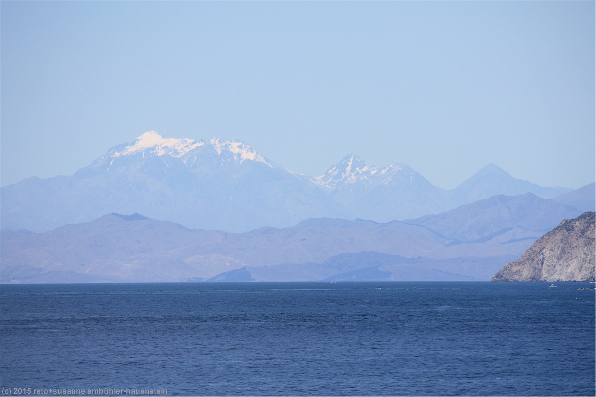 als wir vom tory channel ins offene gewässer zwischen den inseln gelangen ändert sich wenig, das meer bleibt äusserst ruhig. der kapitän hat eine angenehme überfahrt versprochen und so ist es auch. am horizont erkenne ich ein grosses schiff, welches durch die cook strait fährt. im süden sind schroffe berge zu sehen, deren gipfel schnee bedeckt sind.