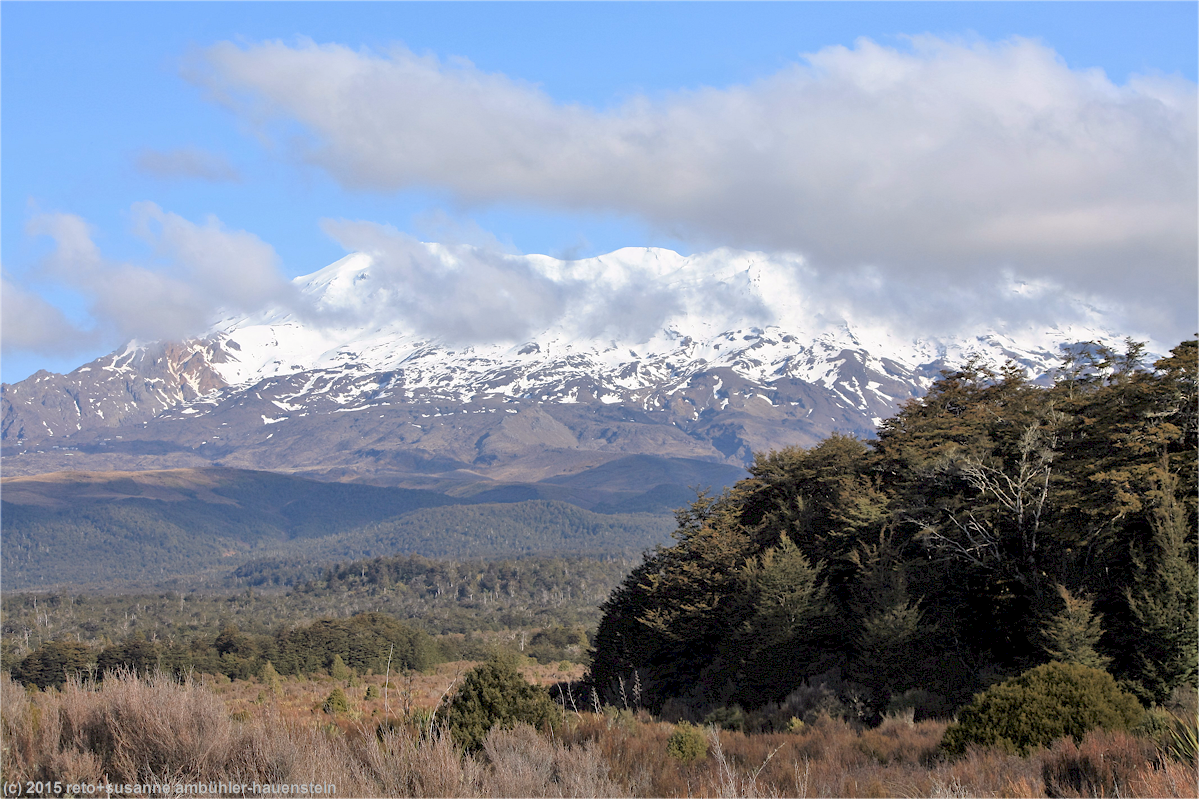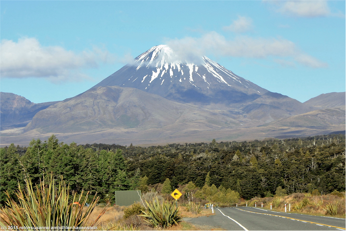 wir folgen dem highway 1 nordwärts. anfangs ist dies eine 4-spurige autobahn und wir kommen gut voran, aber bei paremata wird die autobahn zu einer gewöhnlichen, zweispurigen hauptstrasse. die fahrt entlang der ziemlich dicht bewohnten küste erfordert sehr viel geduld, ein krasser gegensatz zu den letzten tagen an der einsamen westküste der südinsel. kurz nach 15 uhr erreichen wir wanganui. eine brücke führt über den gleichnamigen fluss ins stadtzentrum. wir essen in einem netten restaurant zu mittag. weniger als eine stunde später sind wir schon wieder unterwegs. wir tanken noch unseren wagen auf, dann folgen wir dem fluss landeinwärts. die strasse ist schmal, kurvenreich und an manchen stellen in einem ziemlich schlechten zustand. ganz besonders mühsam ist aber der holztransporter vor uns, der um keinen preis die strasse freigeben will. es dauert ewig, bis wir gelegenheit haben, das rollende hindernis zu überholen. dass hier intensive holzwirtschaft betrieben wird, sieht man auch der landschaft an. manche hügel sind kahl gerodet, andere wurden wieder aufgeforstet, so oder so ist dies hässlich anzuschauen, kein vergleich mit den natürlichen, äusserst üppigen mischwäldern. gegen 18 uhr nähern wir uns unserem tagesziel. verkehr hat es längst keinen mehr, wir sind ganz alleine unterwegs. wir stoppen bei einem hügel, von welchem aus wir eine fantastische aussicht auf den beinahe perfekt geformten vulkan ngauruhoe haben, aber auch der schneebedeckte ruapehu ist herrlich anzusehen.