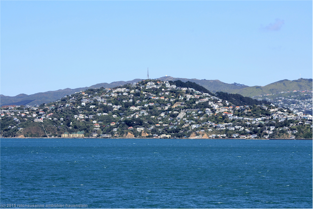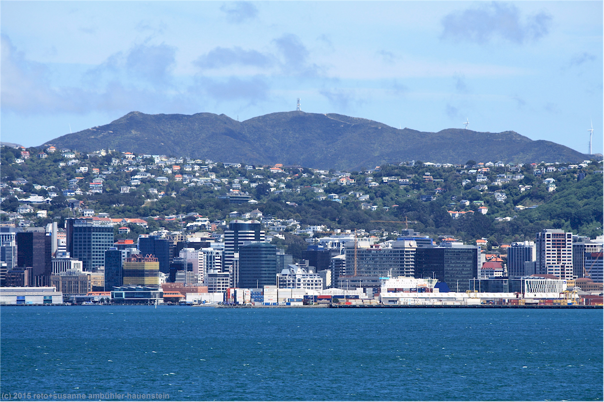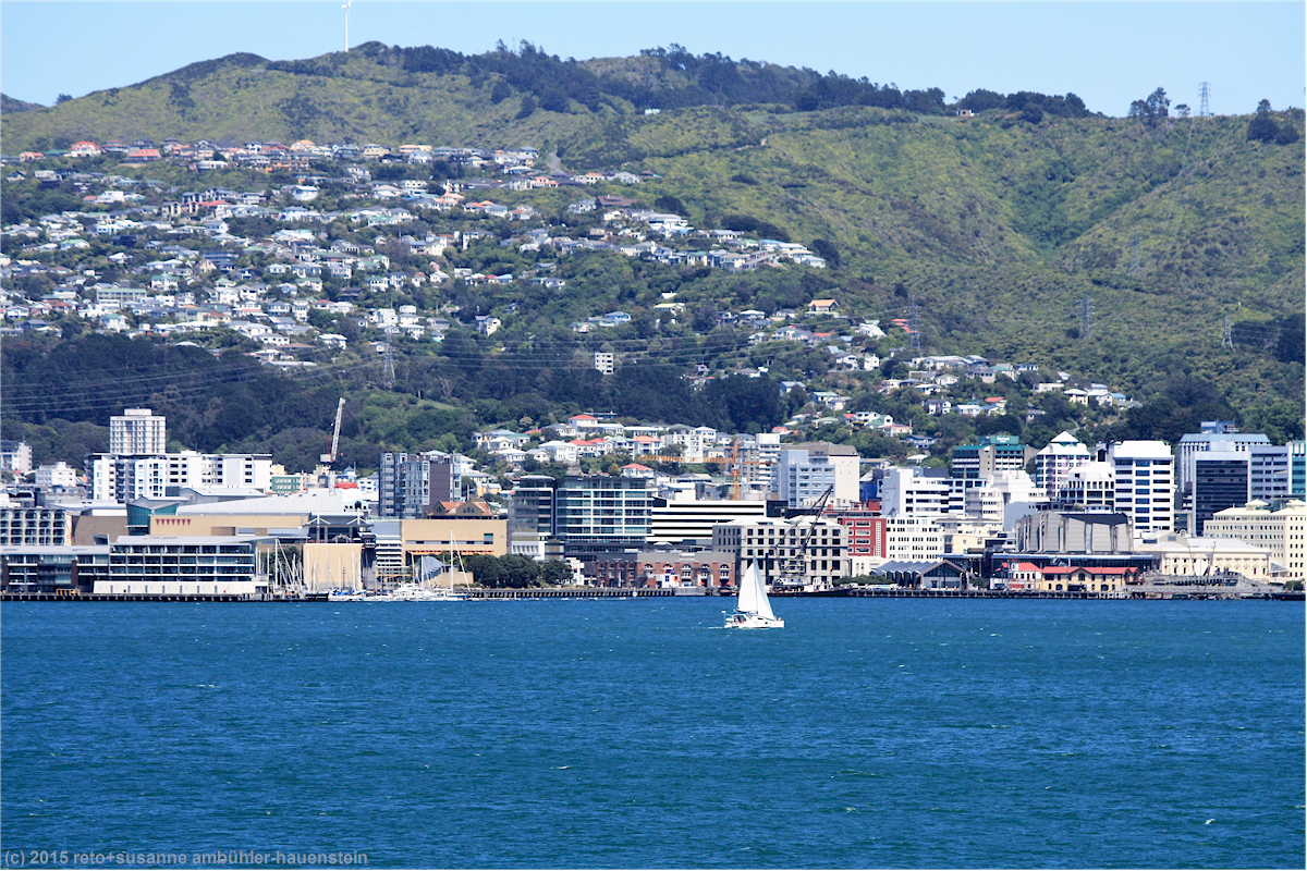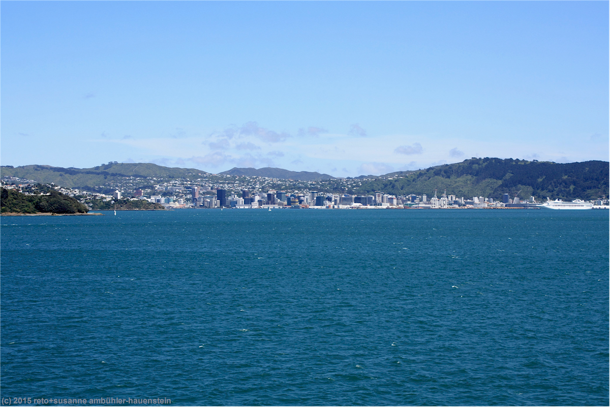wie vom kapitän angekündigt erreichen wir wellington schon vor der fahrplanmässigen ankunft. das wetter ist nach wie vor sehr sonnig. es dauert ein bisschen, bis wir die fähre verlassen können, im engen hafen herrscht ein kleines verkehrschaos. da wir noch eine lange fahrt vor uns haben, verzichten wir auf einen abstecher in die stadt und machen uns sofort auf den weg.