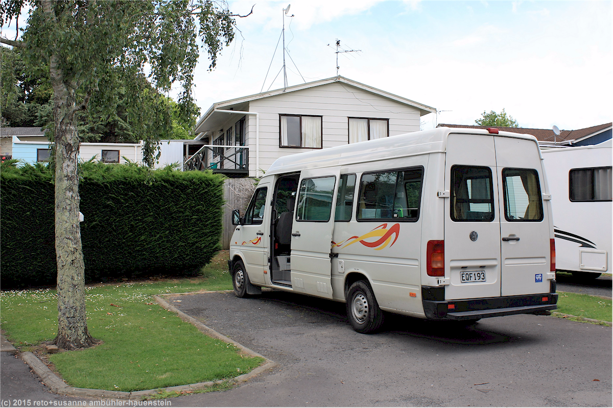 bei einem anderen käfig treffen wir auf eine junge frau, welche mit viel hingabe fakten zu einheimischen falken erzählt. das exemplar im gehege wurde von einem jäger angeschossen, einer der flügel ist verletzt. der falke kann daher nicht mehr richtig fliegen, bloss noch von einem ast zum anderen flattern. offenbar kommt es in neuseeland immer wieder vor, dass menschen aus purer lust auf greifvögel schiessen, ein trauriger fakt, der wohl nicht nur für neuseeland zutrifft. gegen 12:30 uhr beenden wir unseren rundgang und fahren ins ortszentrum, wo wir eine kleinigkeit essen. eine stunde später machen wir uns auf den weg richtung auckland. morgen abend wollen wir bei unseren freunden in whangapaoroa nördlich der grossstadt sein, vorher wollen wir aber noch "shoppen" gehen. unser tagesziel haben wir deshalb südlich von auckland gewählt. auf der strasse nummer 39 geht es in zügiger fahrt nordwärts. bei ngaruawahia treffen wir auf den highway 1, nun nimmt der verkehr kontinuierlich zu, je mehr wir uns auckland nähern, bleibt aber stets flüssig. um 15:30 uhr erreichen wir unser tagesziel manukau. der campingplatz befindet sich nahe der autobahn neben einem fitnessstudio mit ziemlich lauter musik, ganz in der nähe des flughafens. der platz ist nicht überwältigend, aber für eine nacht in der nähe einer grossstadt durchaus akzeptabel.