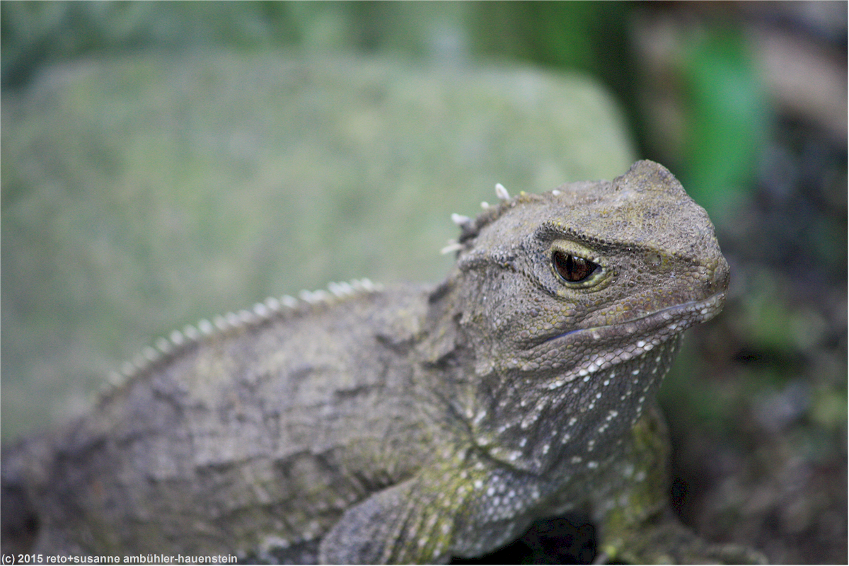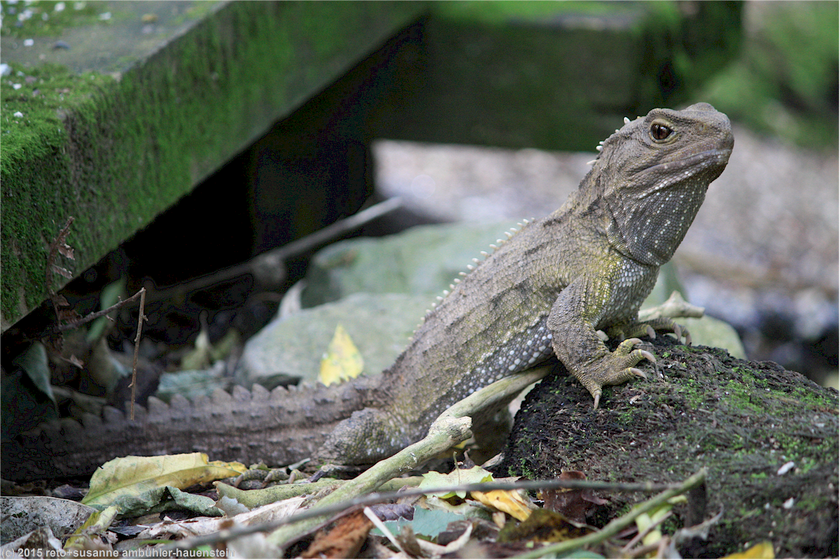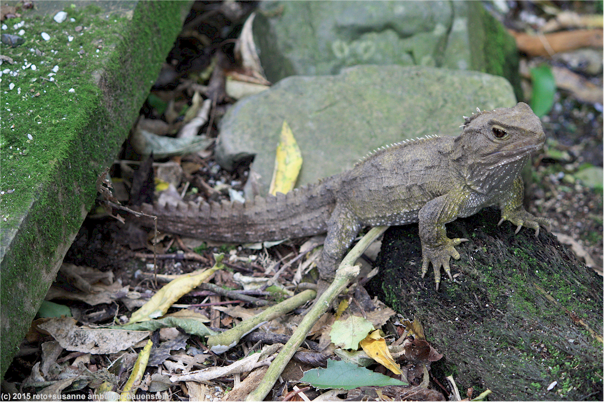 schliesslich setzen wir unseren rundgang fort und stossen schon bald auf kleine echsen, die am wegrand sitzen. sie werden als tuatara bezeichnet und scheinen auf der suche nach einem sonnigen plätzchen zu sein.