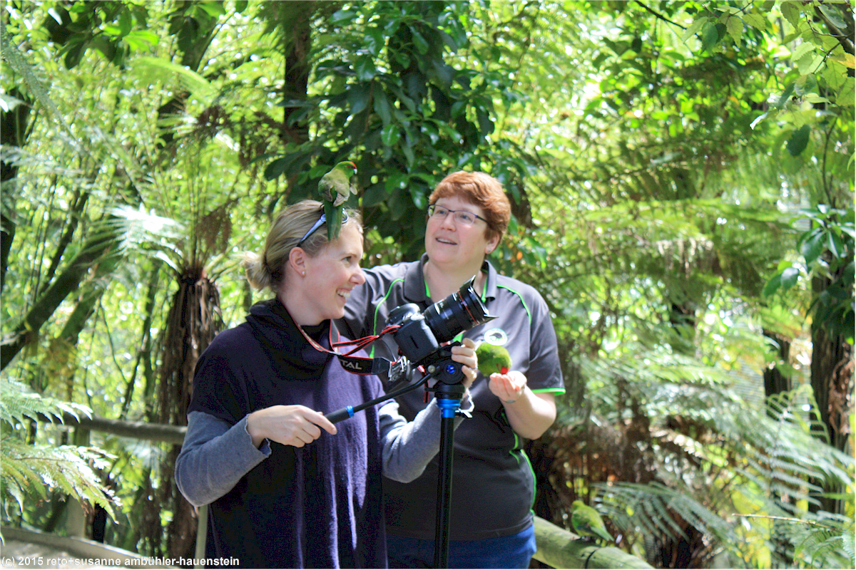 als nächstes besuchen wir ein riesiges gehege mit kleinen, grünen papageien. eine tierpflegerin und eine fotografin sind gerade dabei, fotos für eine neue broschüre zu machen. wir schauen den beiden zu. die tierpflegerin hat einen dieser grünen vögel auf der hand und füttert ihn mit körnern, während die fotografin bilder macht. plötzlich landet ein papagei auf dem kopf der fotografin, vorbei ist die konzentration. die tierpflegerin meint, in kürze könne das publikum die kleinen vögel füttern, wir sollten das keinesfalls verpassen.