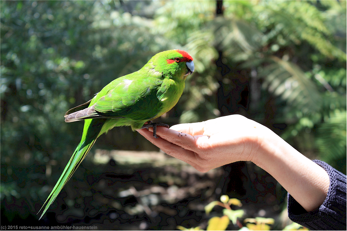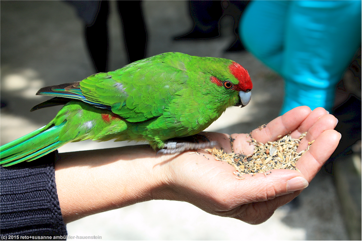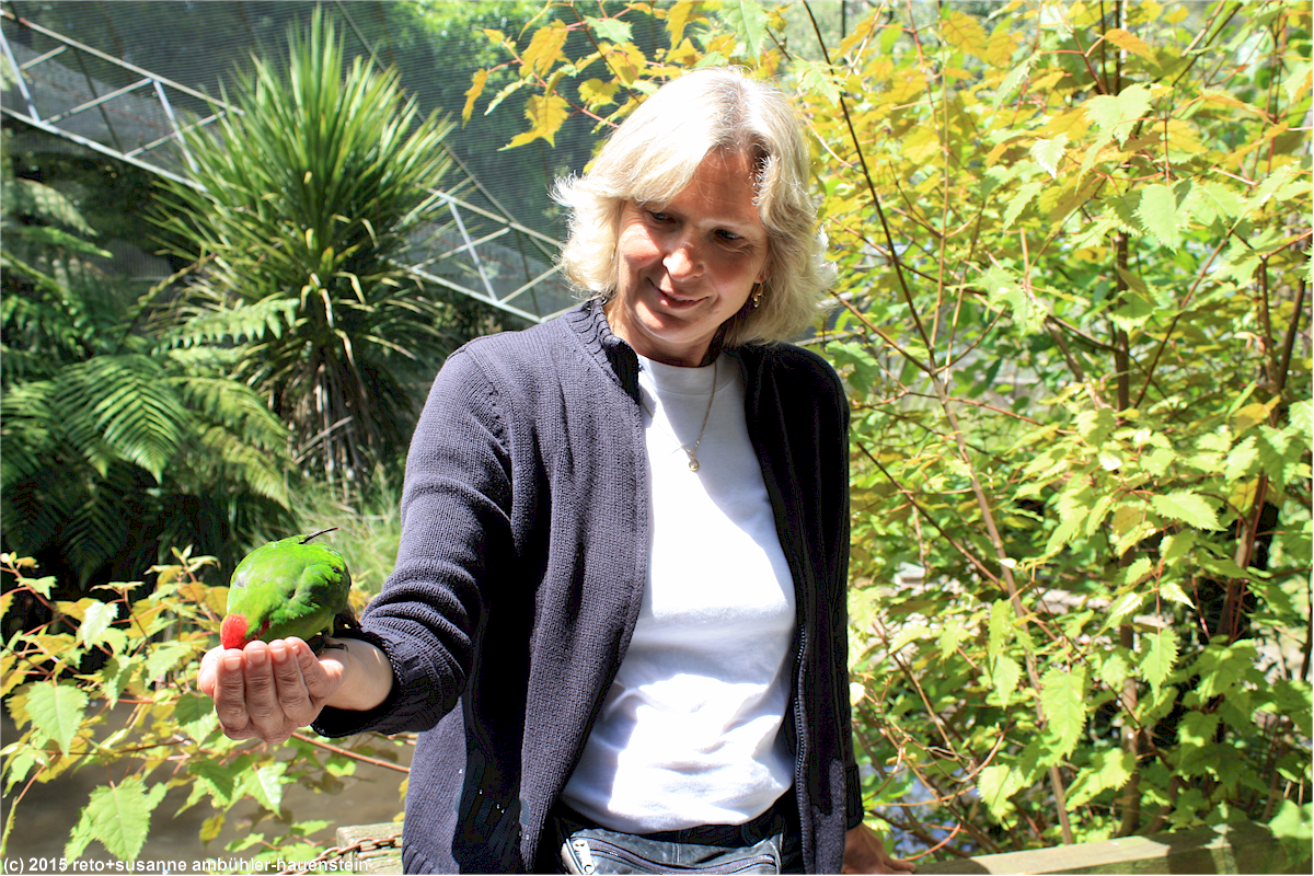 tatsächlich tauchen schon bald einige angestellte des kiwi parkes auf und verteilen an die besucher körner für die kleinen papageien, welche als red-crowned kakariki bezeichnet werden. auch susanne lässt sich etwas vogelfutter in die hand geben und schon taucht einer dieser kleinen grünen vögel auf und tut sich gütlich daran.