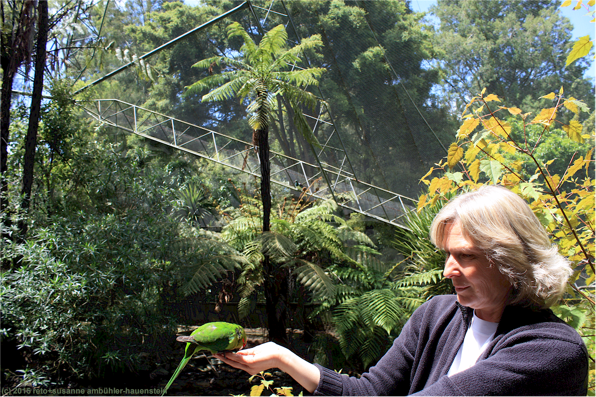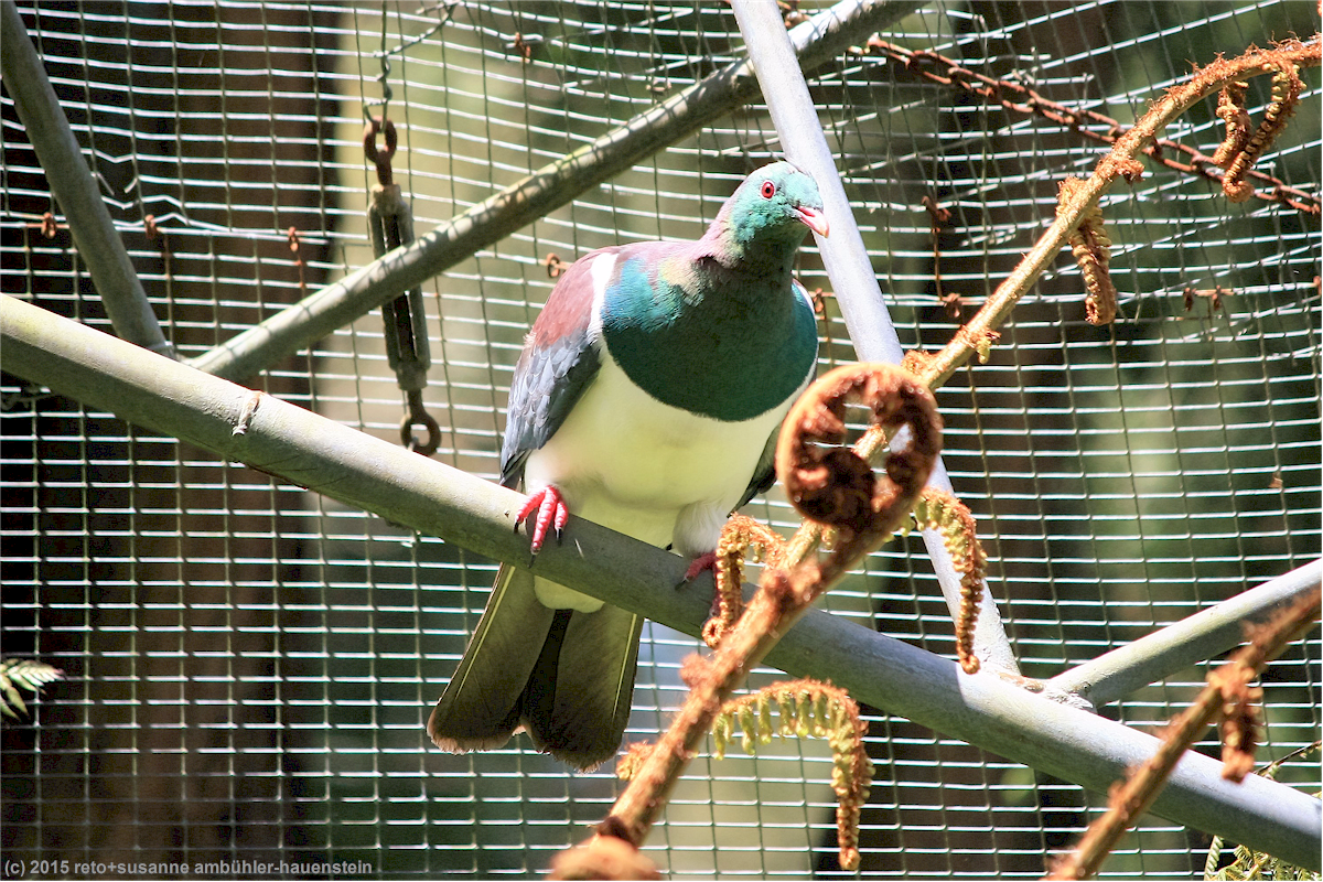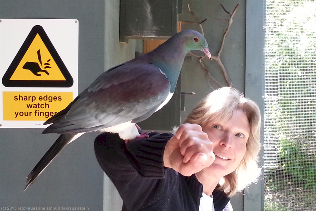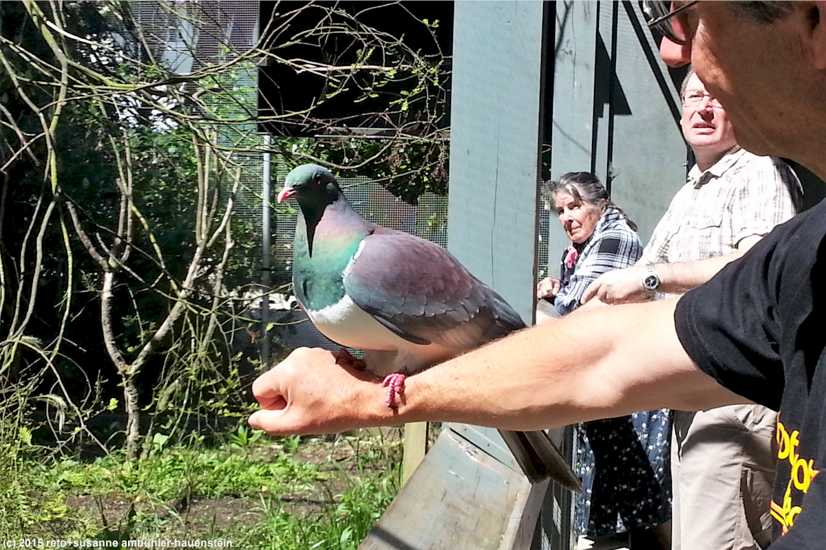 wir schauen dem kiwi und auch seinen verwandten in den anderen gehegen noch eine weile zu, dann verlassen wir das kiwi house. wir spazieren durch die anlage und treffen bald auf ein gehege mit einer einheimischen taube. schon am eingang hatte man uns erklärt, dass dieser vogel von menschenhand aufgezogen wurde, er deshalb keine scheu vor menschen hätte und die besucher als "spielkameraden" betrachten würde. als wir die voliere betreten sitzt die taube weit entfernt auf einem ast und beäugt uns interessiert. wir sind alleine im gehege und warten gespannt, was passiert. die taube beginnt sich unruhig auf dem ast hin und her zu bewegen, wir haben den eindruck, ihre neugier wird grösser und grösser. tatsächlich kommt sie plötzlich angeflogen und landet auf meinem kopf ! das fühlt sich nicht besonders angenehm an, ich bin deshalb froh, als sie zu susanne weiterfliegt und sich auf ihren arm setzt. später landet sie auch auf meinem arm, da fühle ich mich schon viel wohler dabei. nach ein paar minuten hat die taube ihre neugier gestillt und fliegt zurück zu ihrem ast, das war eine sehr interessante erfahrung.