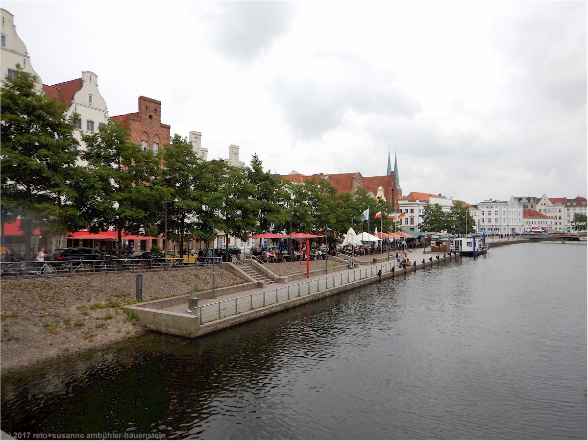 schliesslich kehren wir zum ausgangspunkt unseres stadtrundganges zurück und setzen uns an der obertrave in ein hübsches strassenrestaurant. hier reiht sich ein lokal ans andere, es ist schwierig, sich für eines zu entscheiden. während wir essen, fallen wieder ein paar regentropfen, aber im schutz der sonnenschirme bleiben wir trocken. während wir einen kaffe trinken, beginnen sich die grauen wolken plötzlich zu verziehen.