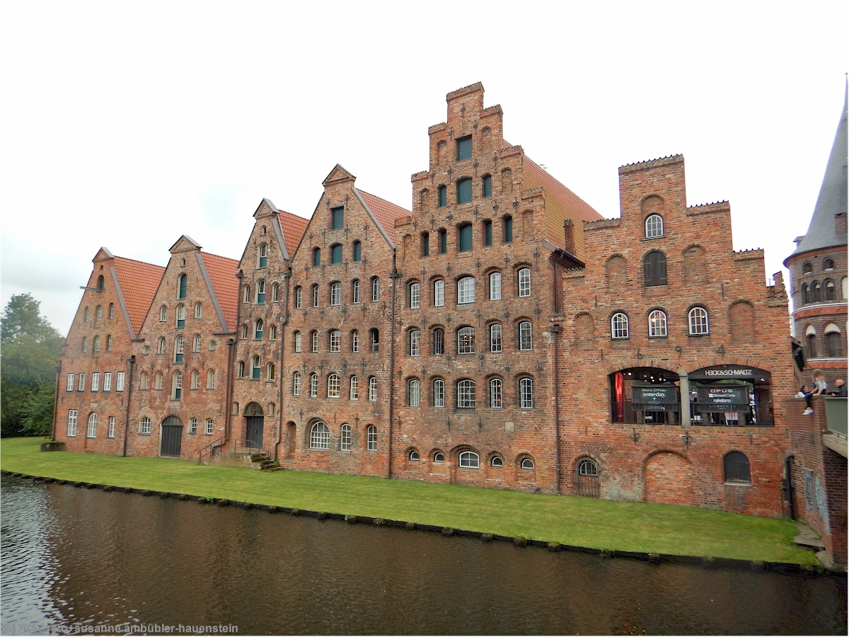backsteinhäuser am ufer der trave beim holstentor |