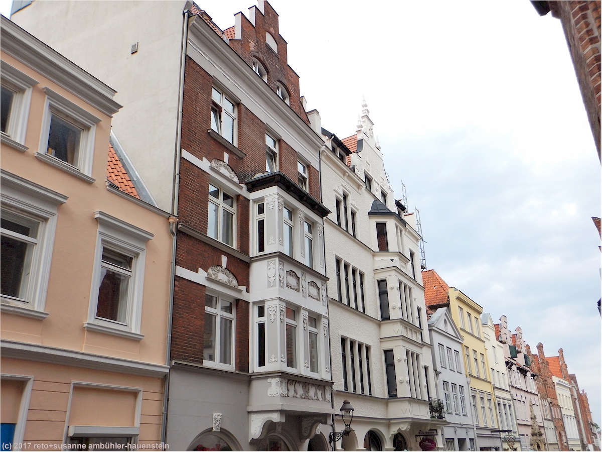 auf der "königstrasse" geht es weiter, vorbei an der trutzigen kirche sankt jakobi bis zur "glockengiesserstrasse". wir bewundern die schönen, frisch renovierten fassaden. die farben und formenvielfalt ist gross, die farbtöne sind aber immer sehr dezent.
