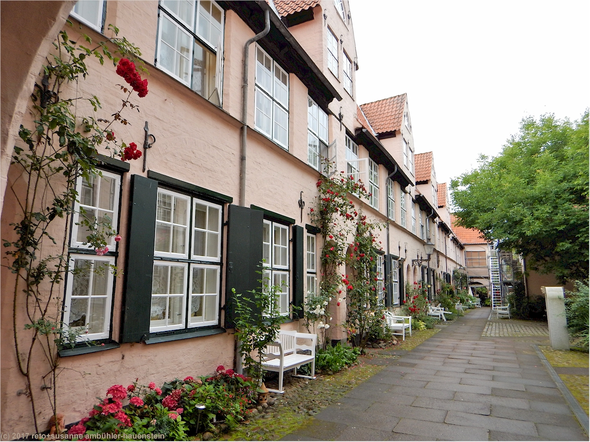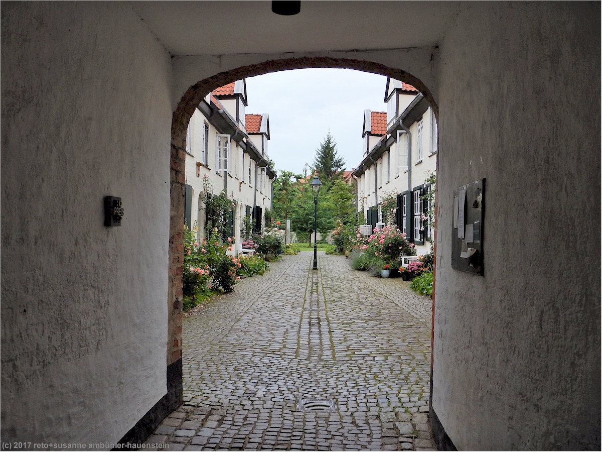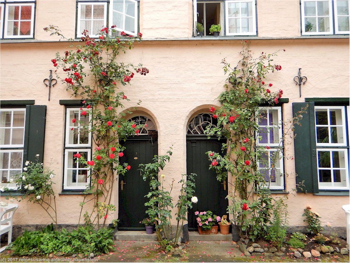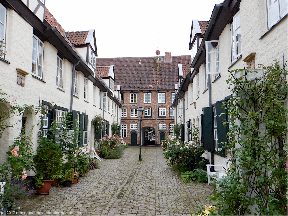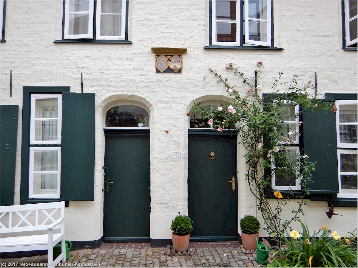 eine besonderheit in lübeck sind die sogenannten "höfe". durch einen ziemlich kleinen torbogen gelangen wir in den "füchtingshof" (nicht "flüchtlingshof" !) - benannt nach der person, welche den bau dieser häuser finanziert hatte. links und rechts des schmalen, langgezogenen innenhofes stehen mit blumen geschmückte reiheneinfamilienhäuser. diese wurden ursprünglich nach dem willen des wohlhabenden herrn füchting für die wittwen der seemänner gebaut. auch diese häuser müssen kürzlich renoviert worden sein, sie wirken frisch herausgeputzt. soweit wir bei einem kurzen, diskreten blick durchs fenster erkennen können, sind die wohnungen topmodern eingerichtet. hier zu wohnen muss etwas besonderes sein, es fühlt sich wohl ein bisschen an, als würde man in einem museum leben.