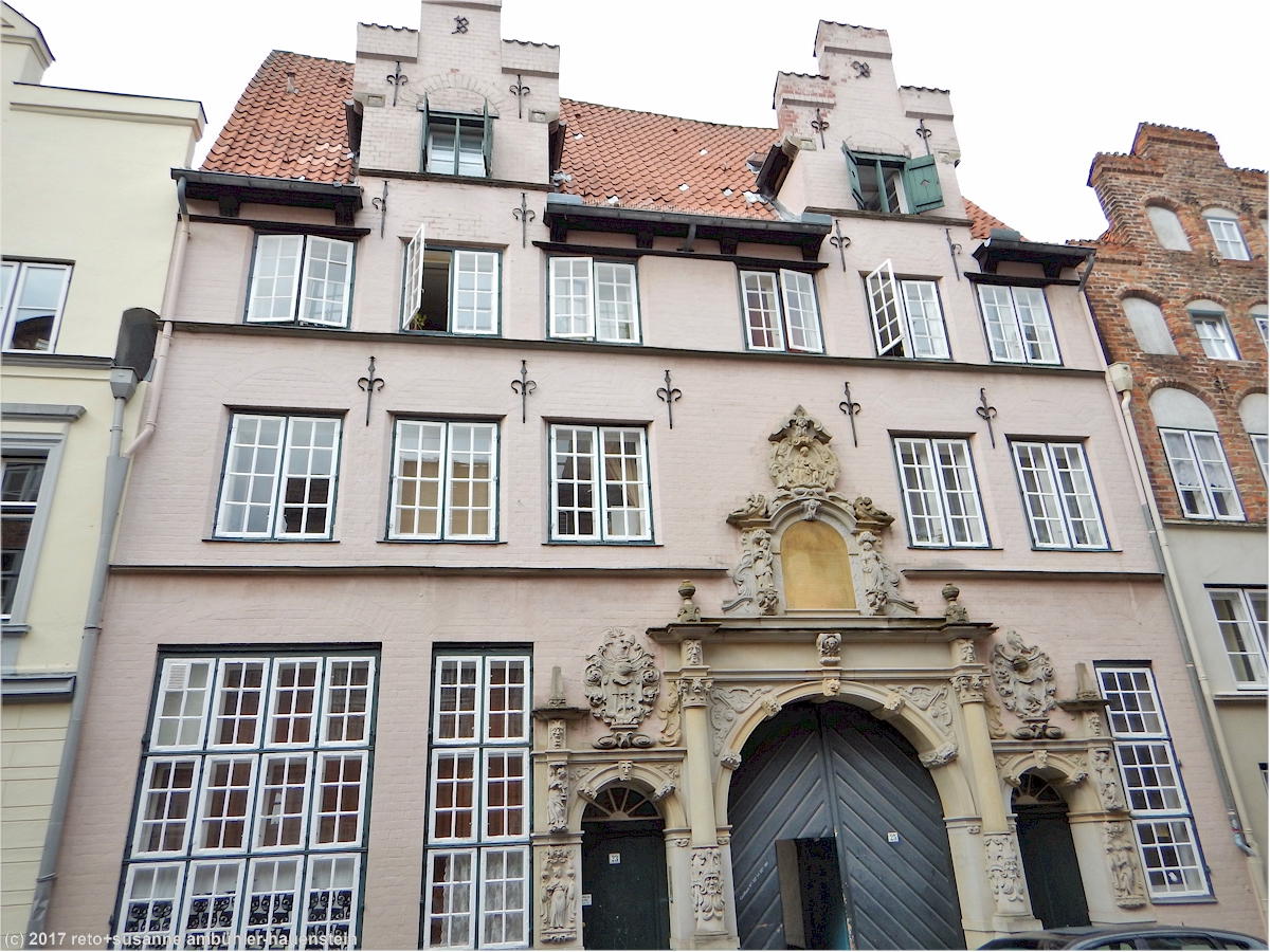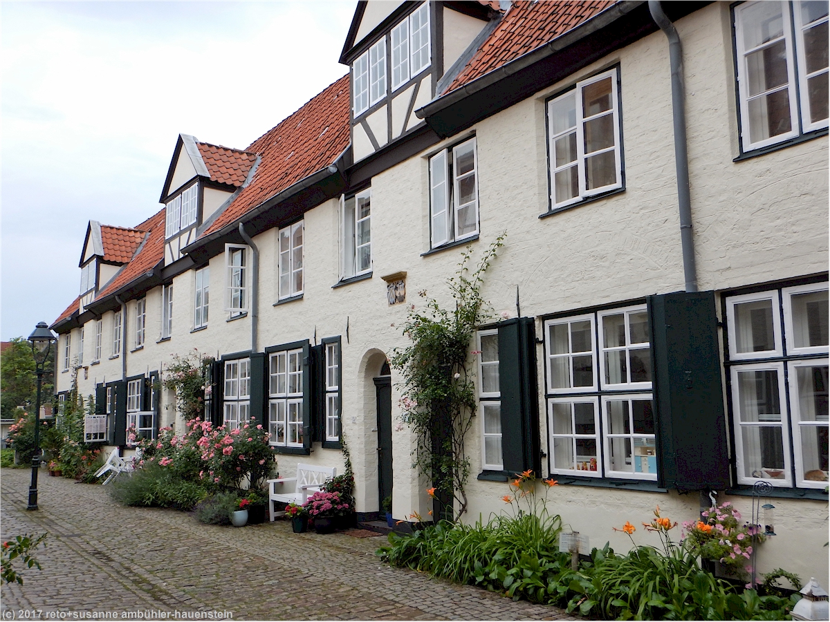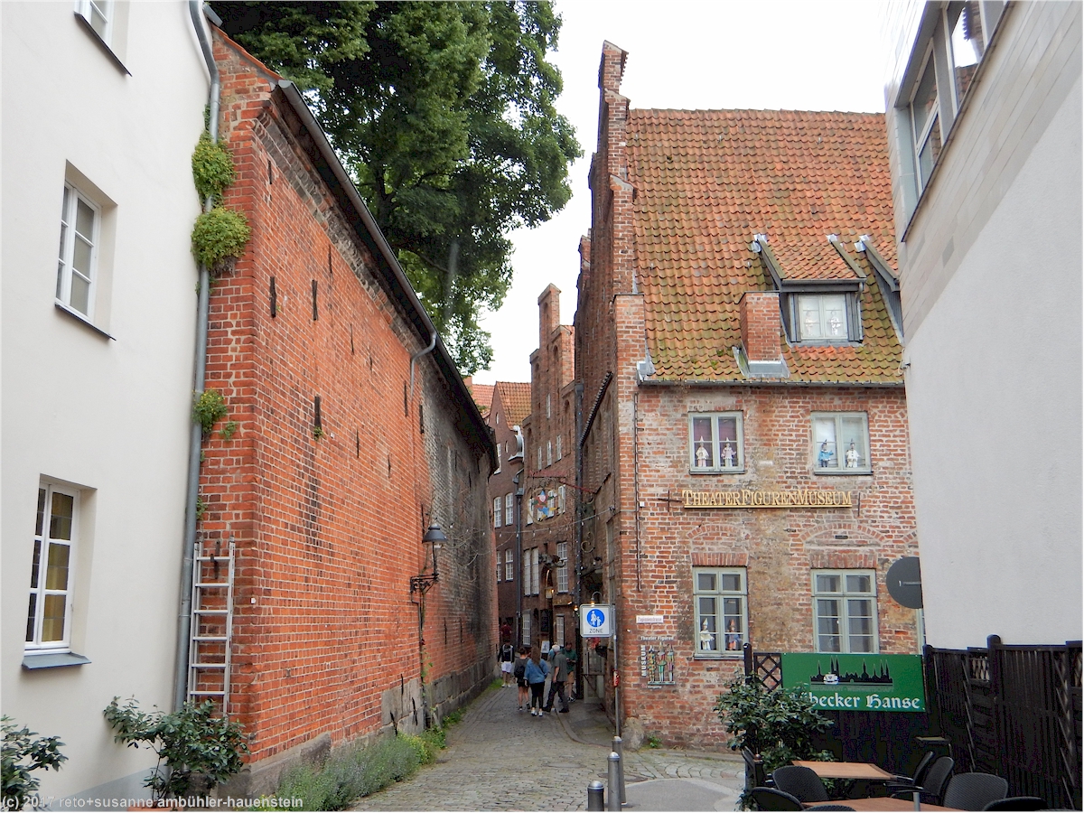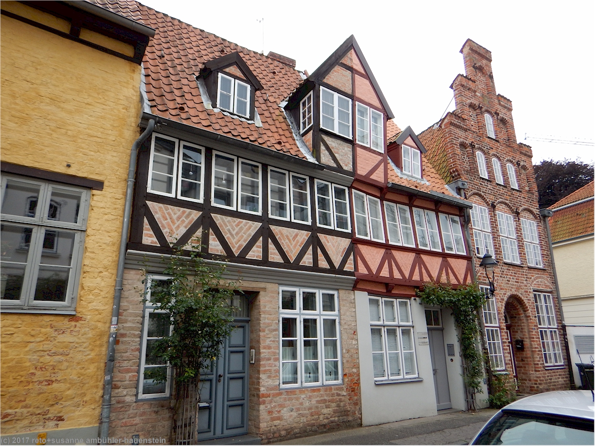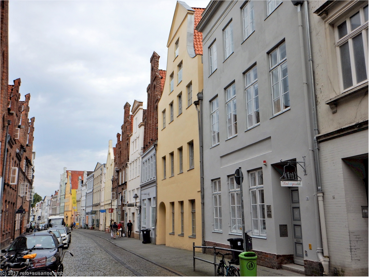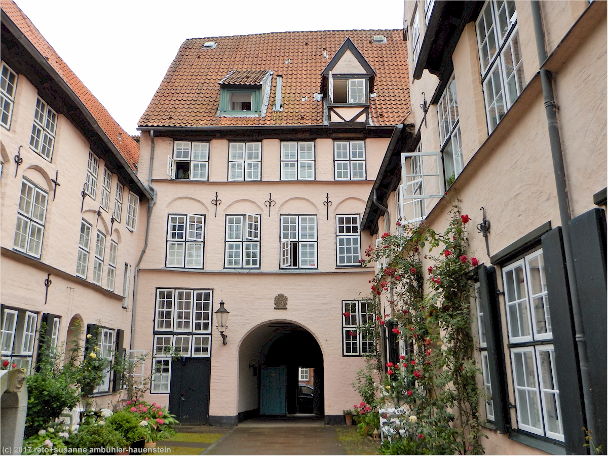 eine besonderheit in lübeck sind die sogenannten "höfe". durch einen ziemlich kleinen torbogen gelangen wir in den "füchtingshof" (nicht "flüchtlingshof" !) - benannt nach der person, welche den bau dieser häuser finanziert hatte. links und rechts des schmalen, langgezogenen innenhofes stehen mit blumen geschmückte reiheneinfamilienhäuser. diese wurden ursprünglich nach dem willen des wohlhabenden herrn füchting für die wittwen der seemänner gebaut. auch diese häuser müssen kürzlich renoviert worden sein, sie wirken frisch herausgeputzt. soweit wir bei einem kurzen, diskreten blick durchs fenster erkennen können, sind die wohnungen topmodern eingerichtet. hier zu wohnen muss etwas besonderes sein, es fühlt sich wohl ein bisschen an, als würde man in einem museum leben.
