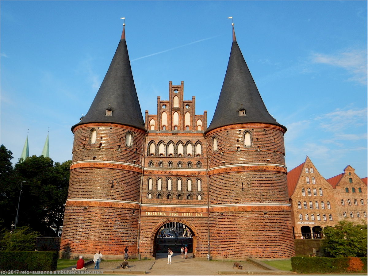 als wir kurz vor 20 uhr die altstadtinsel durchs holstentor verlassen, strahlt der mächtige bau in der abendsonne.