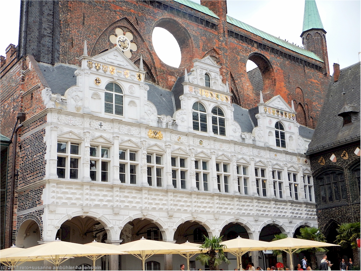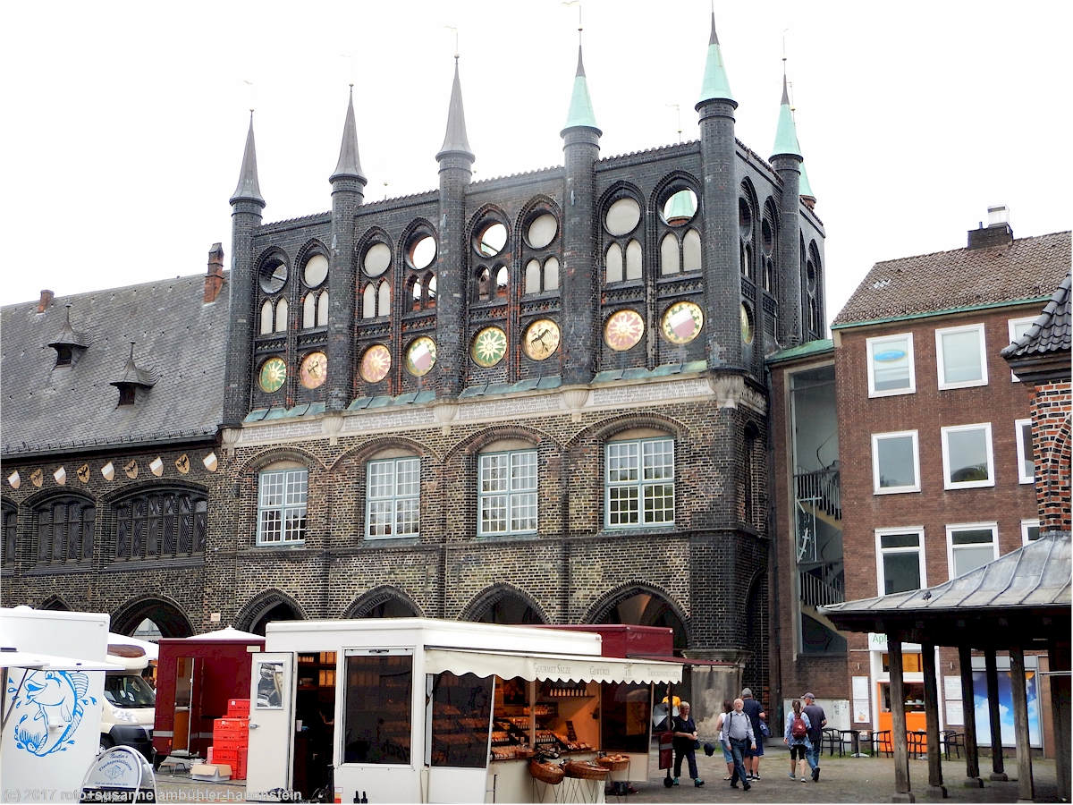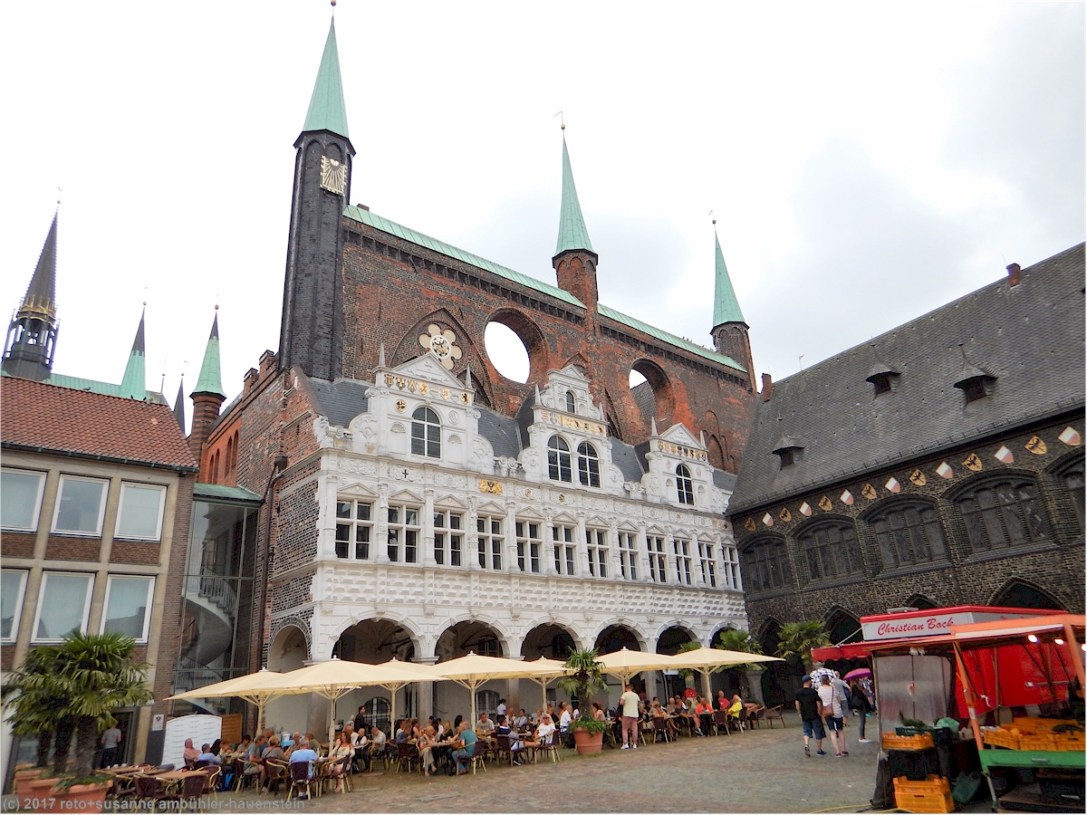 wir folgen nun der "grossen petersgrube" und dann der "schmiedestrasse" zum markt, wo das prächtige rathaus steht. auf dem platz hat es einige stände und ziemlich viele leute. das rathaus mit seinen zinnen, fenstern und verziehrungen scheint eben erst herausgeputzt worden zu sein. es ist ein mächtiges, kunstvolles gebäude, mit weissen, roten und schwarzen backsteinen errichtet.