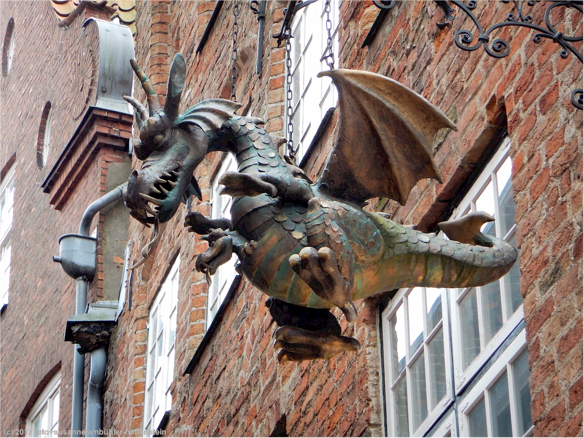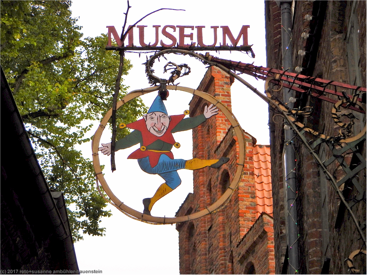 susanne hat inzwischen im touristenbüro einen stadtplan mit einem vorschlag für einen rundgang geholt. auf der nett gemachten offiziellen tourismusseite der hansestadt lübeck findet man historische und aktuelle informationen, vorschläge für stadtrundgänge und stadtpläne zum nachlesen und herunterladen. wir erfahren, dass die lübecker altstadt 1987 zum UNO weltkulturerbe erklärt wurde. entsprechend sind viele der alten bauten wunderschön renoviert worden. ganz in der nähe der sankt petrikirche spazieren wir durch die kolk, eine schmale gasse, die uns am TheaterFigurenMuseum lübeck vorbei führt. über dem eingang hängt ein kasperl und ganz in der nähe entdecken wir auch einen kleinen drachen.