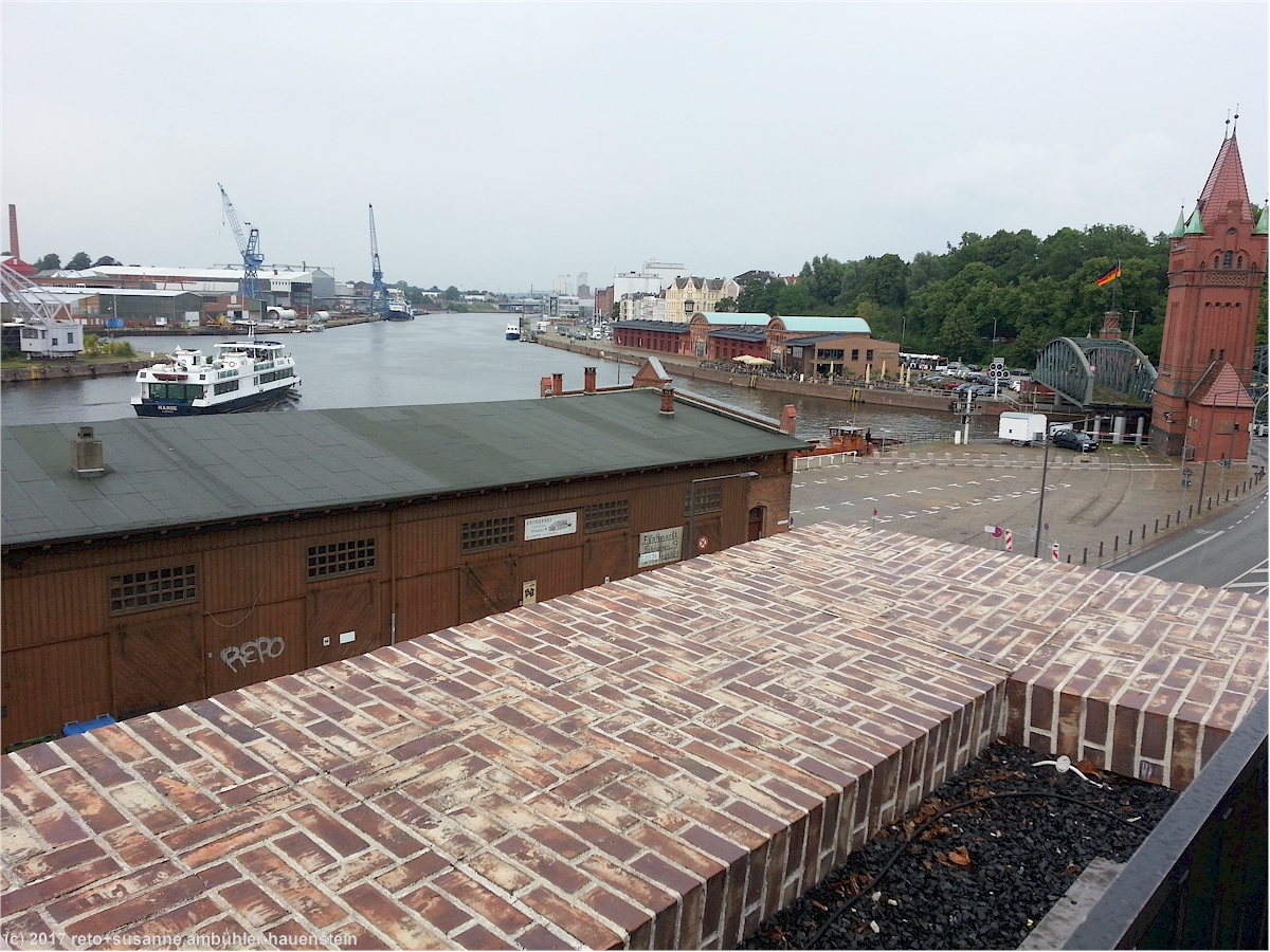 über die "breite strasse" und die "kleine burgstrasse" gelangen wir zum burgkloster. von der terrasse haben wir einen tollen ausblick auf die trave sowie den hansahafen und den burgtorhafen. beim letzterem hat es sowohl für die eisenbahn wie auch für die strasse eine hubbrücke.