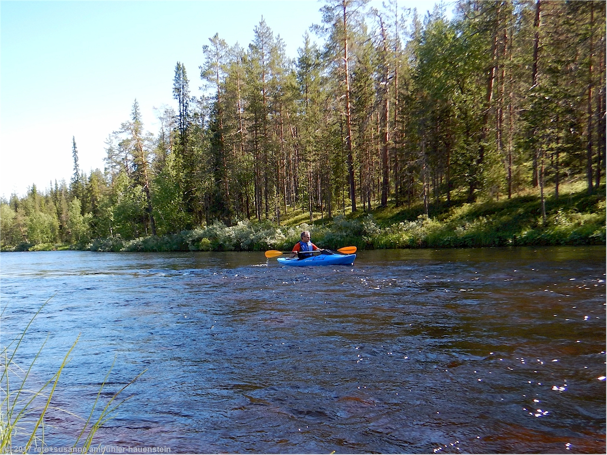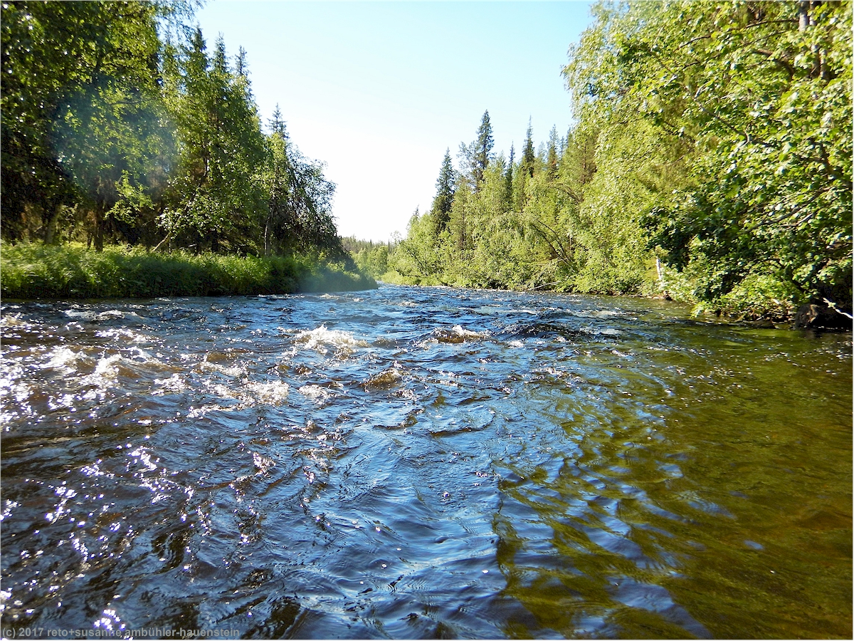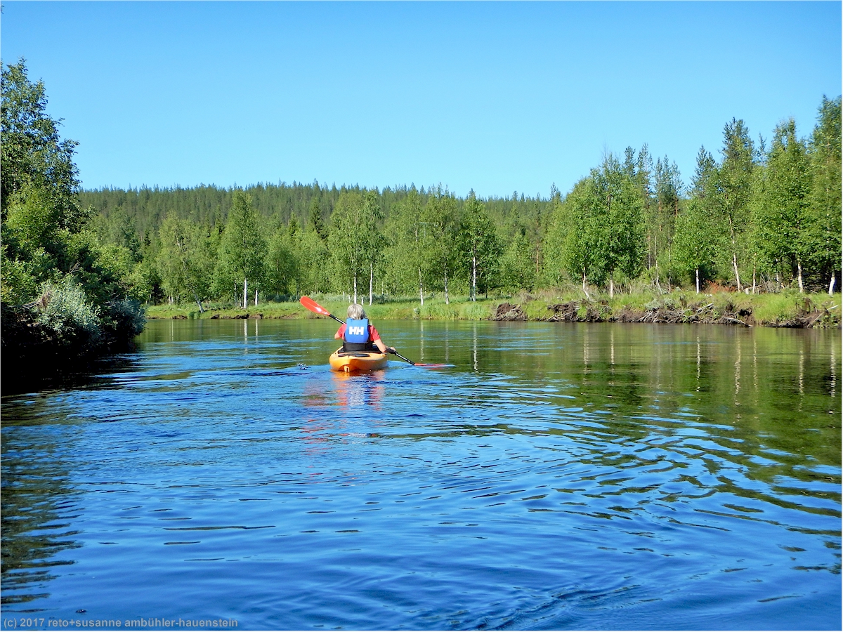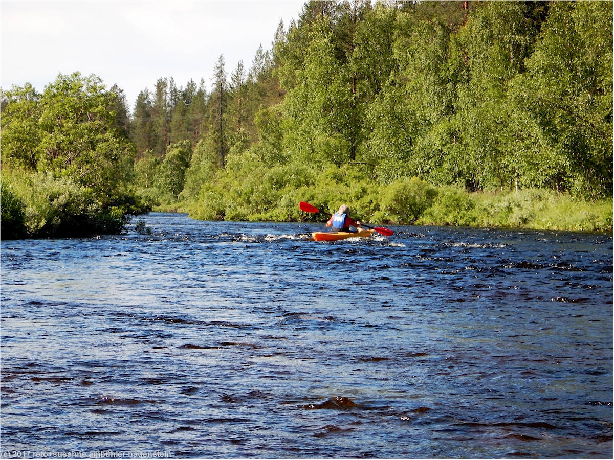wir paddeln in den fluss hinein und kommen bald an unserem campingplatz vorbei. kurz danach geht es unter der niedrigen strassenbrücke hindurch, anschliessend folgt der äkäsjoki mehr oder weniger der strasse nummer 940, auf der wir gestern gekommen sind. es hat deutlich mehr wasser als vor drei jahren, entsprechend ist die strömung etwas stärker, dafür ragen weniger steine aus dem wasser. das hindert mich allerdings nicht daran, mein kajak schon bald auf einen stein zu setzen und zwar so unglücklich, dass ich beinahe kentere. da mein boot gegen die strömung gekippt ist, wird es kräftig gegen den stein gedrückt und es dauert etwas, bis ich das kajak wieder flott gemacht habe. dies bleibt aber der einzige "zwischenfall" auf der ganzen tour. dank dem hohen wasserstand sind auch die mini-stromschnellen etwas grösser. echte wildwasser-kajaker würden diese wellen natürlich gar nicht bemerken, aber für uns sind diese "unebenheiten" genau richtig. in zügiger fahrt geht es flussabwärts. es ist herrlich, so alleine unterwegs zu sein. die wetterbedingungen sind optimal, sonnenschein pur.