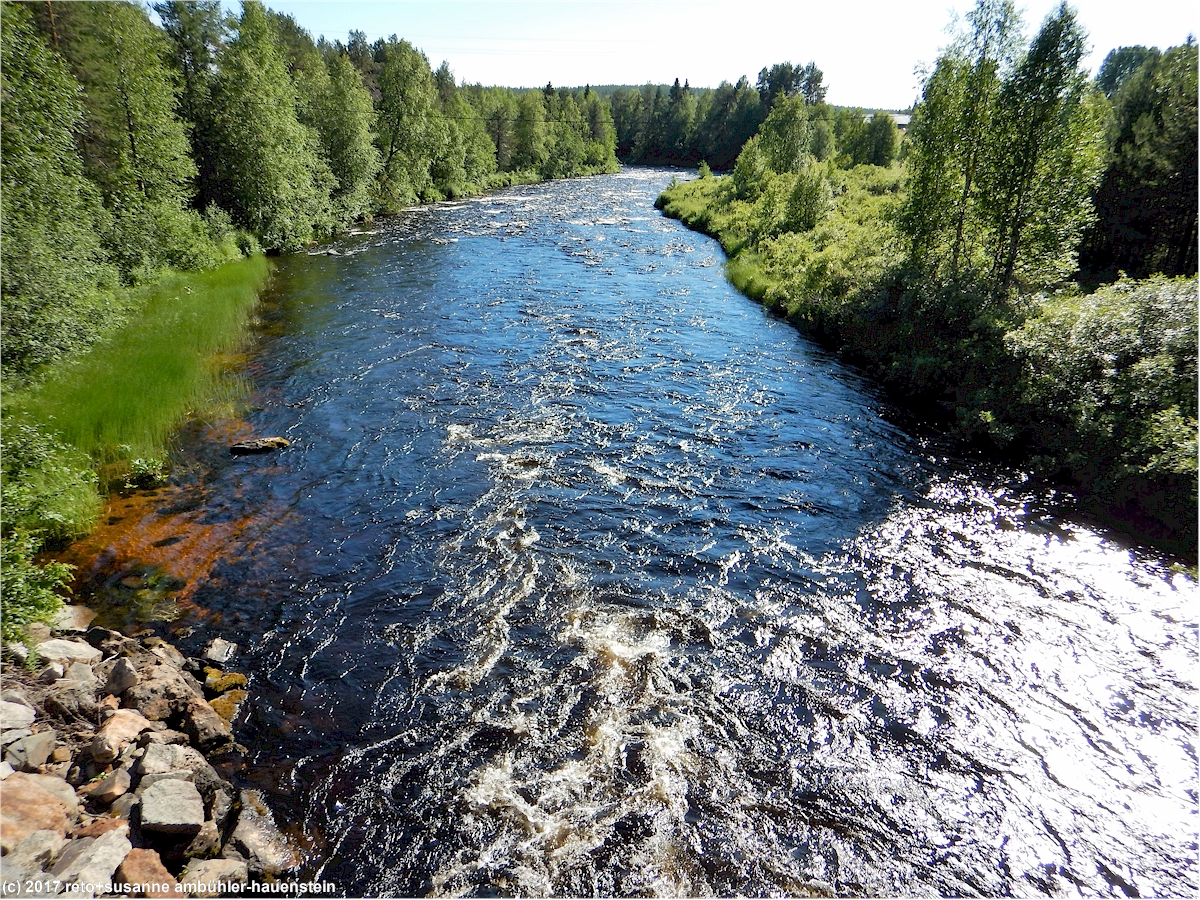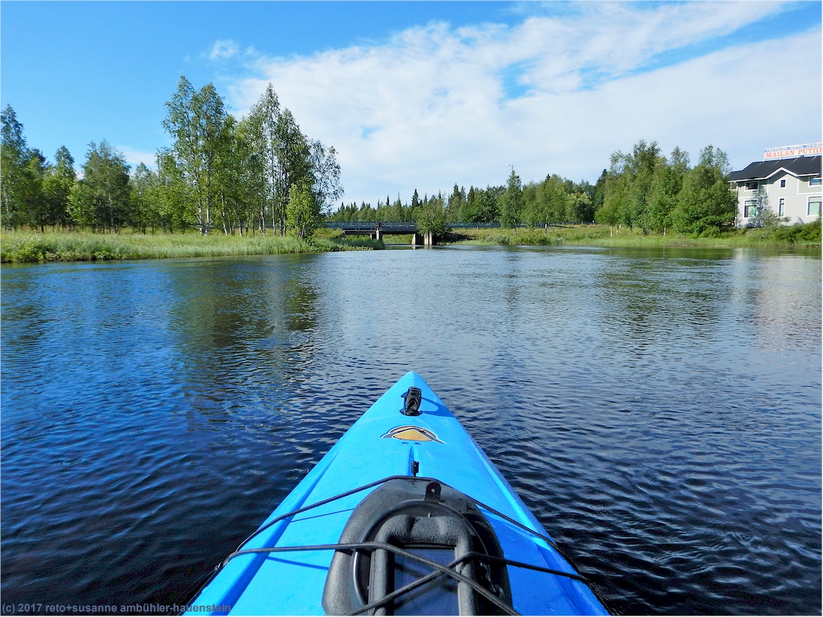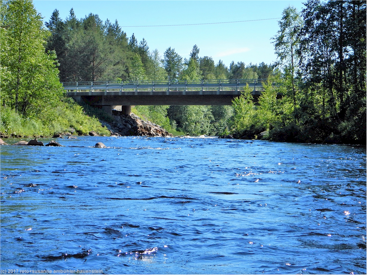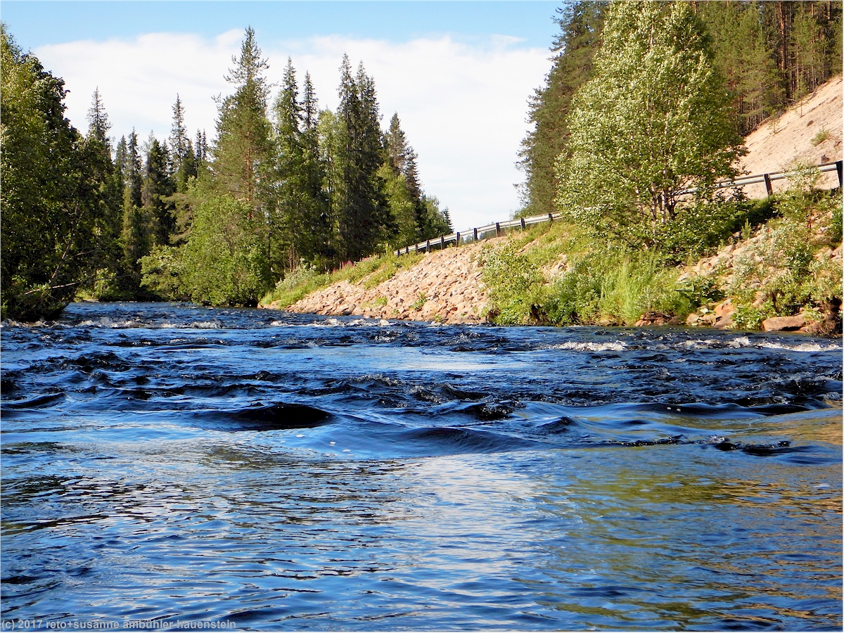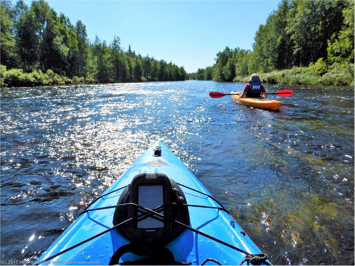 wir paddeln in den fluss hinein und kommen bald an unserem campingplatz vorbei. kurz danach geht es unter der niedrigen strassenbrücke hindurch, anschliessend folgt der äkäsjoki mehr oder weniger der strasse nummer 940, auf der wir gestern gekommen sind. es hat deutlich mehr wasser als vor drei jahren, entsprechend ist die strömung etwas stärker, dafür ragen weniger steine aus dem wasser. das hindert mich allerdings nicht daran, mein kajak schon bald auf einen stein zu setzen und zwar so unglücklich, dass ich beinahe kentere. da mein boot gegen die strömung gekippt ist, wird es kräftig gegen den stein gedrückt und es dauert etwas, bis ich das kajak wieder flott gemacht habe. dies bleibt aber der einzige "zwischenfall" auf der ganzen tour. dank dem hohen wasserstand sind auch die mini-stromschnellen etwas grösser. echte wildwasser-kajaker würden diese wellen natürlich gar nicht bemerken, aber für uns sind diese "unebenheiten" genau richtig. in zügiger fahrt geht es flussabwärts. es ist herrlich, so alleine unterwegs zu sein. die wetterbedingungen sind optimal, sonnenschein pur.