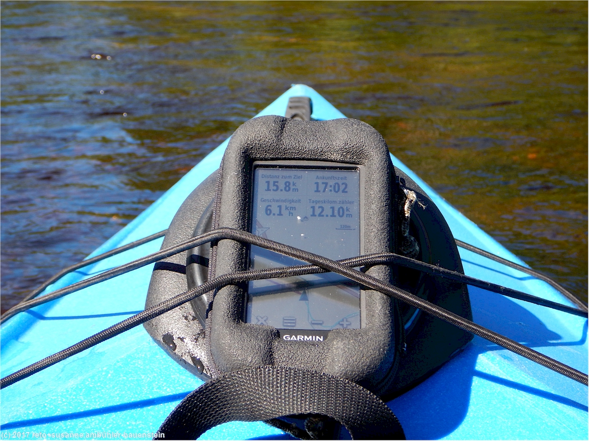 gemietetes flusskajak am ufer des äkäslompolo | GARMIN Montana - mein cockpit auf dem kajak |