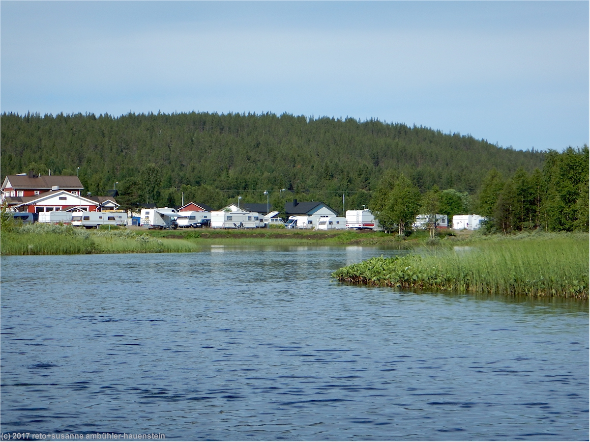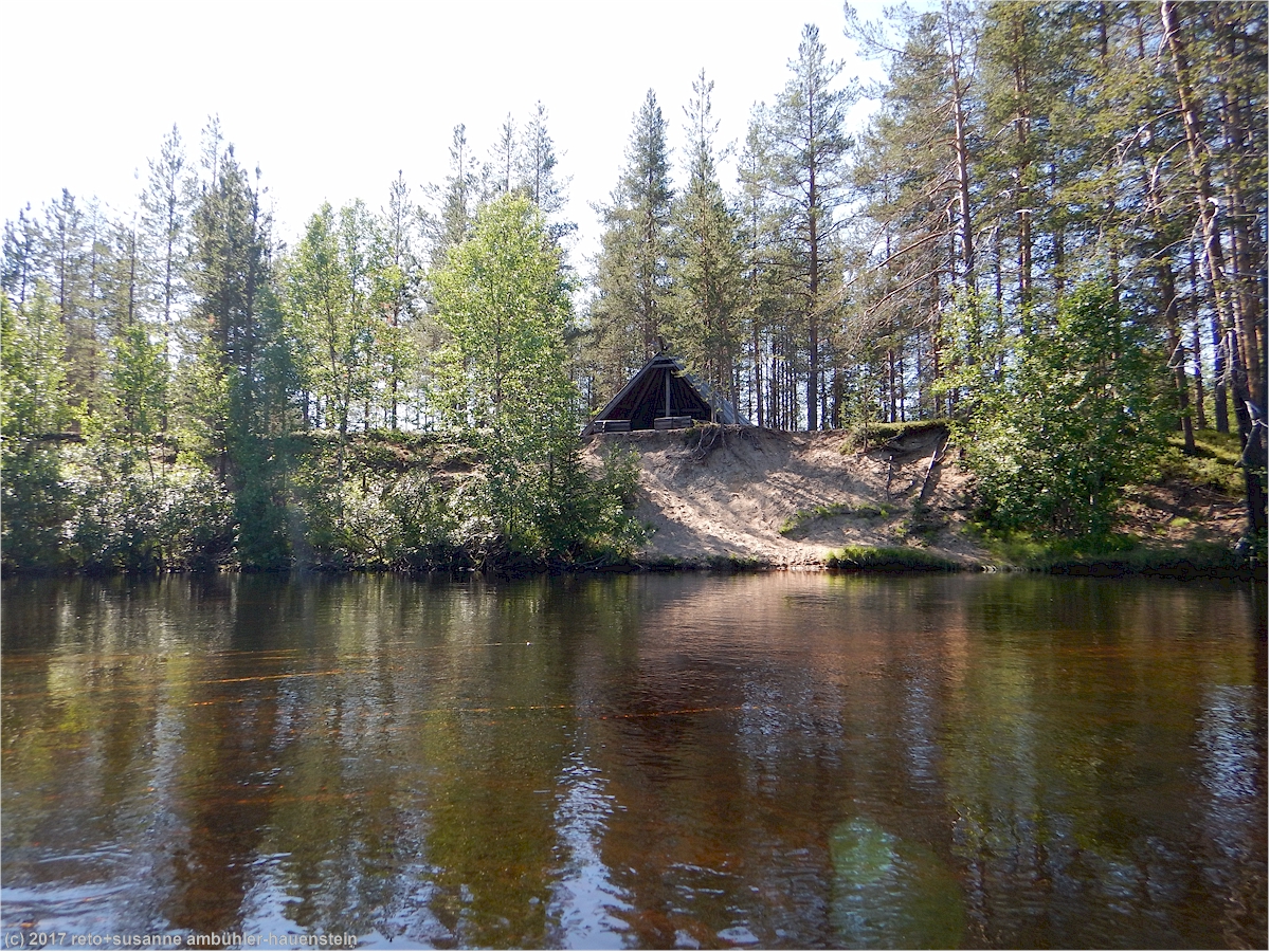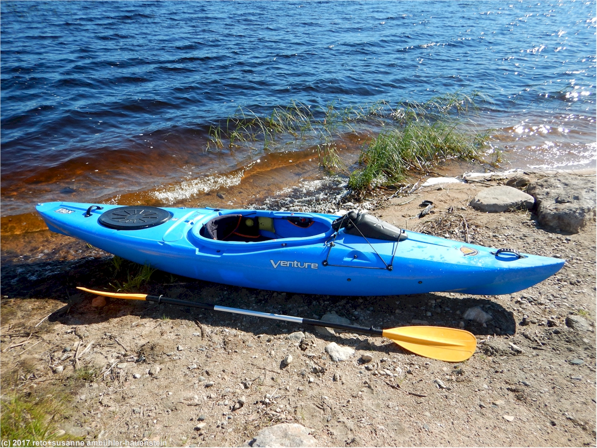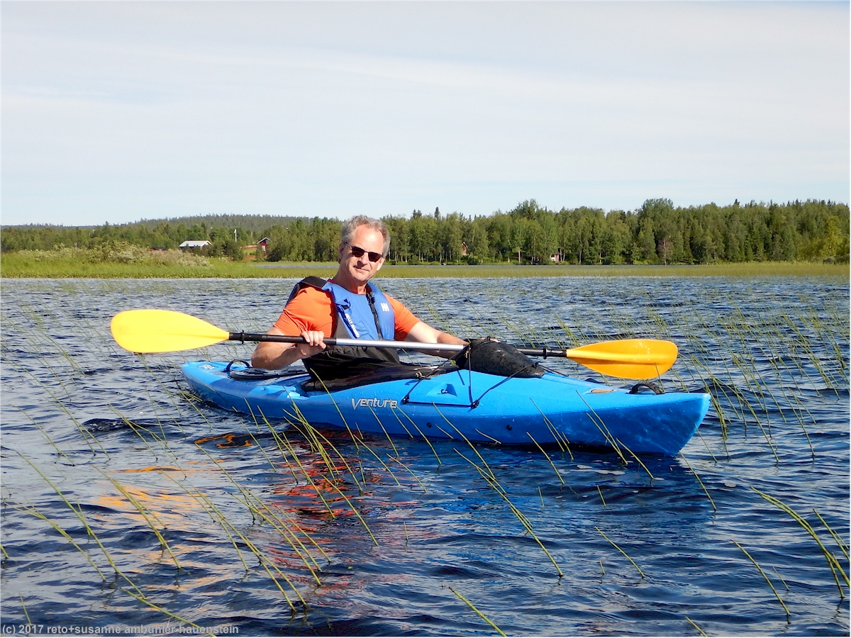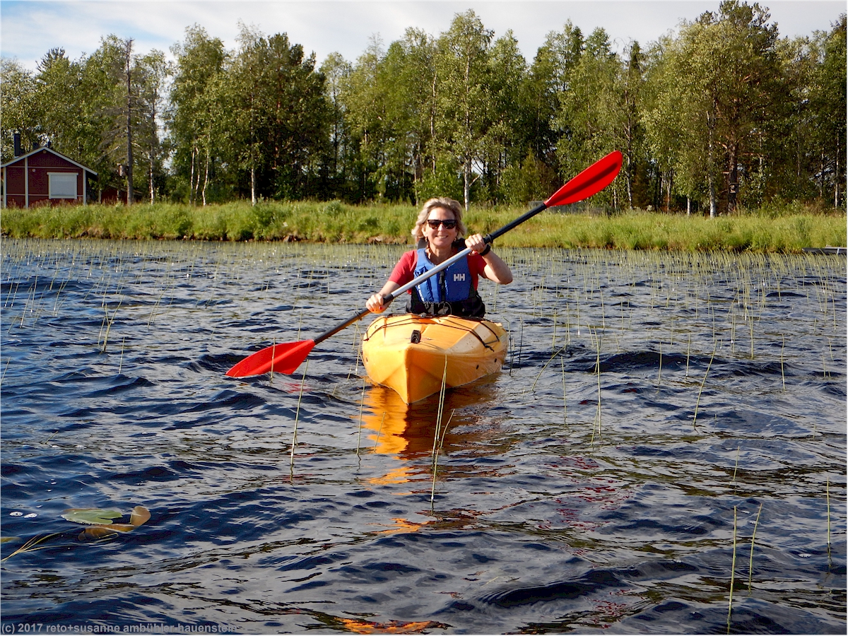 als wir kurz nach 8 uhr frühstücken verdeckt eine dünne nebelschicht die sonne, aber als wir eine stunde später die gemieteten kajaks abholen, ist der himmel fast wolkenlos. wir paddeln in den äkäsjoki hinein und gleiten schon bald an unserem campingplatz vorbei. es hat deutlich mehr wasser als vor drei jahren, trotzdem schaffe ich es, mein kajak auf einen stein zu setzen und beinahe zu kentern. es macht spass, durch die mini-stromschnellen zu paddeln. wir sind zügig unterwegs und erreichen kurz nach 12 uhr die schutzhütte, bei welcher wir schon auf der letzten tour rast gemacht hatten. wir entfachen ein kleines feuer und geniessen unseren picknick. der zweite, längere abschnitt ist deutlich ruhiger, aber deshalb nicht weniger schön. gegen 16:20 uhr erreichen wir die strassenbrücke bei äkäsjoensuu und damit das ziel unserer tour. wir rufen beim verleih an und wenig später bringt uns ein taxi mit bootsanhänger zurück nach äkäslompolo. susanne schläft nach dem abendessen schon bald ein, ich führe noch die bücher nach und schlüpfe gegen 23 uhr ebenfalls unter die bettdecke.