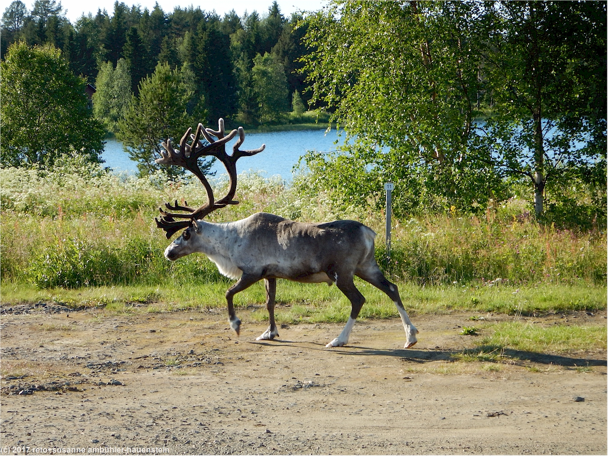 wir ziehen trockene kleider an und schleppen die boote zur strasse. dort warten wir auf das taxi. nach einer weile taucht ein schwarzer van mit bootsanhänger auf. wir laden die beiden kajaks auf, dann fährt uns der freundliche mann zurück nach äkäslompolo. er folgt dabei der strasse, die dem fluss entlang führt. beim bootsverleih geben wir die ausrüstung zurück, anschliessend kaufen wir noch eine erfrischung im supermarkt. wenig später sind wir beim jogi. auch heute trottet ein rentier über den campingplatz - mir scheint, es ist immer das gleich tier, welches hier am abend seine runde macht.
