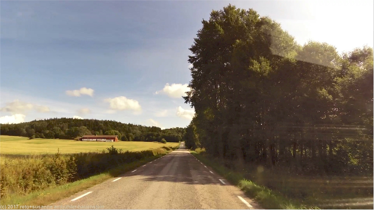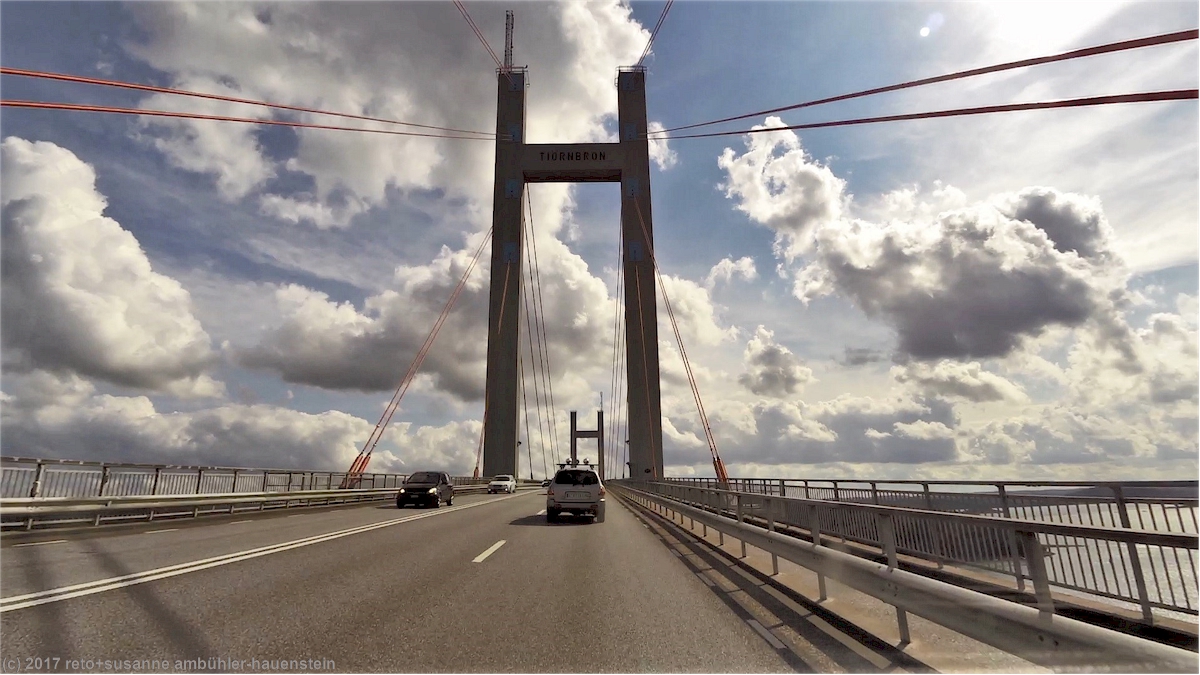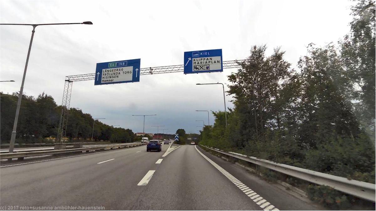 wir geniessen noch einmal ein entspanntes frühstück im freien. der himmel ist fast wolkenlos, als wir lysekil gegen 10:20 uhr verlassen. wir folgen der strasse 162 nur gerade etwa zwei kilometer nordwärts, dann nehmen wir die strasse 161 richtung osten. nach wenigen minuten erreichen wir die fähre über den gullmarn. wie überall in schweden ist die fähre teil des strassennetzes und daher kostenlos. wieder folgen wir der strasse 161 nur knapp drei kilometer, dann biegen wir auf eine nummernlose nebenstrasse ab. die übrigen autos bleiben alle auf der 161, wir sind daher ziemlich alleine unterwegs. die schmale überlandstrasse führt vorbei an wäldern und bauernhöfen. bei sund gelangen wir auf die strasse 160, auf dieser geht es südwärts. wir folgen erst dem ufer des halsefjorden, dann geht es quer durch die insel orust. es sind nun deutlich mehr autos unterwegs. ebenfalls zugenommen hat die anzahl wolken am himmel, trotzdem ist es immer noch vorwiegend sonnig. zwischen myggenäs und stenungsund überspannt die mächtige hängebrücke tjörnbron den askeröfjorden. wenig später gelangen wir bei dyretorp auf die autobahn E6.