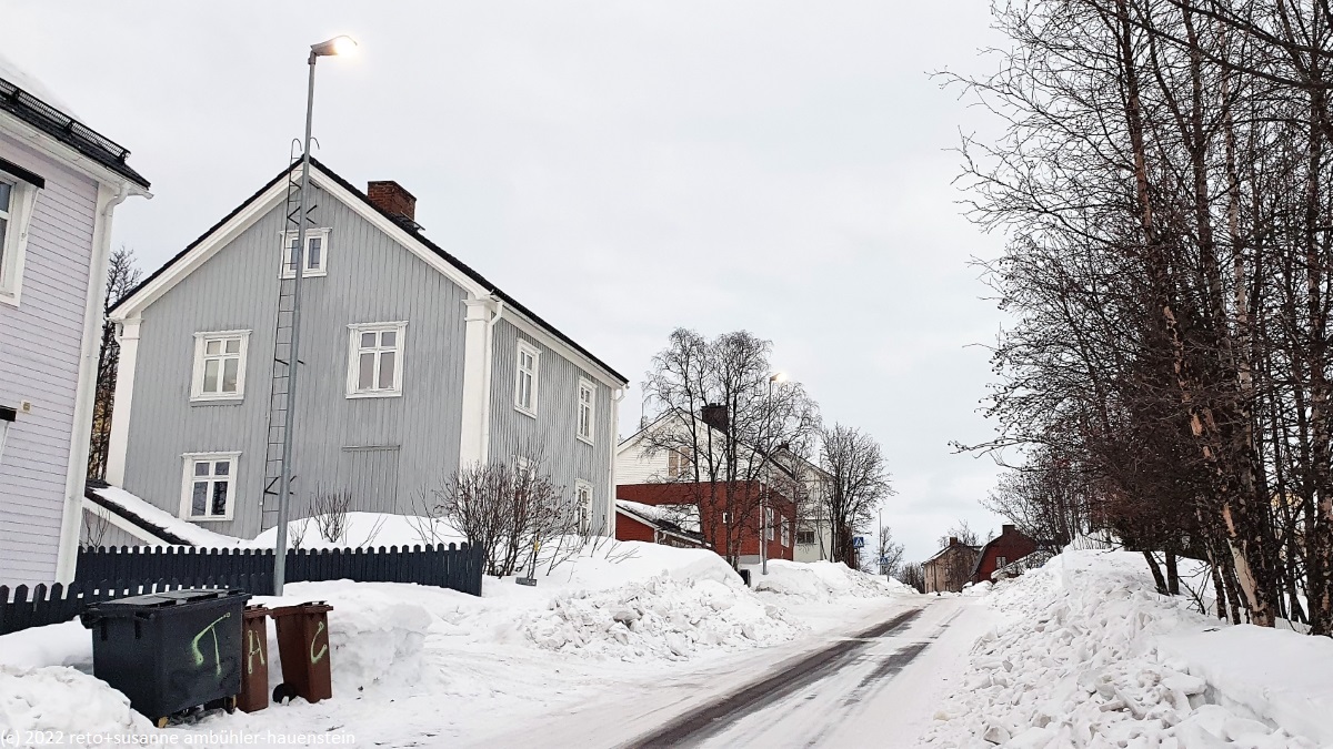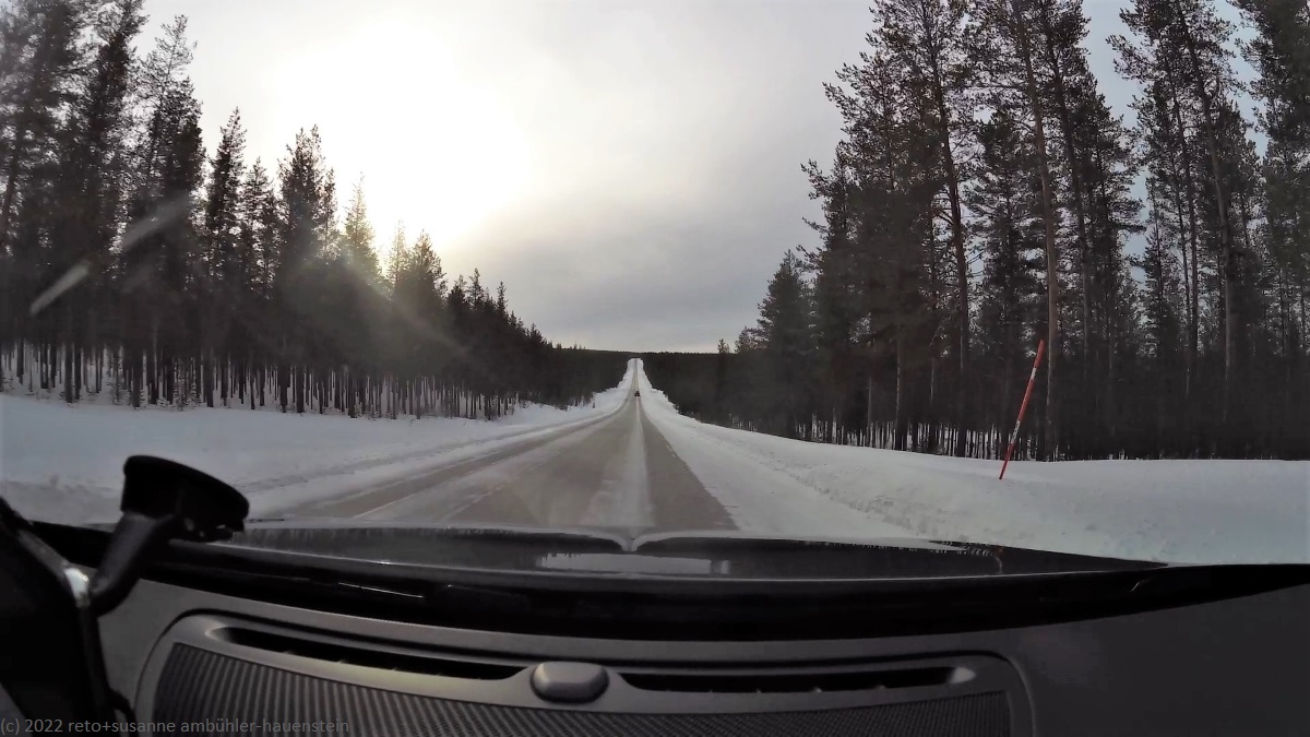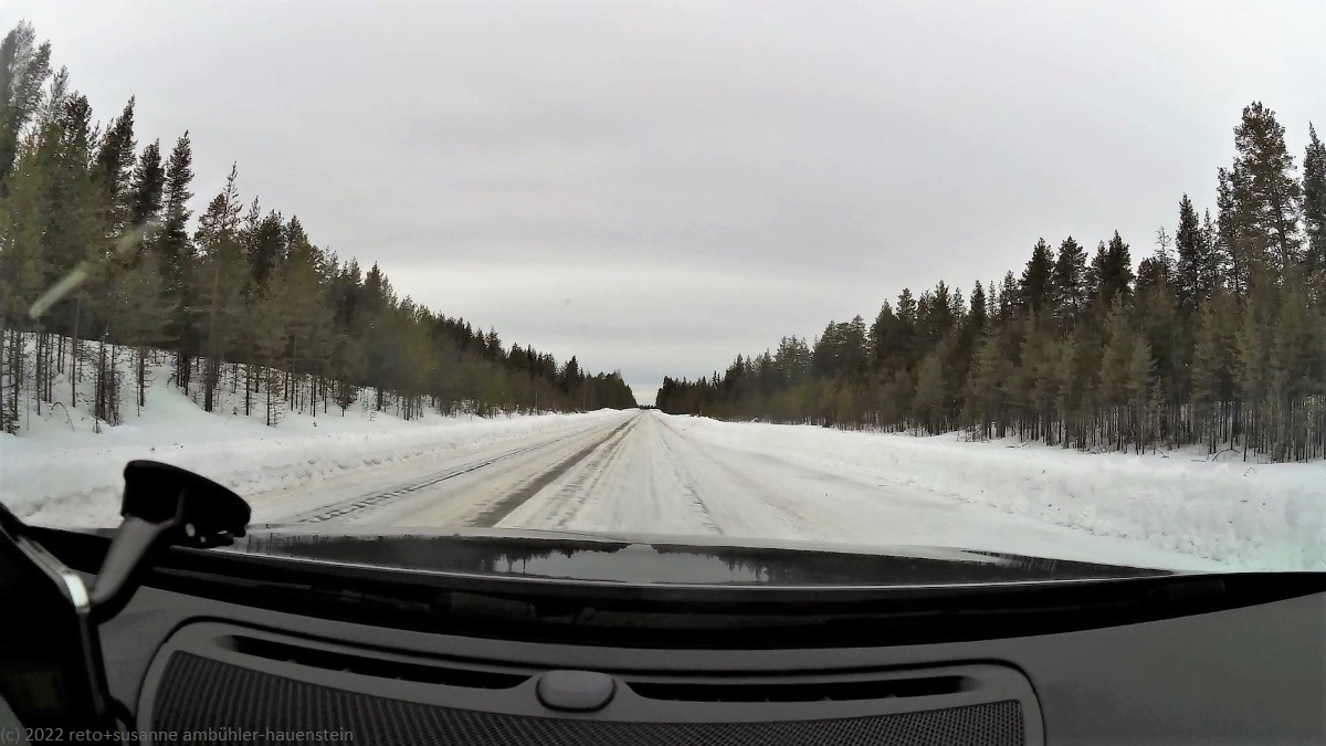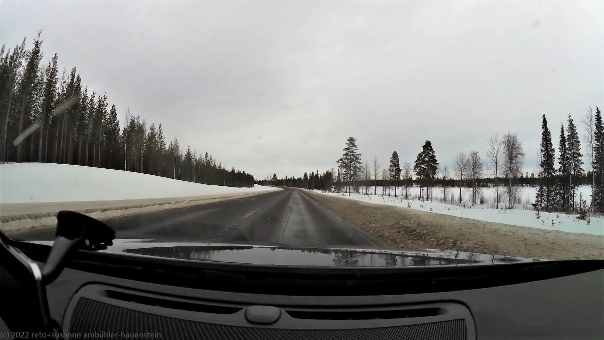 unser handy weckt uns um 8 uhr. heute ist das wetter etwas freundlicher mit leichtem sonnenschein. nach dem frühstück verstauen wir unser gepäck im auto. wir bringen die schlüssel für das haus zurück, tanken unseren wagen auf und kaufen eine kleinigkeit im supermarkt. dann nehmen wir den weg nach kiruna unter die räder. bald haben wir freie fahrt auf der strasse 940 richtung kolari. im gegensatz zum vergangenen sommer ist die brücke über den äkäsjoki offen. um 10:46 uhr überqueren wir den muonionjoki bzw. muonioälven und damit die grenze zwischen finnland und schweden. dies bedeutet auch, dass wir die uhren wieder eine stunde zurückstellen dürfen. die fahrt verläuft äusserst flüssig, die strasse ist im gegensatz zum hinweg nur anfangs schneebedeckt, danach ist sie weitgehend aper. die ränder sind leider gar nicht mehr schön weiss, sondern ziemlich hässlich braun gefärbt. die temperatur liegt einige grad über null und es fallen vorübergehend sogar einige regentropfen. kurz nach mittag sind wir in kiruna.
