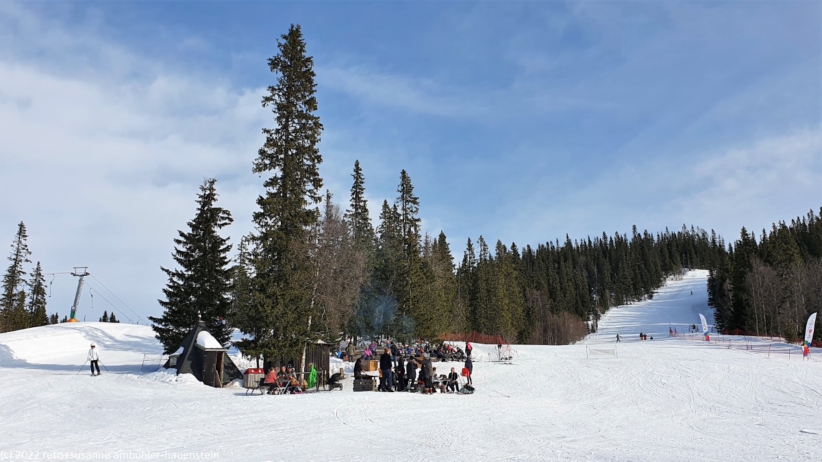 gerade bei der schutzhütte geht eine loipe weg, die nicht zur rundstrecke gehört und zu einem ein kilometer entfernten gasthaus führt. auf empfehlung eines freundlichen ehepaars entscheiden wir uns, denn abstecher zu machen und erreichen wenig später das bergrestaurant fröå auf 550 meter über meer. da das gasthaus auch mit dem auto erreicht werden kann, ist es gut besucht. wir finden aber einen freien tisch und geniessen kaffee, gebäck und die fantastische aussicht. nach einer halben stunde brechen wir wieder auf. der rückweg zur schutzhütte beginnt mit einer spektakulären abfahrt. ab der schutzhütte setzen wir unsere runde fort. gegen 16:20 uhr sind wir wieder in björnen.