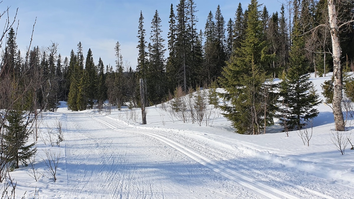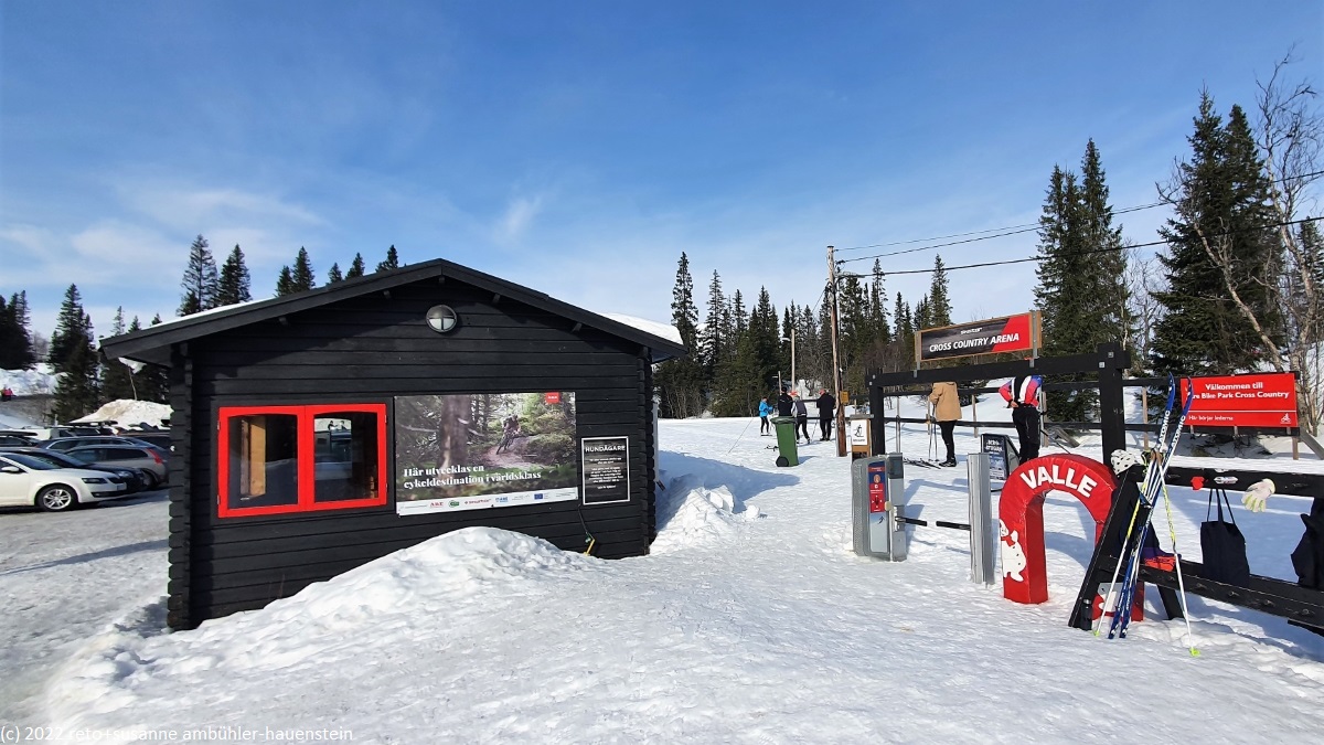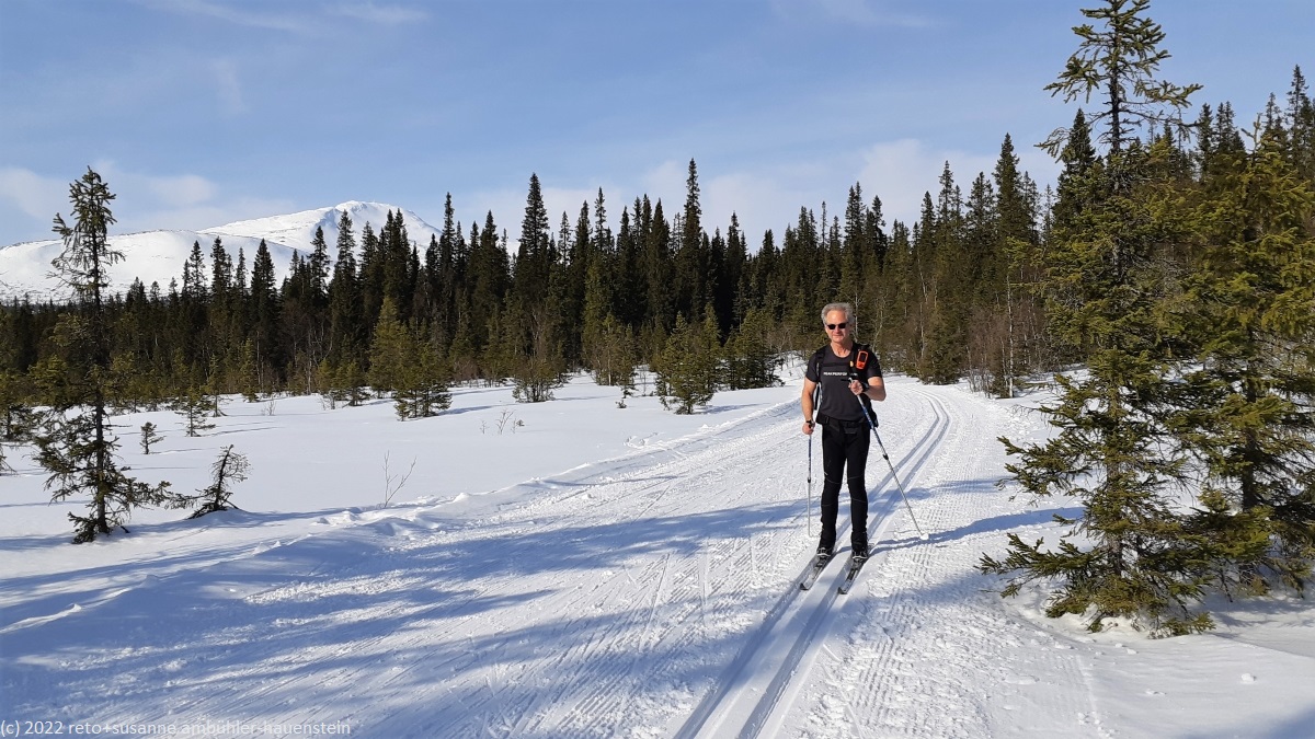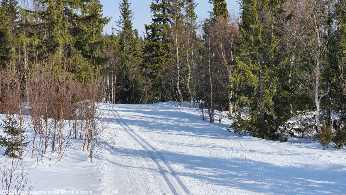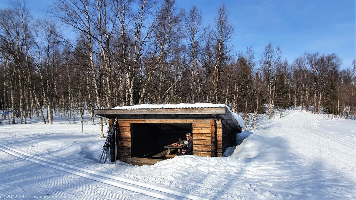 wir schlafen bis 8:30 uhr - nach der kurzen nacht von gestern eine wohltat. zu unserer erleichterung war die nacht äusserst ruhig. wir hatten etwas befürchtet, dass in diesem haus möglicherweise parties abgehen, aber das scheint völlig unbegründet. während wir frühstücken, blicken wir auf den åreskutan mit der grossen seilbahn und einen blauen, leicht bewölkten himmel. das thermometer am fenster zeigt bereits +3°C, hier herrschen definitiv andere temperaturen als in lappland. im åre sport shop mieten wir für zwei tage langlauf-ausrüstungen und fahren um 11 uhr mit dem bus nach björnen. dort machen wir uns auf die suche nach der langlaufloipe. nach kleinen anfangsschwierigkeiten finden wir den weg zum startpunkt der rundstrecken. es gibt sechs verschiedene loipen, die länge variert von 1 km bis 15 km. wir entscheiden uns für die längste runde, schliesslich haben wir schon das doppelte geschafft. im gegensatz zu den orten im norden ist die benutzung der loipe hier kostenpflichtig. ich muss mich erst beim skiclub registrieren um das WLAN nutzen zu können, dann eine app installieren um den loipenpass zu kaufen, wofür ich mich ebenfalls registrieren muss. das klappt zwar alles auf anhieb, ist aber doch ein beachtlicher aufwand. endlich haben wir die beiden skipässe und machen uns auf den weg. die spur ist wie üblich bestens präpariert, sowohl für skater als auch für klassiker. die loipe führt durch eine schöne landschaft. manchmal sind wir im wald unterwegs, dann wieder in eher offenem gelände. immer wieder sehen wir den åreskutan. im vergleich zur vorheriger woche ist es mit +8°C ziemlich warm. ich laufe lediglich mit jogginghose und t-shirt, susanne trägt eine schicht kleider mehr. die loipe windet sich durch die landschaft, so dass wir gelegentlich wieder am gleichen ort vorbei kommen, an dem wir schon vorher in anderer richtung unterwegs waren. es ist aber keinesfalls eine langweilige route. es gibt immer wieder kleinere aufstiege und dann wieder leichte abfahrten. kurz nach 14 uhr erreichen wir die einzige schutzhütte an der strecke. sie ist ideal nach süden ausgerichtet, so dass wir trotz niedrigem dach in der sonne zu mittag essen können.