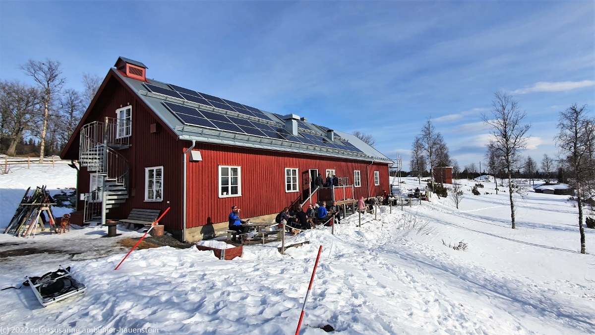 nach der kurzen nacht von gestern schlafen wir bis 8:30 uhr. nach dem frühstück mieten wir langlauf-ausrüstungen und fahren mit dem bus in den nachbarort björnen. bei sonnigem wetter nehmen wir die mit 15 km längste rundstrecke in angriff. vorher müssen wir übers handy zwei loipenpässe kaufen - im gegensatz zu lappland ist die benutzung der loipe nicht kostenlos. aber auch hier sind die spuren hervorragend präpariert und führen durch eine abwechslungsreiche winterlandschaft. immer wieder sehen wir den markanten åreskutan. kurz nach 13 uhr geniessen wir in der einzigen schutzhütte an der strecke unsere brote. anschliessend machen wir einen kurzen abstecher zur bergstuga fröå, dort gibt es kaffee, gebäck und eine fantastische aussicht. vom gasthaus kehren wir zur loipe zurück, danach vollenden wir unsere rundstrecke. mit dem bus geht es zurück nach åre. wir erfrischen uns unter der dusche, gehen noch etwas einkaufen und verbringen dann einen gemütlichen abend in unserem studio.