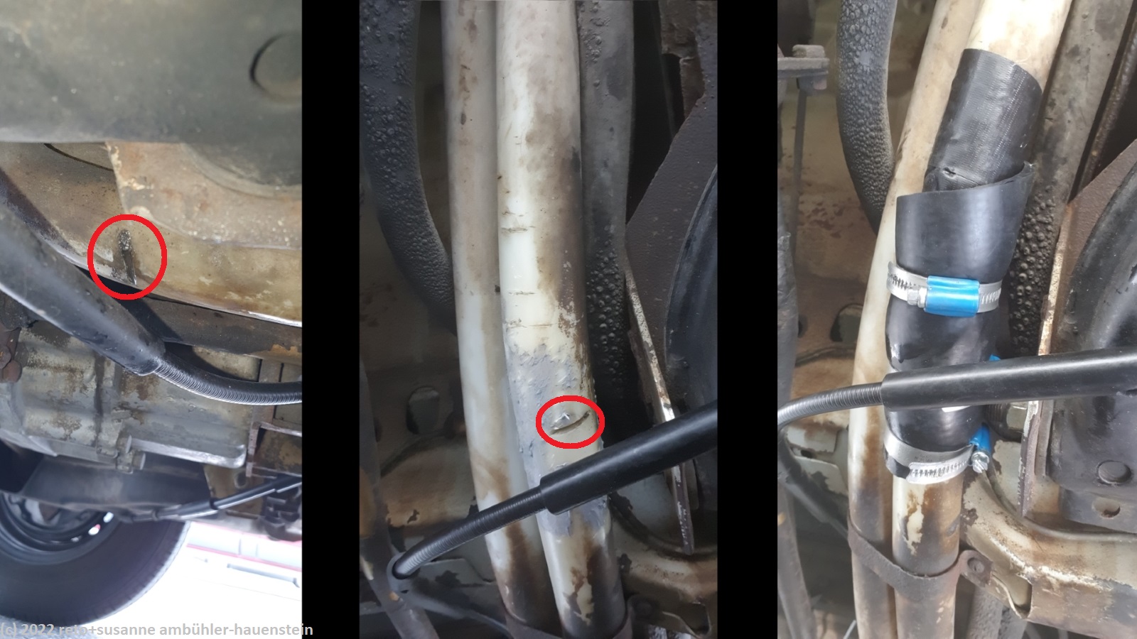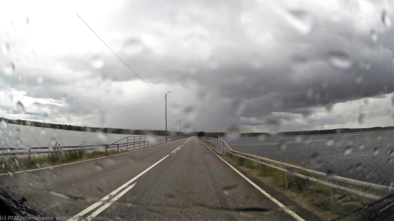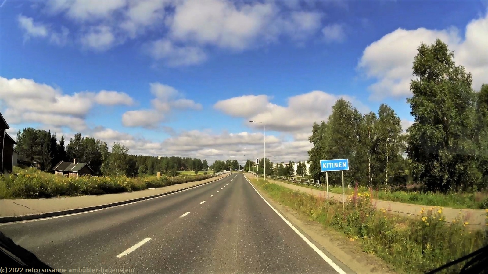 wir schlafen bis 08:30 uhr. in der nacht hat es etwas geregnet, es ist ziemlich kühl. nach dem frühstück fahren wir zur werkstatt von ollis ex-chef. dieser weiss zwar worum es geht, meint aber, sie hätten heute wenig zeit. wir sollen einen kaffee trinken gehen, er würde sich unseren wagen anschauen. unsere skepsis ist berechtigt, als wir nach einer stunde von einem spaziergang entlang des kitinen zurück sind, steht unser jogi immer noch vor der werkstatt. wieder heisst es, es sei zeitlich schwierig heute, sie hätten sehr viel zu tun. aber wir werden den verdacht nicht los, dass sie eher nicht wollen. so kaufen wir im shop der tankstelle extrastarkes klebeband, kühlmittelzusatz sowie briden und beim autozubehör-händler ein stück kühlschlauch plus ein teppichmesser. auf dem nahen parkplatz fahren wir auf die keile und ich versuche die idee der VWbuswerkstatt mit dem schlauch über das kunststoffrohr umzusetzen. beim ersten versuch ist der flick nicht dicht, aber nach dem ich das stück schlauch etwas weiter vorne platziert habe, scheint die stelle dicht zu sein. wir ergänzen das kühlwasser mit dem zusatz und entlüften das kühlsystem. nach einem letzten zögerlichen blick unter unseren wagen machen wir uns auf den weg richtung norden.