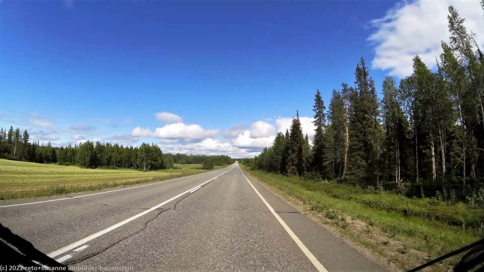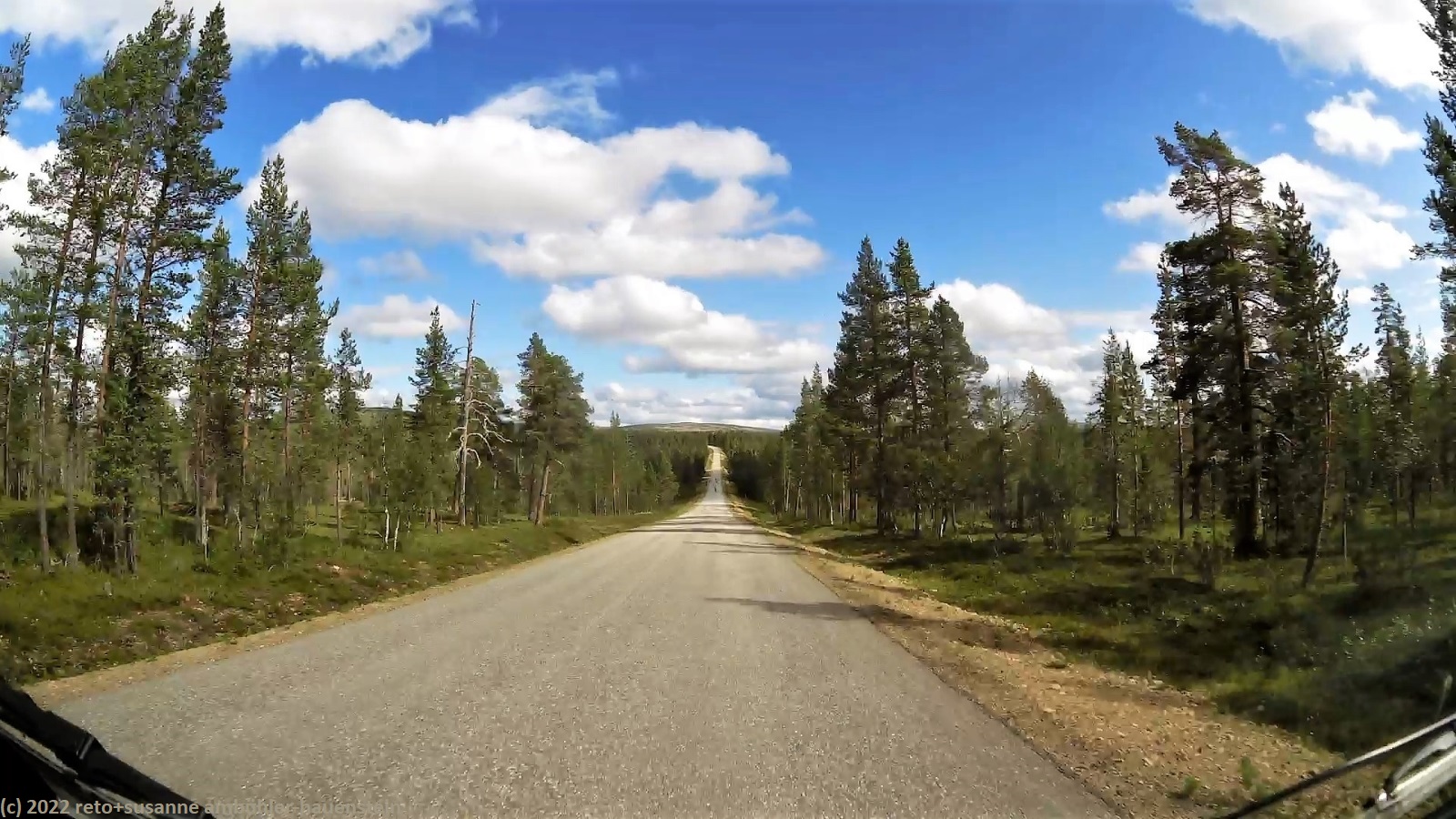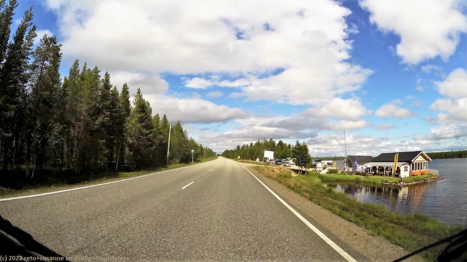 unser ziel ist der urho kekkosen nationalpark bei saariselkä. als wir sodankylä verlassen, geht gerade ein heftiger regenguss nieder, da sind wir gerade noch rechtzeitig fertig geworden mit unserer reparatur. schon bald lässt der regen wieder nach. die fahrt über die strasse 4 ist sehr angenehm. es sind zwar mehr autos unterwegs als gestern, aber wir kommen sehr gut voran. am vajunen hat es direkt am seeufer einen rastplatz. da inzwischen wieder die sonne scheint, picknicken wir hier. im cafe harianna geniessen wir anschliessend kaffee und kuchen. gegen 15:15 uhr setzen wir unsere fahrt fort und erreichen knapp eine stunde später unser tagesziel.