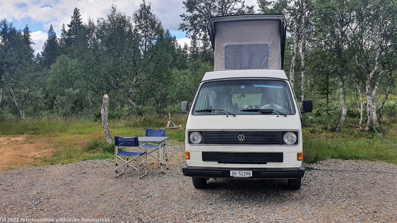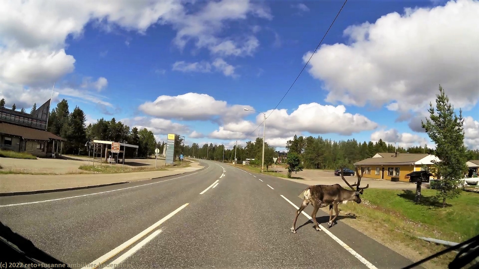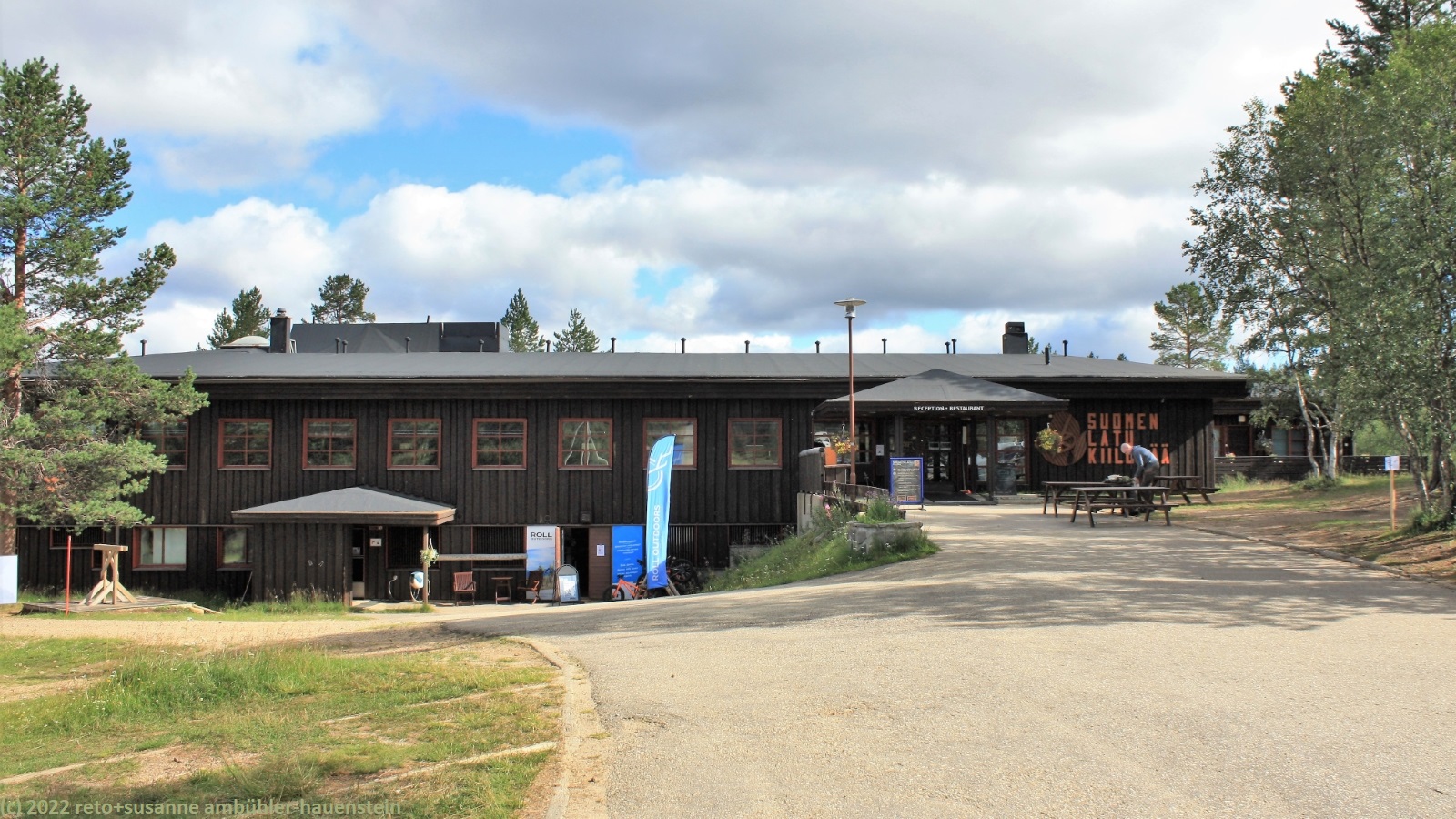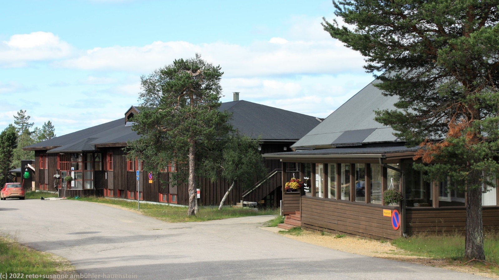 als wir um 8:30 uhr aufstehen ist es ziemlich kühl, in der nacht hatte es geregnet. nach dem frühstück fahren wir zur werkstatt, aber dort kann (oder will) man uns nicht helfen. so kaufen wir extrastarkes klebeband, ein stück wasserschlauch sowie rohrbriden und reparieren unser defektes kühlwasserrohr selber. um 13:45 uhr machen wir uns auf den weg richtung norden. kaum sind wir losgefahren, geht ein kräftiger regenschauer nieder. aber als wir am ufer des vajunen picknicken, scheint schon wieder die sonne. nach einer zwischenfallsfreien fahrt erreichen wir kurz nach 16 uhr unser tagesziel, das besucherzentrum des urho kekkosen nationalpark. auf dem saariselkä camping kiilopää erhalten wir den letzten stellplatz mit stromanschluss. wir geniessen die wunderschöne sauna und setzen uns nach dem nachtessen ins heimelige restaurant des besucherzentrums. gegen 22 uhr sind wir wieder im jogi und wenig später im bett.