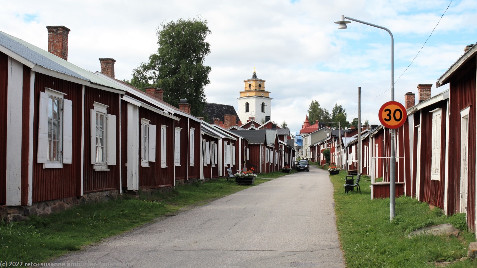 als wir gegen 9 uhr aufstehen ist das wetter freundlich, es ist aber immer noch ziemlich kühl. nach dem frühstück fahren wir zum kajakclub, aber heute ist alles geschlossen. wir besuchen daher gammelstadt luleå. hier gibt es ein freilichtmuseum und eine kirchenstadt bestehend aus vielen kleinen hütten sowie einer stattlichen kirche. im hübschen cafe essen wir zu mittag. auf dem rückweg zum campingplatz kaufen wir lebensmittel und imprägnierungssprays. mit letzteren behandeln wir den stoffbalg unseres busses. danach bauen wir probehalber das zelt für die kommende mehrtageswanderung nochmals auf. dies macht unsere nachbarn aus dem thurgau neugierig und sie laden uns zum kaffee ein. danach packen wir unsere rucksäcke. nach dem nachtessen führen wir die bücher nach und machen einen kurzen spaziergang zum seeufer.
