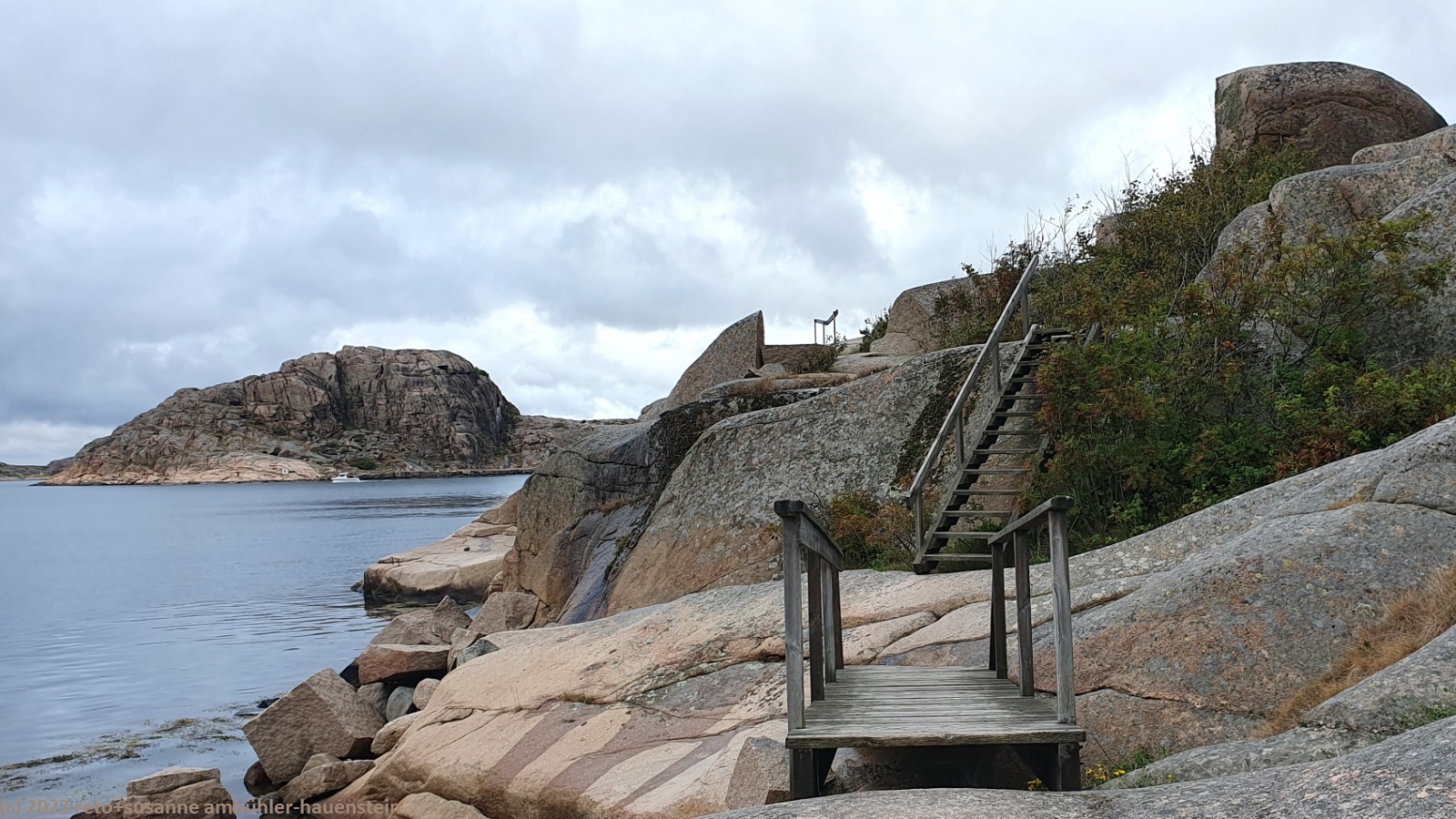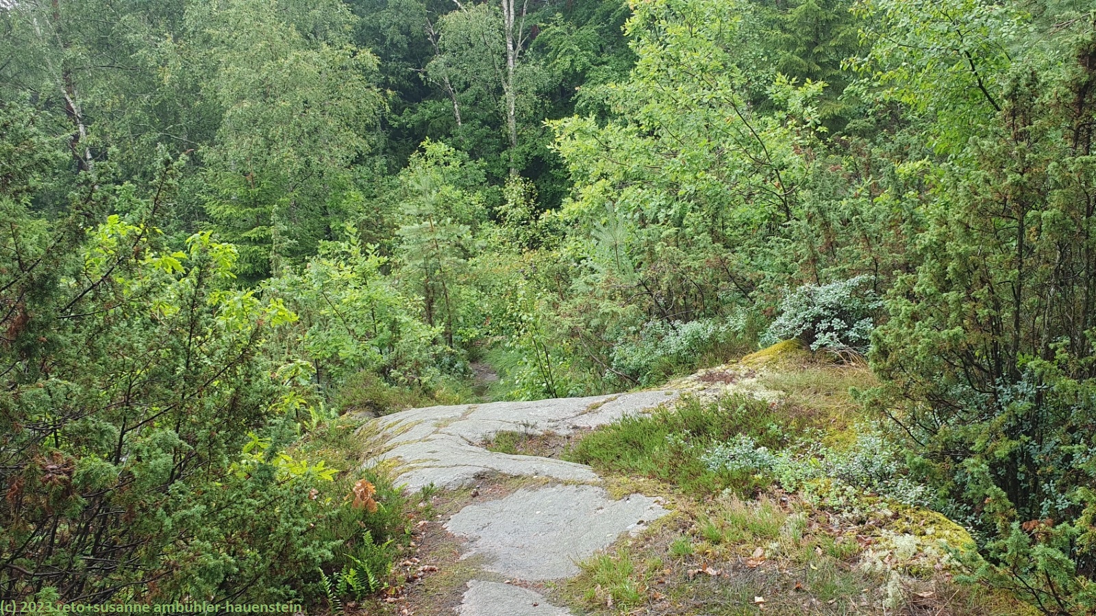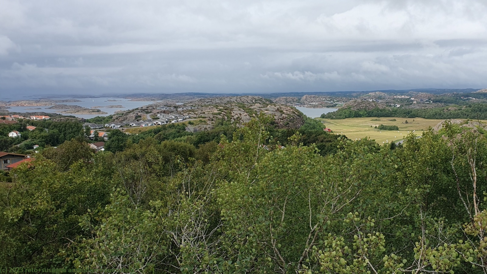 der angekündigte regen hat im lauf der nacht einzug gehalten. wir bleiben daher bis nach 10 uhr im bett. im radio haben sie gemeint, heute sei ein typischer schwedischer sommertag: 15°C und dauerregen. das frühstück geniessen wir bei strömendem regen im jogi. trotz des wetters wollen wir aber nicht den ganzen tag im wagen verbringen. gemäss regenradar müsste das ärgste bis gegen 13 uhr vorüber sein. unsere recherchen ergeben, dass es von hamburgsund nach hunnebostrand einen wanderweg gibt. 14 km wären ideal, aber es ist unklar, ob es eine passende busverbindung für den rückweg gibt. wir wollen deshalb einen teil der strecke als rundwanderung machen. kurz vor 12:30 uhr machen wir uns auf den weg nach hunnebostrand. der von uns gewählte parkplatz direkt an der strasse 174 entpuppt sich als langzeit-parkplatz, das ist schon mal ein guter anfang. wir ziehen regenhosen und regenjacken an, nehmen aber noch je einen regenschirm mit. so trotzen wir dem regen und folgen unserer geplanten route richtung hjälmetorpet. wir gehen über einen breiten weg durch den wald. vermutlich ist dies im winter eine langlaufloipe, denn zum einen hat es beleuchtung und zum anderen farbige markierungen, wie wir sie von unserem letzten winterurlaub in skandinavien kennen. der weg führt durch eine überraschend wilde landschaft. als wir nach 3.5 km die strasse 174 überqueren, hat der regen aufgehört. auf einem schmalen pfad geht es durch einen wilden wald mit kleinen aufstiegen. kurz nach 14 uhr sind wir nahe beim höchsten punkt unserer wanderung. auf einem felswall hat es einen picknicktisch mit fantastischer aussicht auf hunnebostrand, die küste und den skagerrak. da es gerade nicht regnet, essen wir hier zu mittag. nördlich von uns zieht eine regenwand vorbei, bei uns bleibt es aber fast trocken. wenig später scheint sogar die sonne. es wird richtig warm und so ziehen wir die regensachen aus, bevor wir nach einer guten halben stunde unsere rundwanderung fortsetzen.