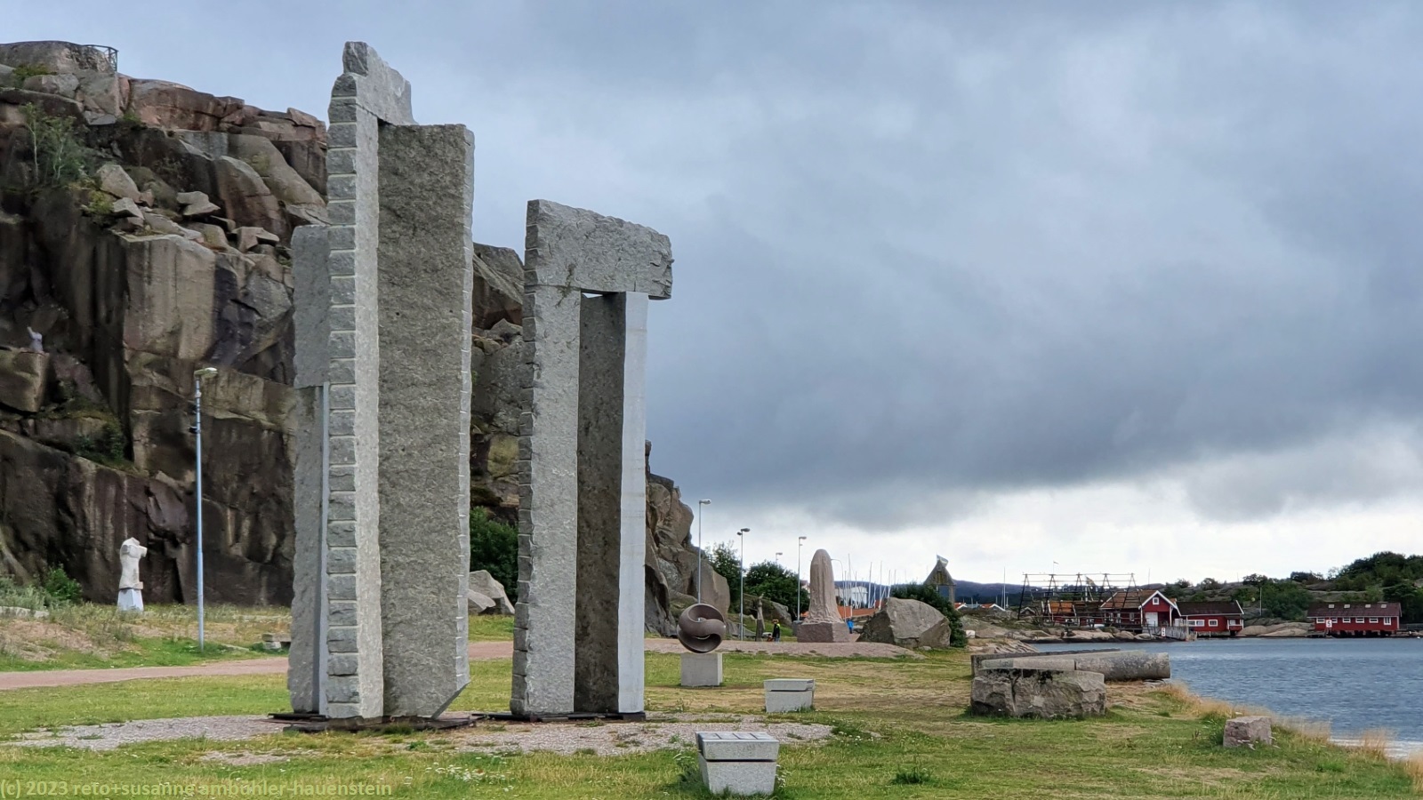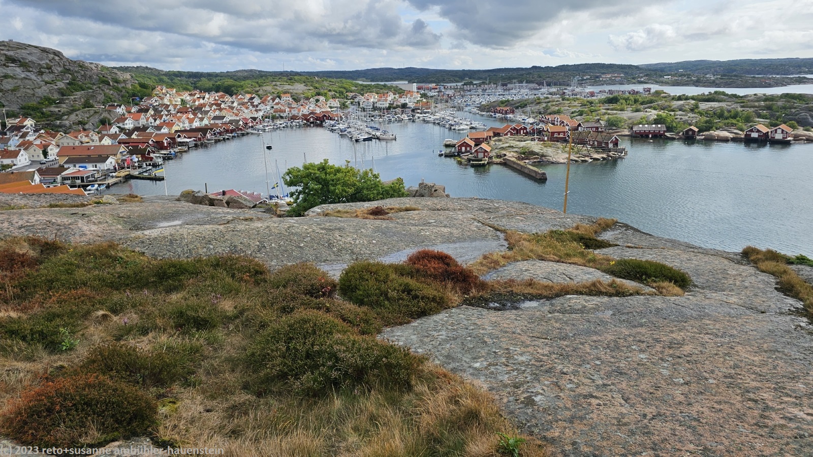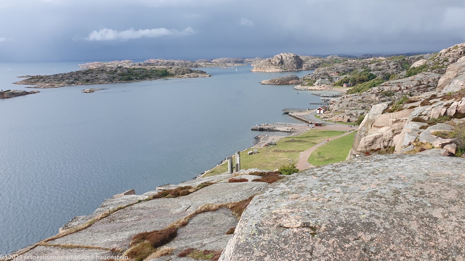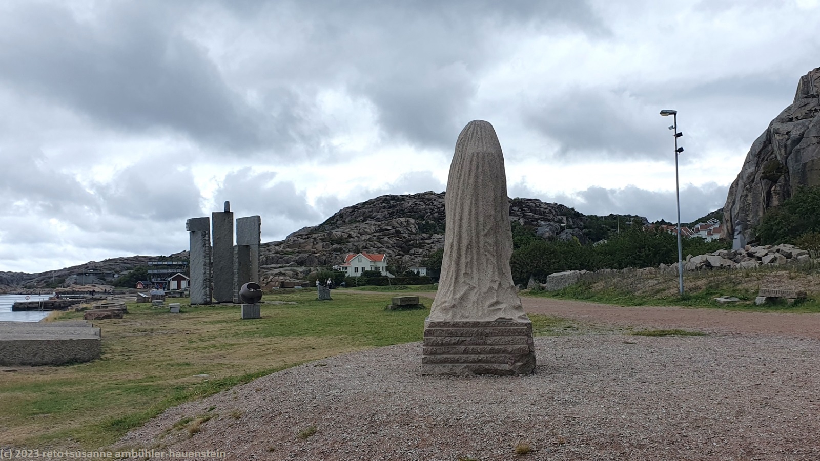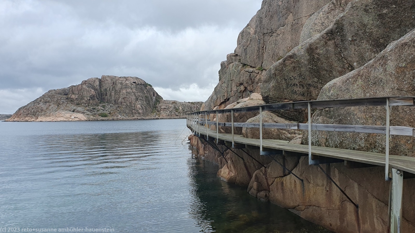im laufe der nacht setzt der angekündigte regen ein. als wir nach 10 uhr aufstehen und frühstücken, giesst es immer noch in strömen. trotzdem wollen wir nicht den ganzen tag im jogi verbringen und fahren gegen 13 uhr nach hunnebostrand, um dort eine rundwanderung zu machen. mit regenjacken und -hosen trotzen wir dem kräftigen niederschlag. der wanderweg führt durch einen erstaunlich wilden wald. gegen 13:50 uhr hört es eher überraschend auf zu regnen, so dass wir beim picknickplatz oberhalb der ortschaft im freien unsere sandwiches und die fantastische aussicht geniessen können. danach geht es an hübschen häusern vorbei zur küste hinunter. ein spektakulärer steg führt dem wasser entlang, danach kommen wir an einer wiese mit verschiedenen kunstwerken vorbei. im ort erfrischen wir uns mit kaffee und kuchen, danach erklimmen wir den nordre hoge berg, vom aussichtspunkt haben wir einen fantastischen ausblick auf das dorf, die küste und das wasser. zurück auf dem campingplatz geniessen wir das nachtessen in der abendsonne.