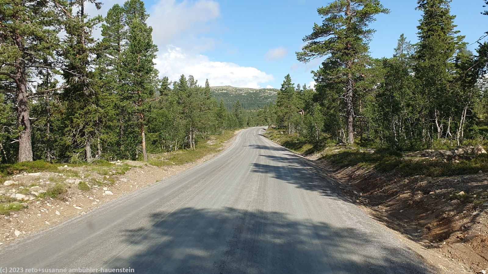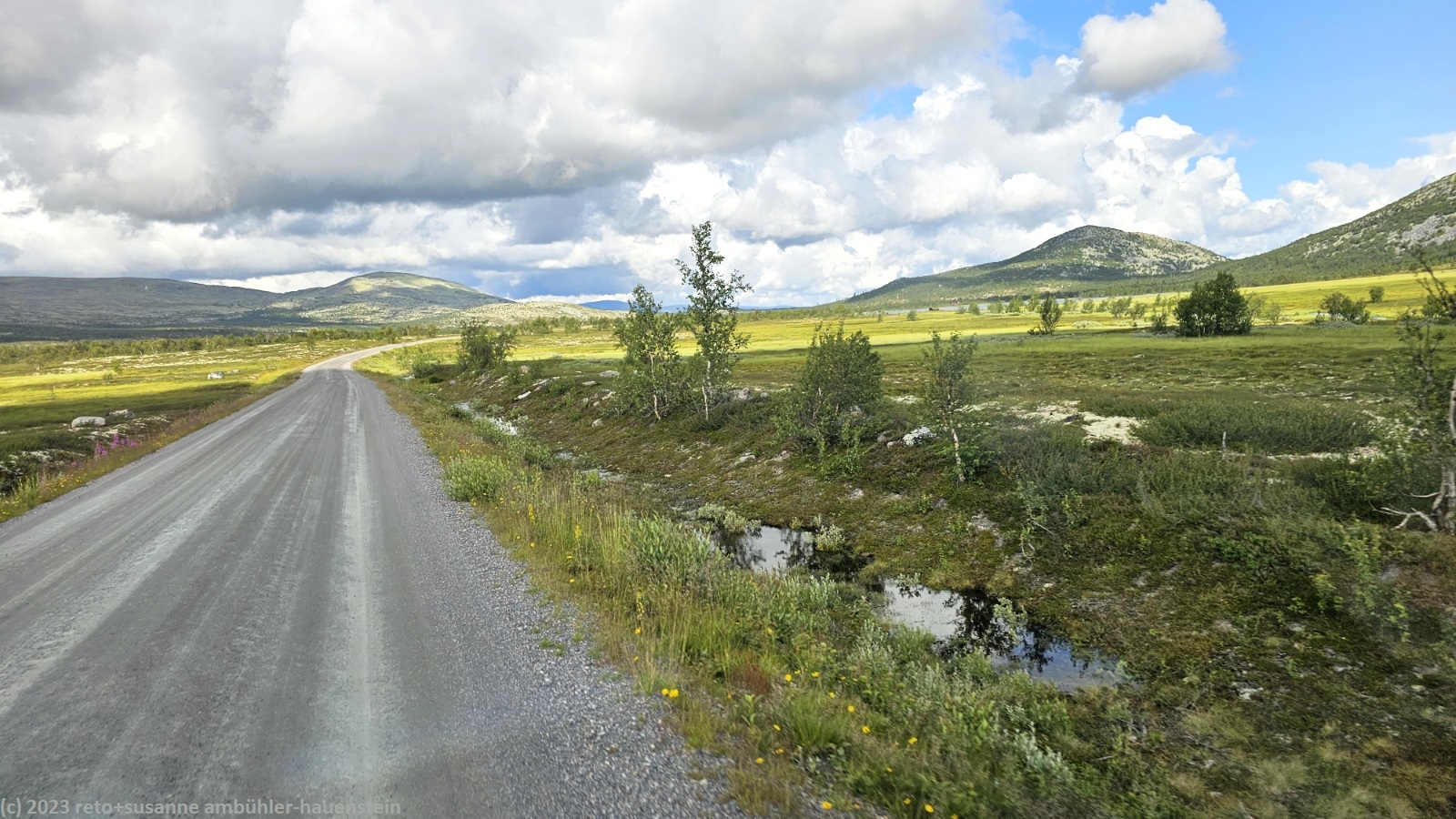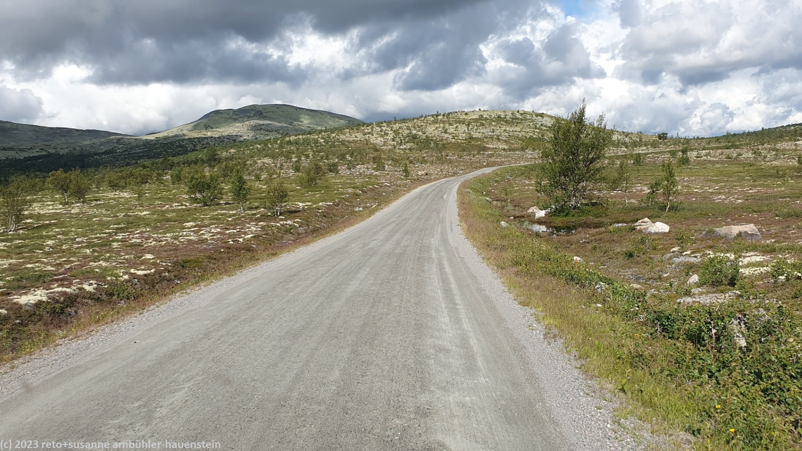 wir erwachen auch heute um 8:15 uhr. das wetter ist freundlich, auch wenn es recht kühl ist. um im freien zu frühstücken reicht es allemal. um 10 uhr sind wir startbereit. susanne hat eine unbefestigte strasse gefunden, die einen durch das norwegische hochland führt. der vinjevegen ist eine mautpflichtige strasse, welche von einer privaten organisation unterhalten wird. im winter wird die strasse offenbar gepflügt, damit man die häuser und langlaufloipen auf dem fjäll erreichen kann. die strasse steigt von 300 auf 950 meter über meer. anfangs fahren wir durch einen schönen wald, ab 900 m.ü.m befinden wir uns über der baumgrenze und haben eine tolle fernsicht über die wunderschöne hochebene. bei uns wechseln sonne und wolkige phasen, vor uns muss es kräftig regnen, denn wir sehen einen schönen regenbogen. kurz nach 11 uhr erreichen wir das ende des vinjevegen bei kletten. das war ein fantastisches erlebnis, insbesondere, da kein einziges fahrzeug in unsere richtung unterwegs war und wir so freie sicht und freie fahrt genossen.
