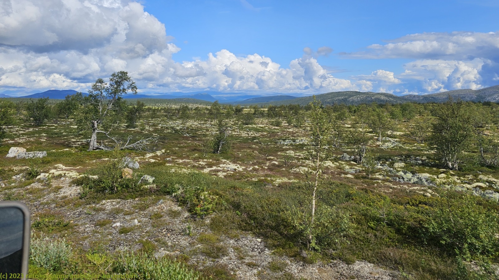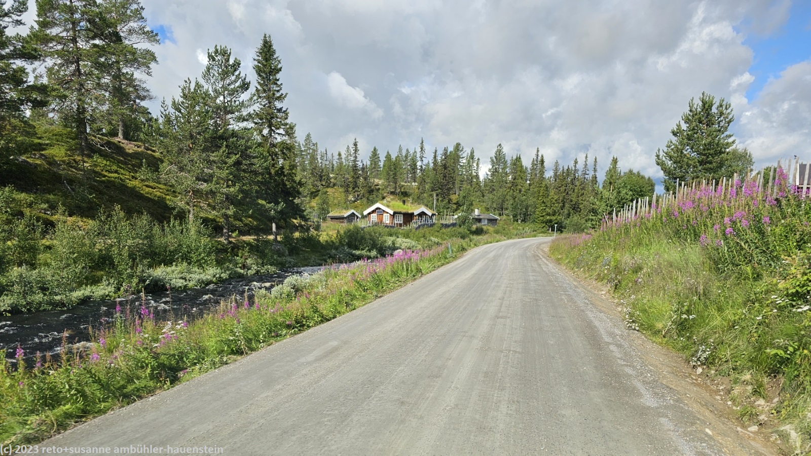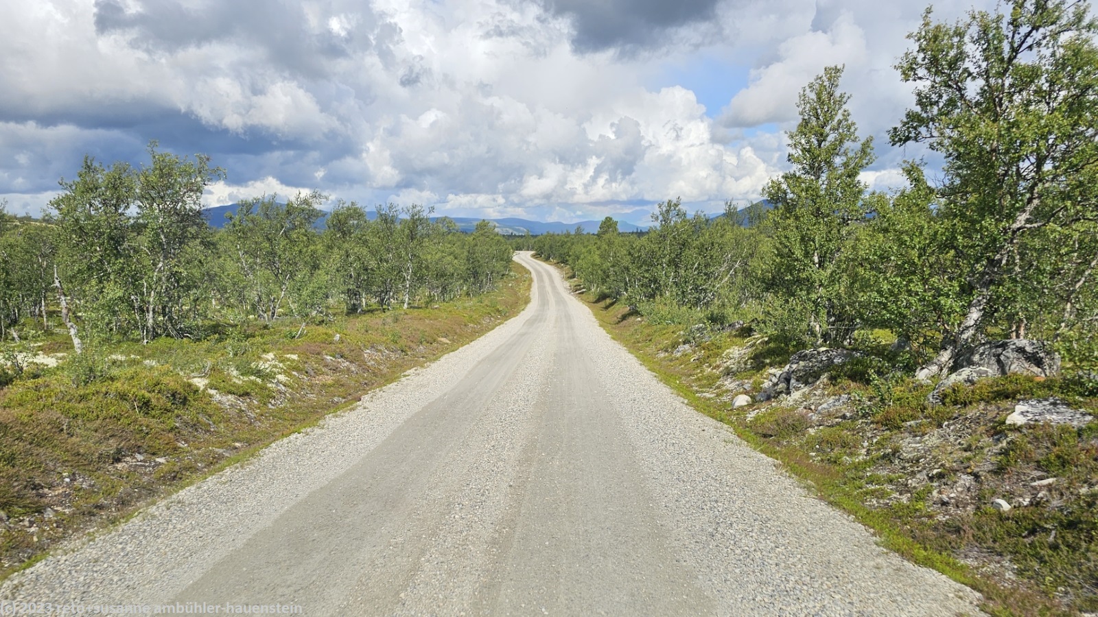 wir erwachen auch heute um 8:15 uhr. das wetter ist freundlich, auch wenn es recht kühl ist. um im freien zu frühstücken reicht es allemal. um 10 uhr sind wir startbereit. susanne hat eine unbefestigte strasse gefunden, die einen durch das norwegische hochland führt. der vinjevegen ist eine mautpflichtige strasse, welche von einer privaten organisation unterhalten wird. im winter wird die strasse offenbar gepflügt, damit man die häuser und langlaufloipen auf dem fjäll erreichen kann. die strasse steigt von 300 auf 950 meter über meer. anfangs fahren wir durch einen schönen wald, ab 900 m.ü.m befinden wir uns über der baumgrenze und haben eine tolle fernsicht über die wunderschöne hochebene. bei uns wechseln sonne und wolkige phasen, vor uns muss es kräftig regnen, denn wir sehen einen schönen regenbogen. kurz nach 11 uhr erreichen wir das ende des vinjevegen bei kletten. das war ein fantastisches erlebnis, insbesondere, da kein einziges fahrzeug in unsere richtung unterwegs war und wir so freie sicht und freie fahrt genossen.