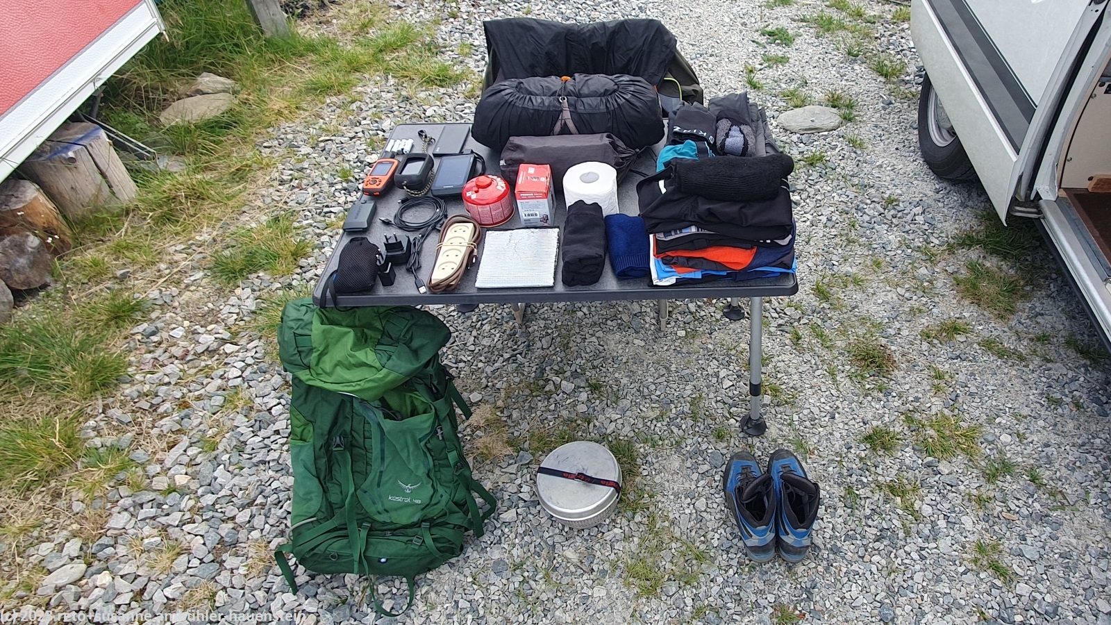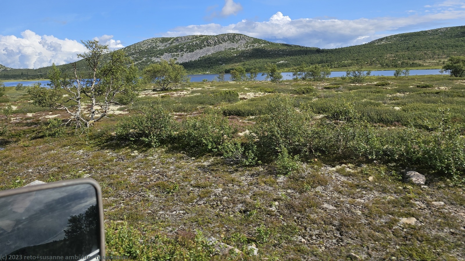 nach dem frühstück nehmen wir den vinjevegen unter die räder, eine mautpflichtige, unbefestigte strasse durch das norwegische hochland. wir haben eine fantastische aussicht auf die hochebene und die umliegende landschaft. danach fahren wir bei wechselhaftem wetter nach røros, wo wir in der hübschen altstadt etwas essen. anschliessend geht es weiter ostwärts und wir erreichen kurz nach der landesgrenze zwischen norwegen und schweden unser tagesziel fjällnäs. nach einem kurzen spaziergang und einer kleinen erfrischung im wunderschönen hotel fjällnäs kehren wir zum campingplatz zurück und beginnen unsere rucksäcke für die bevorstehende mehrtageswanderung zu packen. trotz der vielen kleinen und ziemlich lästigen mücken essen wir im freien. den abend verbringen wir im wagen.