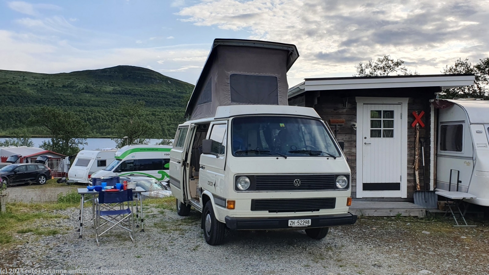 anschliessend geniessen wir das nachtessen im freien, wobei es ziemlich viele kleine, lästige mücken hat. als wir den kaffee trinken, beginnt es zu regnen und wir setzen uns in den wagen. nach dem abwaschen liest susanne, ich führe die bücher nach. gegen 23:30 uhr schlüpfen wir unter die bettdecke. da es um 23 uhr noch so hell ist, dass man ohne licht lesen kann, sind wir jeden abend überrascht, wie spät es schon ist, es fühlt sich überhaupt nicht so an.