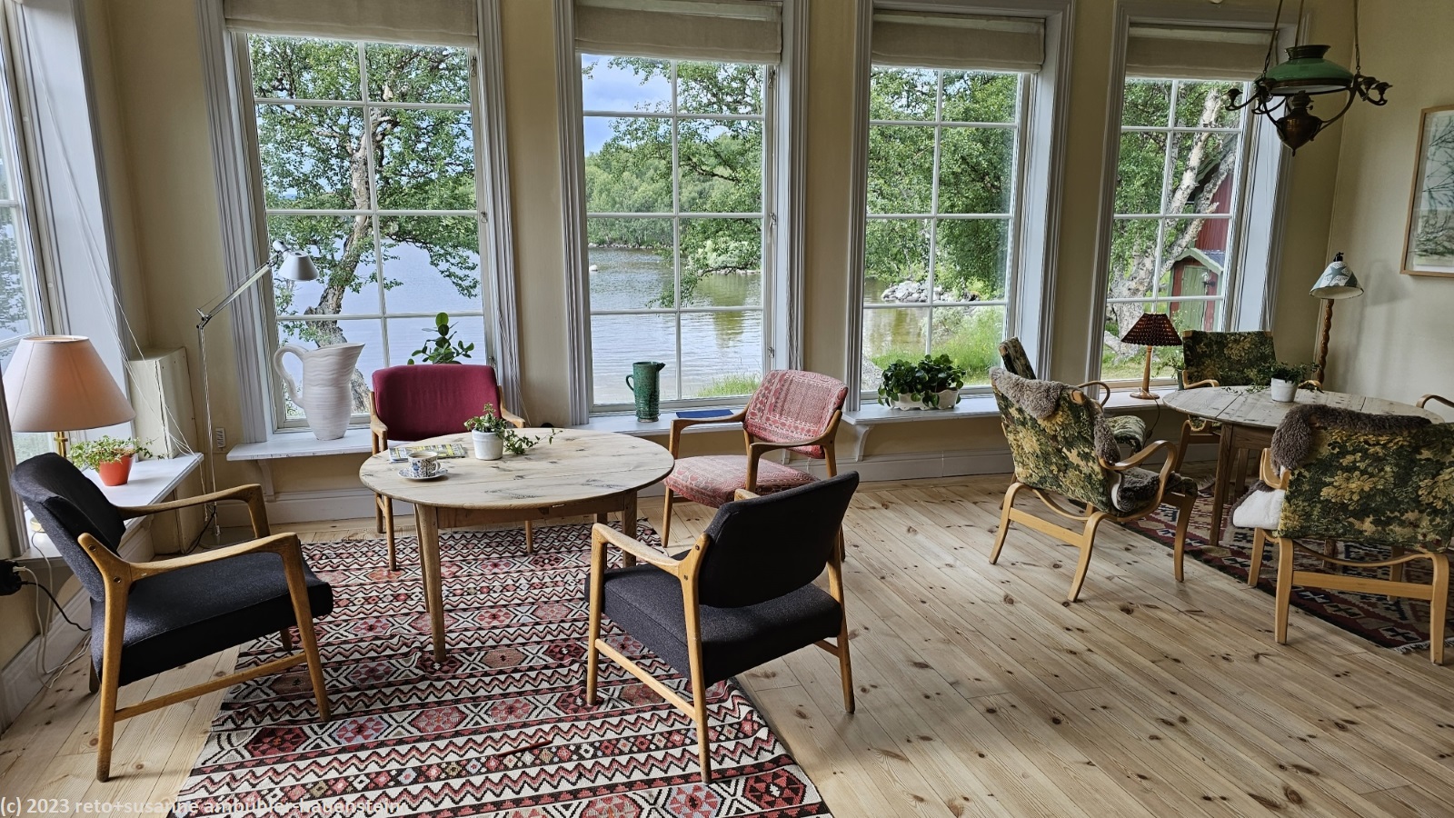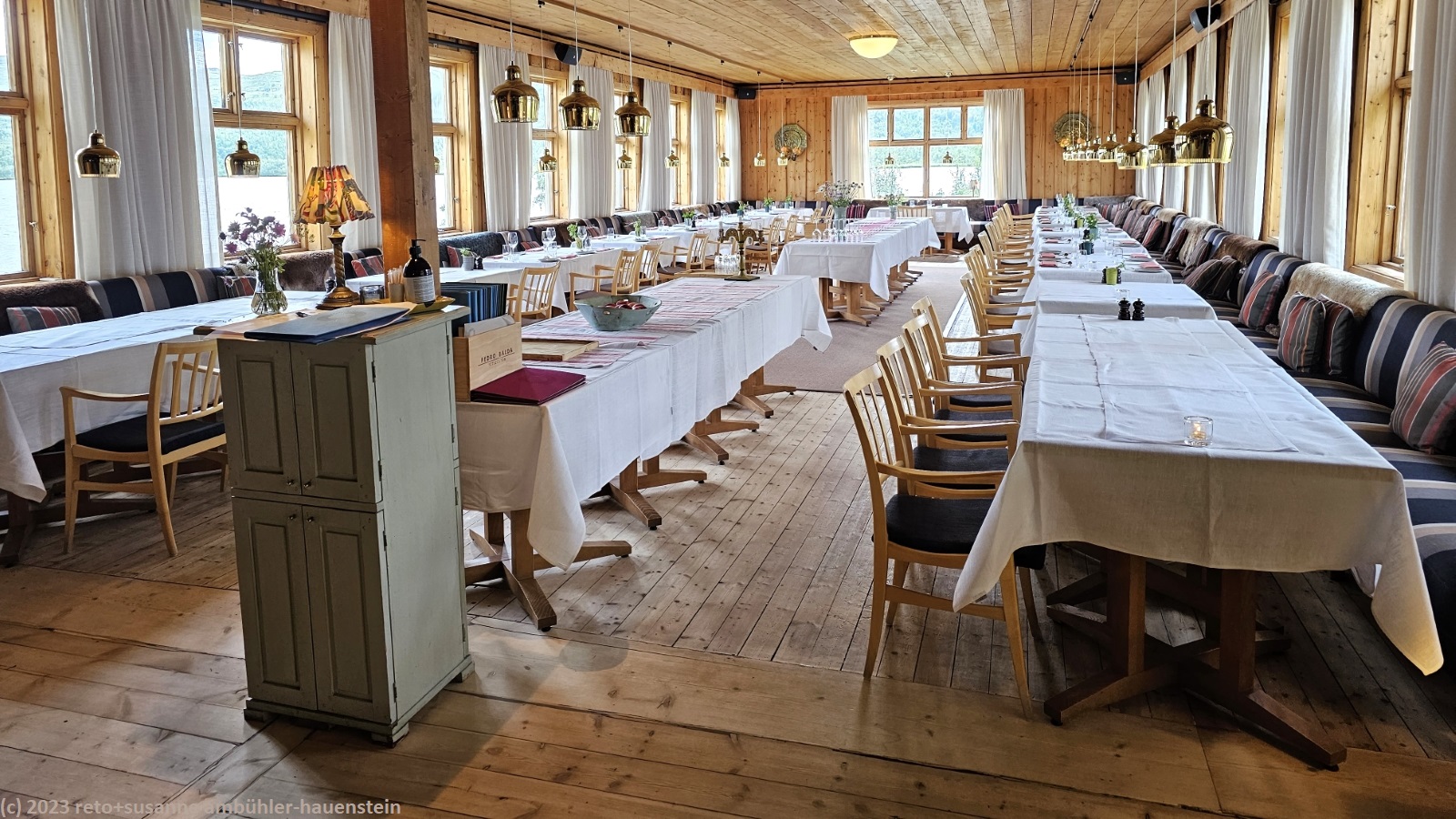 wir richten uns ein und spazieren dann am fluss entlang bis zum nahen hotel fjällnäs. dieses hat einen fantastisch schönen speisesaal und eine wunderhübsche kaffeestube. wir trinken einen kaffee und geniessen die wunderbare atmosphäre. wir sind so angetan von diesem restaurant, dass wir für freitag, 4-aug-2023 eine reservation für ein abendessen machen. dann sollten wir von unserer wanderung zurück sein.