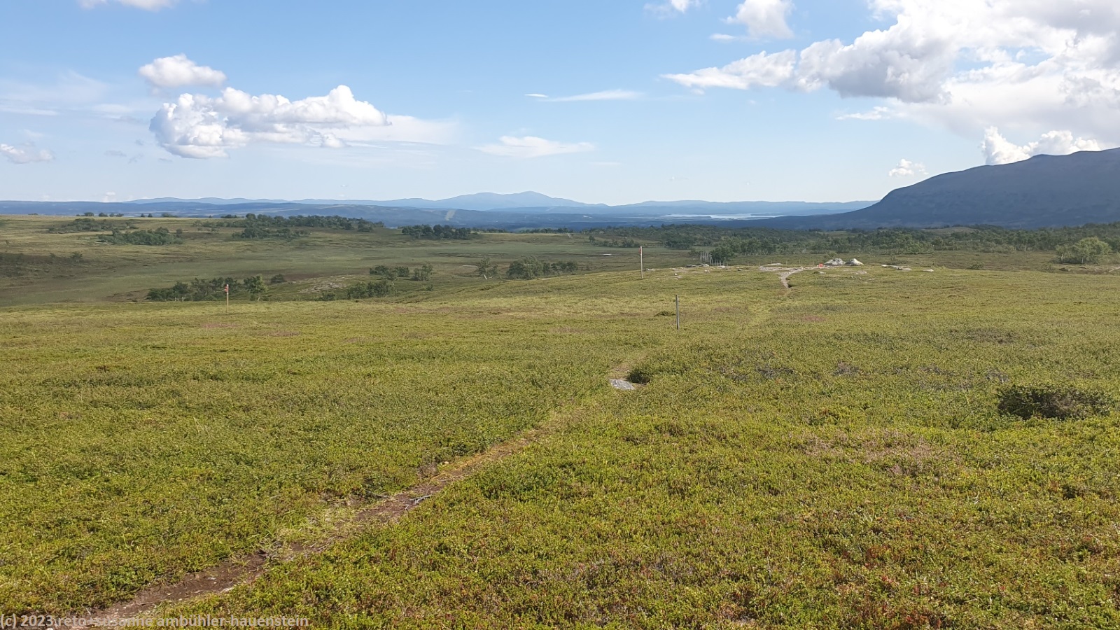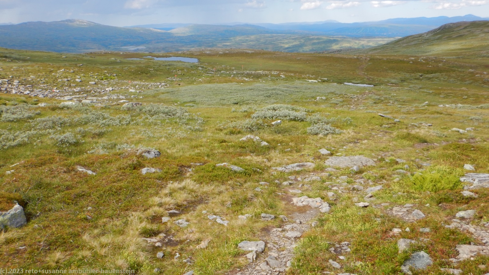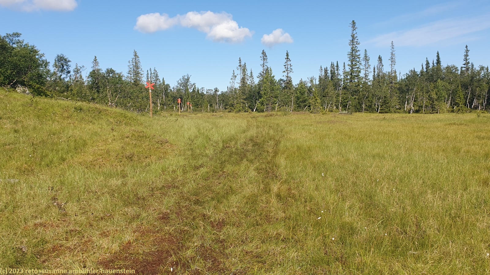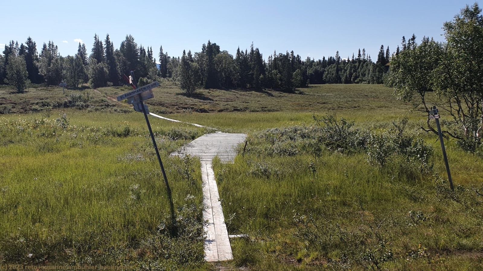 unser handy weckt uns um 7:30 uhr. nach der fast schlaflosen nacht gestern, habe ich heute göttlich geschlafen und fühle mich wieder richtig fit. kurz nach 8 uhr geniessen wir das frühstücksbuffet. es ist ziemlich reichhaltig und mit viel liebe zubereitet, so wie das ganze haus liebevoll eingerichtet ist. nach dem frühstück packen wir unsere rucksäcke und reinigen das zimmer. der himmel ist fast wolkenlos. als wir um 9:30 uhr aufbrechen, ist es erstaunlich warm. die ersten kilometer führen durch sehr sumpfiges gebiet. ich bin mir nicht ganz sicher, ob dies wirklich der wanderweg ist. der pfad ist zwar mit blåhammar angeschrieben, es steht aber auch winterwanderweg, wenn auch in klammern. jedenfalls ist der pfad mit roten kreuzen ausgeschildert, dies sind üblicherweise winterwanderwege. mein navi schlägt einen anderen weg vor, der aber ein stück weit der strasse entlang führt, das ist auch nicht schön. so kämpfen wir uns durch den sumpf. es hat auch einige mücken, aber so lange wir in bewegung sind, braucht es kein antibrumm. der pfad steigt langsam an, irgendwann kommen wir über die baumgrenze. der weg ist nun weniger nass. es ziehen einige wolken auf, aber es ist weiterhin sonnig und warm. kurz vor 11:40 uhr erreichen wir den ersten zwischengipfel. danach geht es zum fluss enan hinunter. wir wandern nun wieder durch wald.