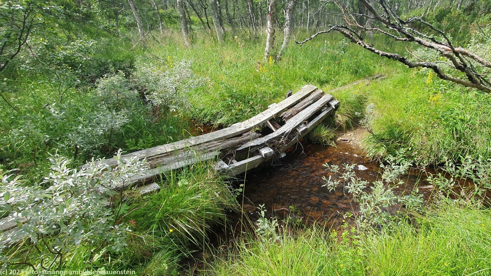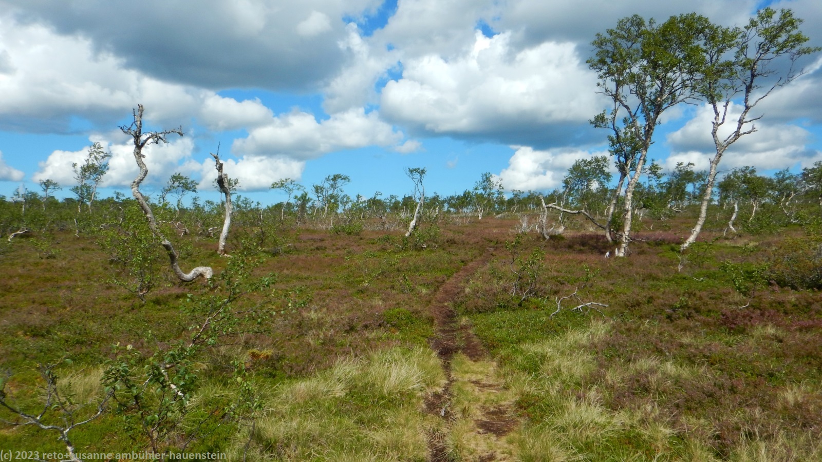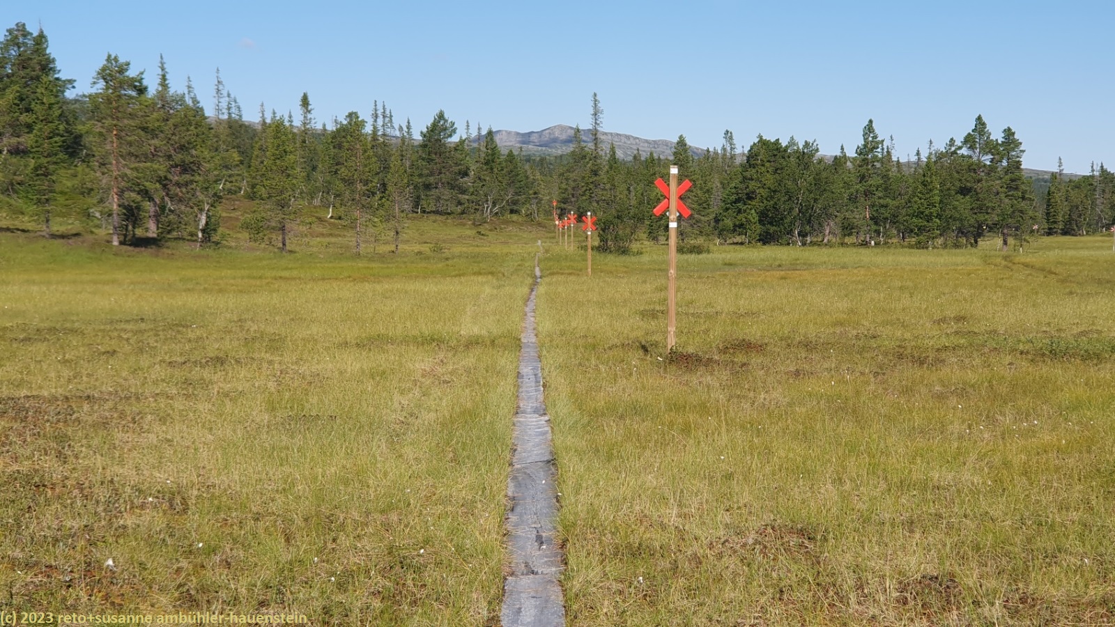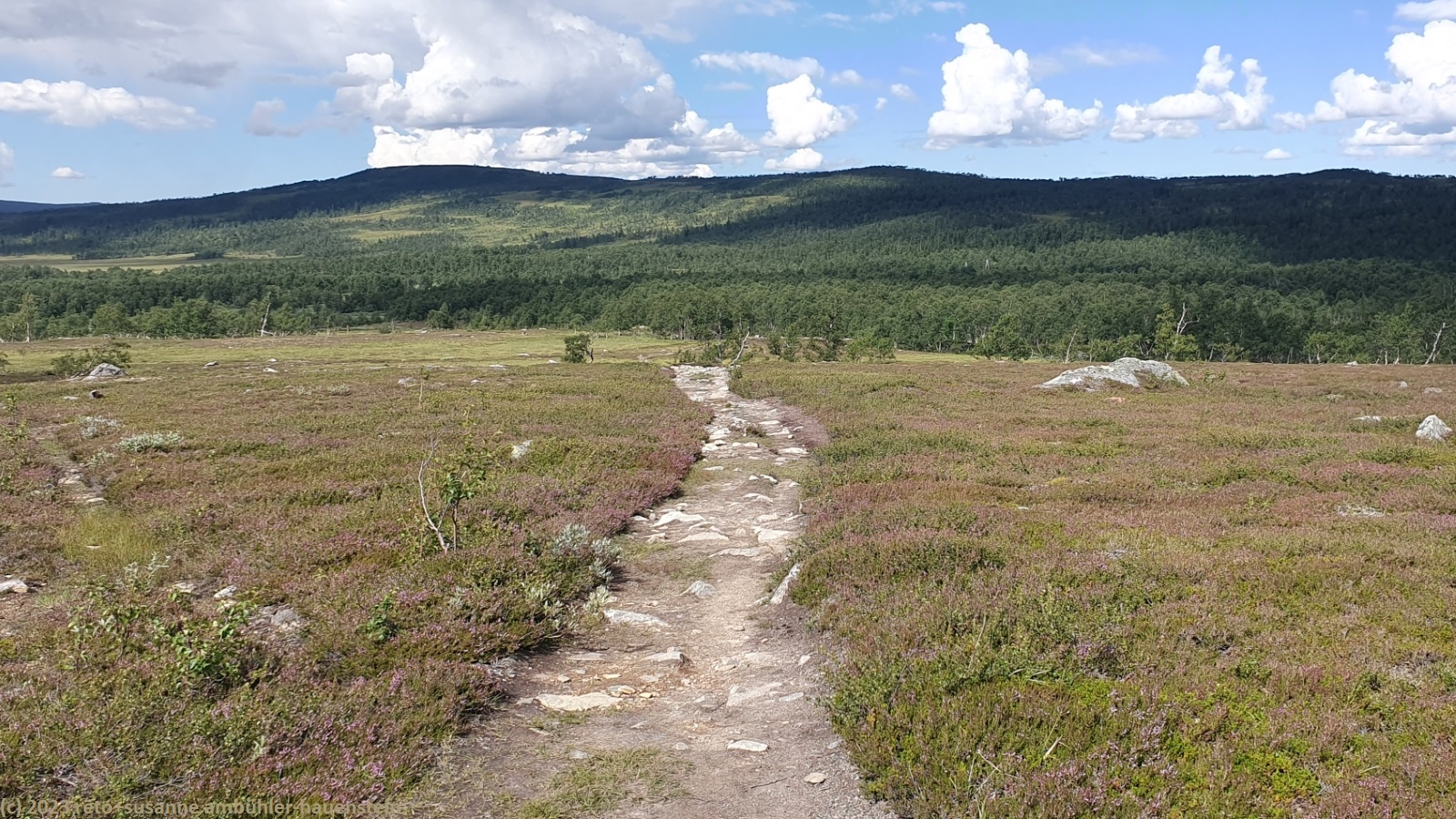 unser handy weckt uns um 7:30 uhr. nach der fast schlaflosen nacht gestern, habe ich heute göttlich geschlafen und fühle mich wieder richtig fit. kurz nach 8 uhr geniessen wir das frühstücksbuffet. es ist ziemlich reichhaltig und mit viel liebe zubereitet, so wie das ganze haus liebevoll eingerichtet ist. nach dem frühstück packen wir unsere rucksäcke und reinigen das zimmer. der himmel ist fast wolkenlos. als wir um 9:30 uhr aufbrechen, ist es erstaunlich warm. die ersten kilometer führen durch sehr sumpfiges gebiet. ich bin mir nicht ganz sicher, ob dies wirklich der wanderweg ist. der pfad ist zwar mit blåhammar angeschrieben, es steht aber auch winterwanderweg, wenn auch in klammern. jedenfalls ist der pfad mit roten kreuzen ausgeschildert, dies sind üblicherweise winterwanderwege. mein navi schlägt einen anderen weg vor, der aber ein stück weit der strasse entlang führt, das ist auch nicht schön. so kämpfen wir uns durch den sumpf. es hat auch einige mücken, aber so lange wir in bewegung sind, braucht es kein antibrumm. der pfad steigt langsam an, irgendwann kommen wir über die baumgrenze. der weg ist nun weniger nass. es ziehen einige wolken auf, aber es ist weiterhin sonnig und warm. kurz vor 11:40 uhr erreichen wir den ersten zwischengipfel. danach geht es zum fluss enan hinunter. wir wandern nun wieder durch wald.