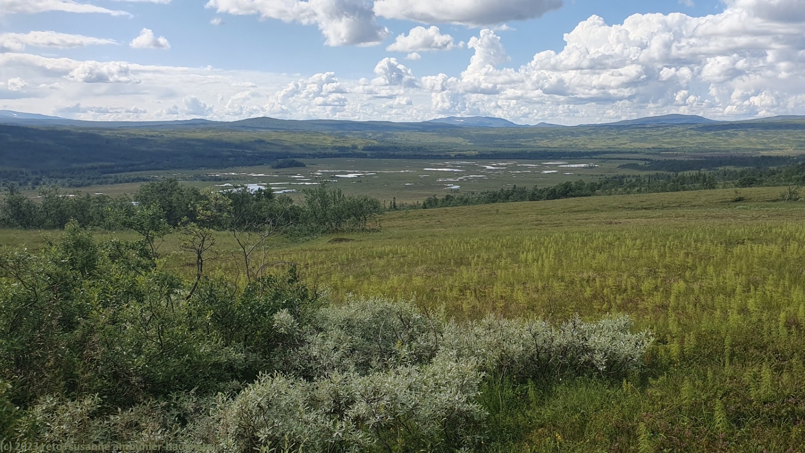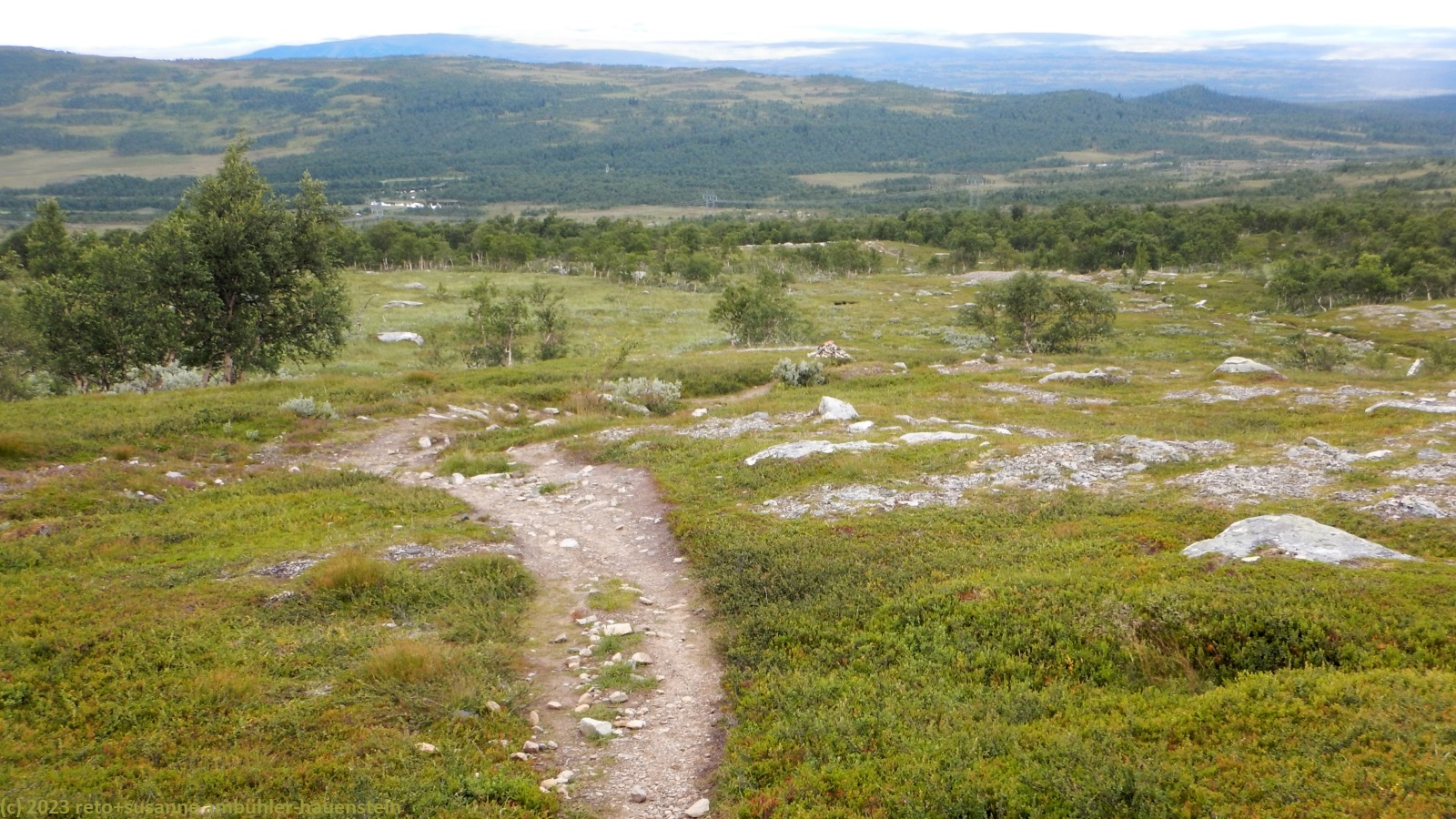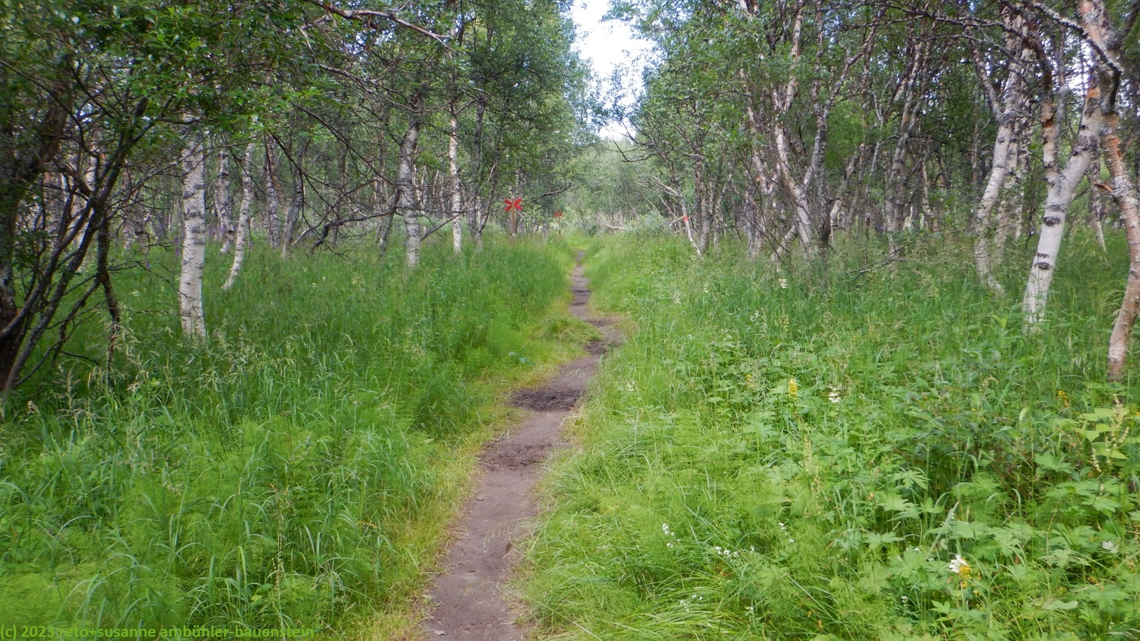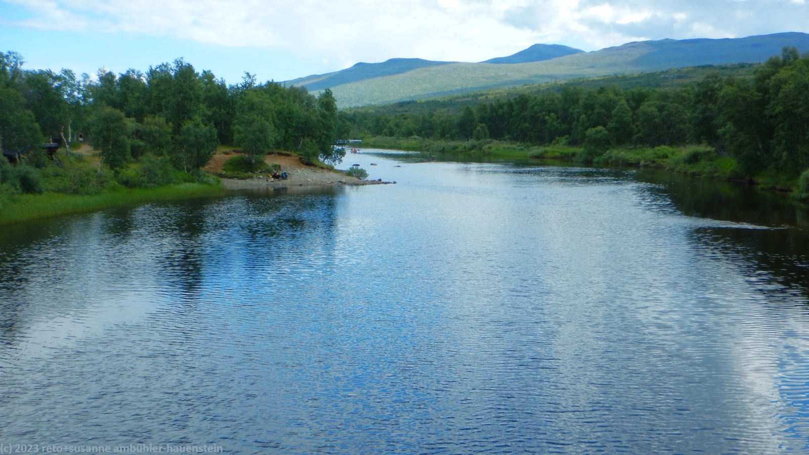 unser handy weckt uns um 7:30 uhr. nach der fast schlaflosen nacht gestern, habe ich heute göttlich geschlafen und fühle mich wieder richtig fit. kurz nach 8 uhr geniessen wir das frühstücksbuffet. es ist ziemlich reichhaltig und mit viel liebe zubereitet, so wie das ganze haus liebevoll eingerichtet ist. nach dem frühstück packen wir unsere rucksäcke und reinigen das zimmer. der himmel ist fast wolkenlos. als wir um 9:30 uhr aufbrechen, ist es erstaunlich warm. die ersten kilometer führen durch sehr sumpfiges gebiet. ich bin mir nicht ganz sicher, ob dies wirklich der wanderweg ist. der pfad ist zwar mit blåhammar angeschrieben, es steht aber auch winterwanderweg, wenn auch in klammern. jedenfalls ist der pfad mit roten kreuzen ausgeschildert, dies sind üblicherweise winterwanderwege. mein navi schlägt einen anderen weg vor, der aber ein stück weit der strasse entlang führt, das ist auch nicht schön. so kämpfen wir uns durch den sumpf. es hat auch einige mücken, aber so lange wir in bewegung sind, braucht es kein antibrumm. der pfad steigt langsam an, irgendwann kommen wir über die baumgrenze. der weg ist nun weniger nass. es ziehen einige wolken auf, aber es ist weiterhin sonnig und warm. kurz vor 11:40 uhr erreichen wir den ersten zwischengipfel. danach geht es zum fluss enan hinunter. wir wandern nun wieder durch wald.