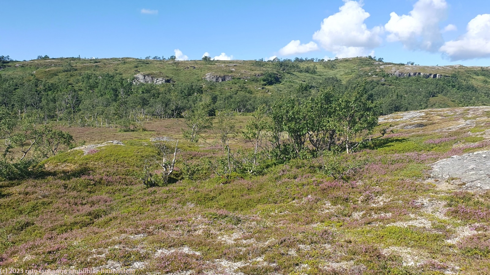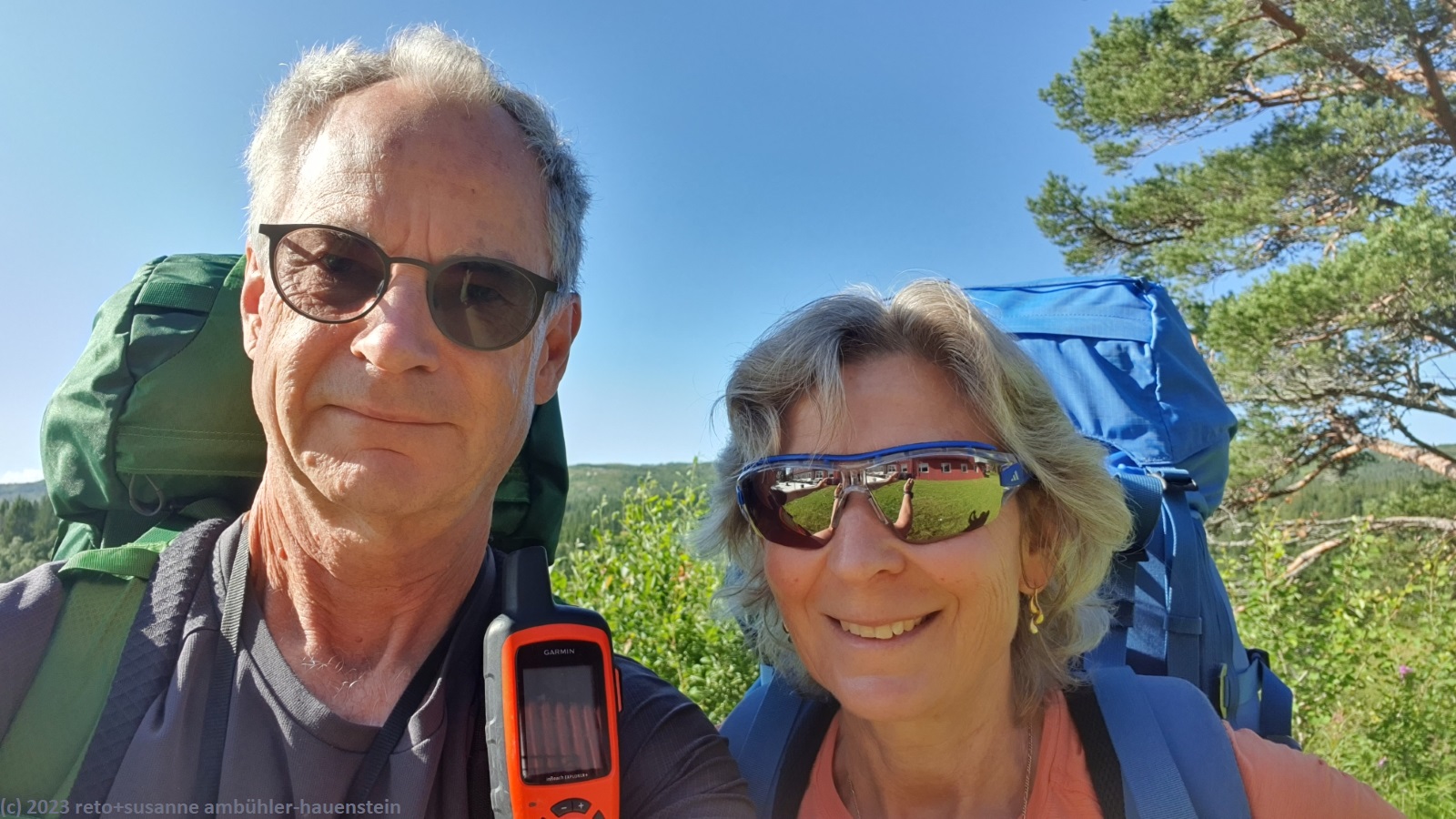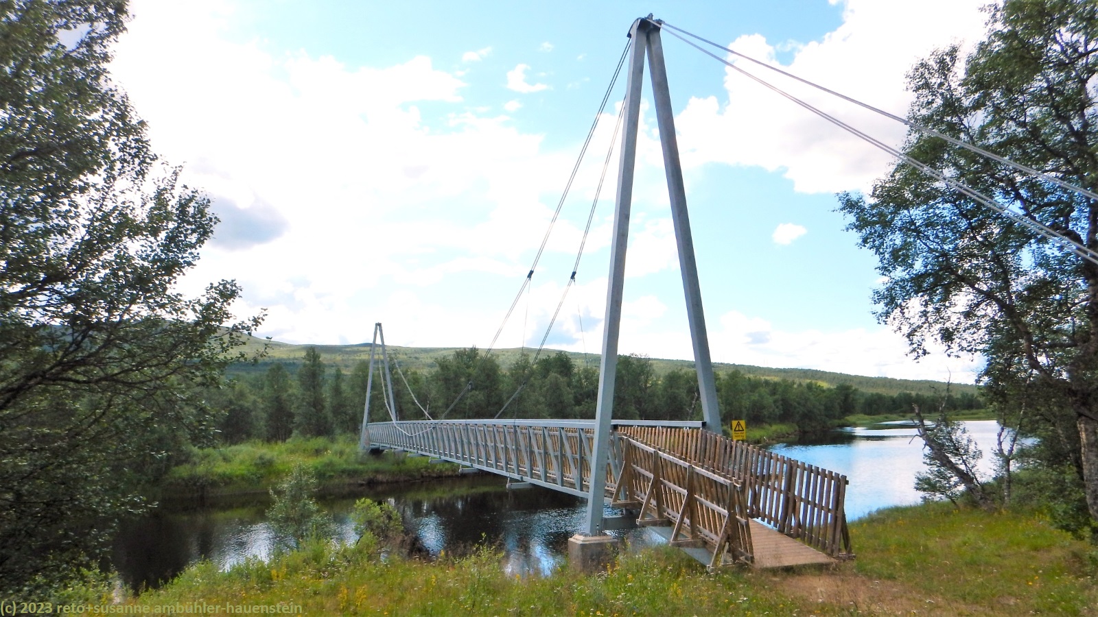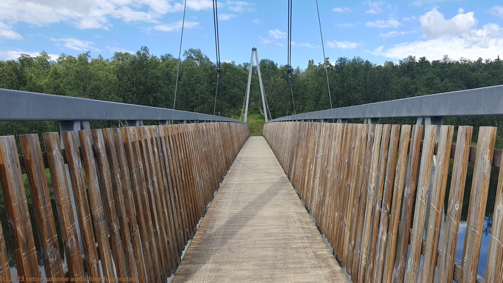 unser handy weckt uns um 7:30 uhr. nach der fast schlaflosen nacht gestern, habe ich heute göttlich geschlafen und fühle mich wieder richtig fit. kurz nach 8 uhr geniessen wir das frühstücksbuffet. es ist ziemlich reichhaltig und mit viel liebe zubereitet, so wie das ganze haus liebevoll eingerichtet ist. nach dem frühstück packen wir unsere rucksäcke und reinigen das zimmer. der himmel ist fast wolkenlos. als wir um 9:30 uhr aufbrechen, ist es erstaunlich warm. die ersten kilometer führen durch sehr sumpfiges gebiet. ich bin mir nicht ganz sicher, ob dies wirklich der wanderweg ist. der pfad ist zwar mit blåhammar angeschrieben, es steht aber auch winterwanderweg, wenn auch in klammern. jedenfalls ist der pfad mit roten kreuzen ausgeschildert, dies sind üblicherweise winterwanderwege. mein navi schlägt einen anderen weg vor, der aber ein stück weit der strasse entlang führt, das ist auch nicht schön. so kämpfen wir uns durch den sumpf. es hat auch einige mücken, aber so lange wir in bewegung sind, braucht es kein antibrumm. der pfad steigt langsam an, irgendwann kommen wir über die baumgrenze. der weg ist nun weniger nass. es ziehen einige wolken auf, aber es ist weiterhin sonnig und warm. kurz vor 11:40 uhr erreichen wir den ersten zwischengipfel. danach geht es zum fluss enan hinunter. wir wandern nun wieder durch wald.