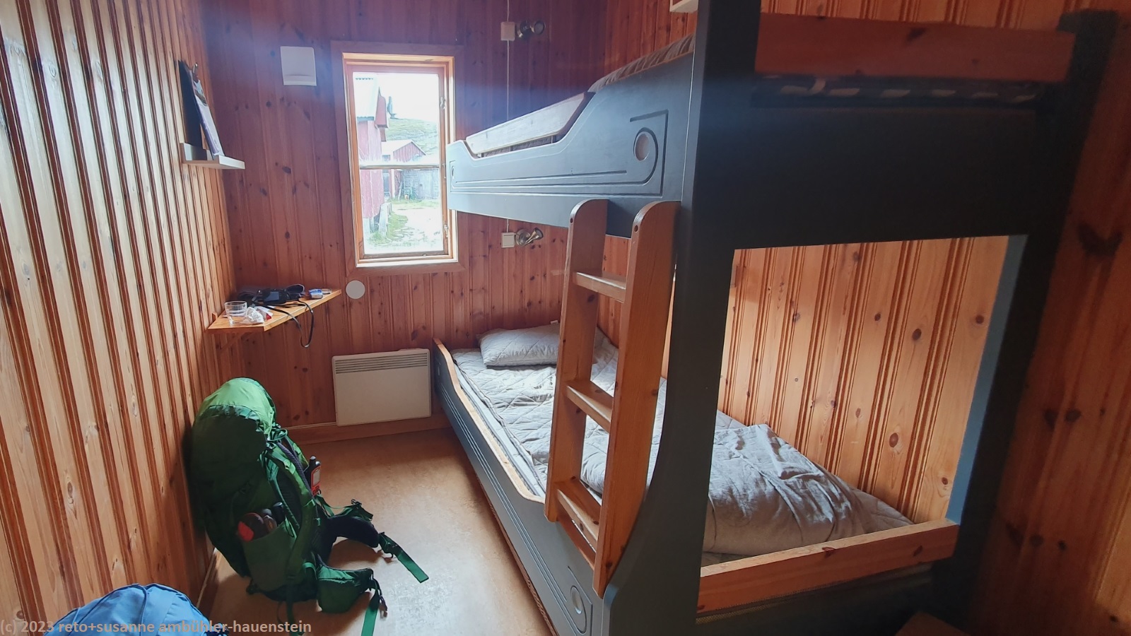 nach dem duschen setzen wir uns in die sauna um allfällige verspannte muskeln etwas zu lockern. später nehmen wir im aufenthaltsraum platz und lesen, bzw. schreiben tagebuch. die restliche zeit bis zum abendessen verbringen wir in unserem zimmer. als wir um 17:50 uhr in den esssaal kommen, sitzen bereits einige leute an ihren tischen. für's nachtessen werden die sitzplätze zugeteilt. es ist ziemlich eng und es ist wohl jeder verfügbare stuhl besetzt. knapp 30 minuten später beginnt das abendessen mit einer präsentation durch die küchenmannschaft. zuerst wird etwas über die geschichte der blåhammarens fjällstation erzählt. ursprünglich wurde hier auf dem höchsten punkt eine übernachtungsmöglichkeit für die durchreise von storlien richtung süden errichtet. heute ist diese fjällstation die kleinste und zugleich höchstgelegene hütte des STF. anschliessend wird das menu vorgestellt und zum schluss wird das weinangebot erläutert. wir müssen uns dann nochmals eine halbe stunde gedulden, bis wir die vorspeise holen dürfen. es gibt eine scheibe elchwurst, weissen und roten kabissalat, humus, verschiedene brote und andere zutaten. als hauptspeise stehen rentierfleisch, kleine kartoffeln und die gleichen beilagen wie bei der vorspeise zur auswahl. das rentierfleisch schmeckt vorzüglich. als nachspeise wird messmör - "molkebutter" - mit einer moltebeerensauce und schokoladenstücken serviert, das schmeckt superlecker. wir teilen den tisch mit einem australier und einem schweden. letzterer hat sich heute beim aufstieg den fuss verstaucht, er wird es morgen nicht einfach haben. kurz vor 21 uhr ist das essen beendet. wir verbringen den abend mit lesen im zimmer und schlüpfen gegen 21:30 uhr in den schlafsack.