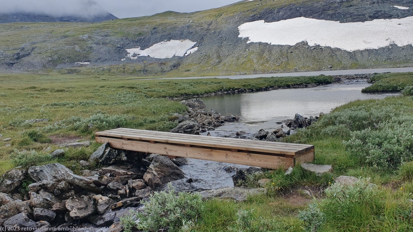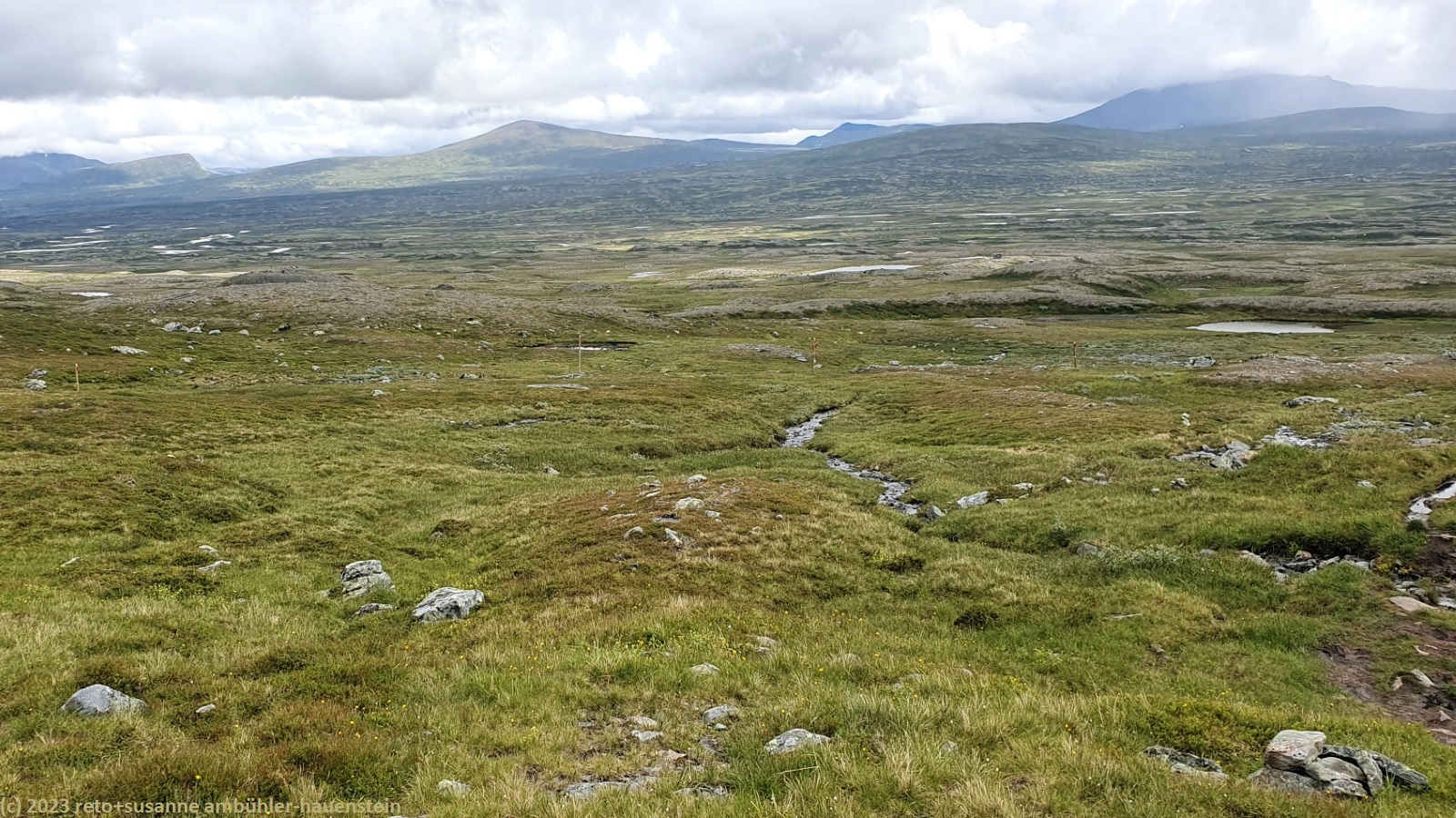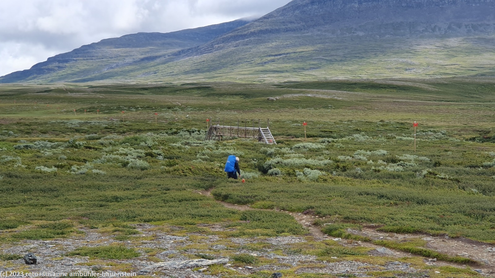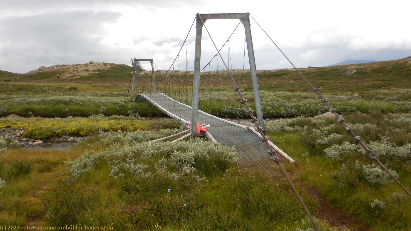 wir stehen kurz nach 7 uhr auf und frühstücken im esssaal. knapp zwei stunden später wären wir eigentlich startbereit, aber es giesst gerade wie aus kübeln. eine weitere halbe stunde später machen wir uns mit regenjacken und -hosen ausgerüstet auf den weg. als wir ins freie treten, nieselt es bloss noch. auf den ersten 1.5 km gilt es 160 höhenmeter zu überwinden. da es inzwischen ganz aufgehört hat zu regnen, ziehen wir die regenkleider aus, danach nehmen wir den abstieg zum pojktjärnen in angriff. der pfad folgt nun erst der höhenlinie, dann geht es in die ausgedehnte hochebene des handölan hinunter. kurz bevor wir die schutzhütte miesehketjahke erreichen, gilt es noch einen etwas breiteren zufluss des handölan zu überwinden. als wir die schutzhütte erreichen, scheint die sonne, aber schon augenblicke später verdunkeln wolken den himmel und es fällt etwas regen. wir picknicken deshalb in der schutzhütte. auf dem weiteren weg überqueren wir den östra ekorrån mittels hängebrücke, dann beginnt der lange, jedoch sanfte aufstieg zur helags fjällstation. bis wir das tagesziel erreichen, gilt es zwei weitere flüsse zu durchwaten. um 17:15 uhr erreichen wir unser tagesziel. der speisesaal ist auch heute gut besucht, die meisten gäste scheinen einheimische zu sein. nach dem essen geniessen wir eine sitzung in der sauna und verbringen danach einen ruhigen abend in unserem zimmer.