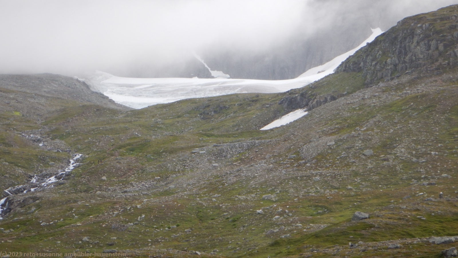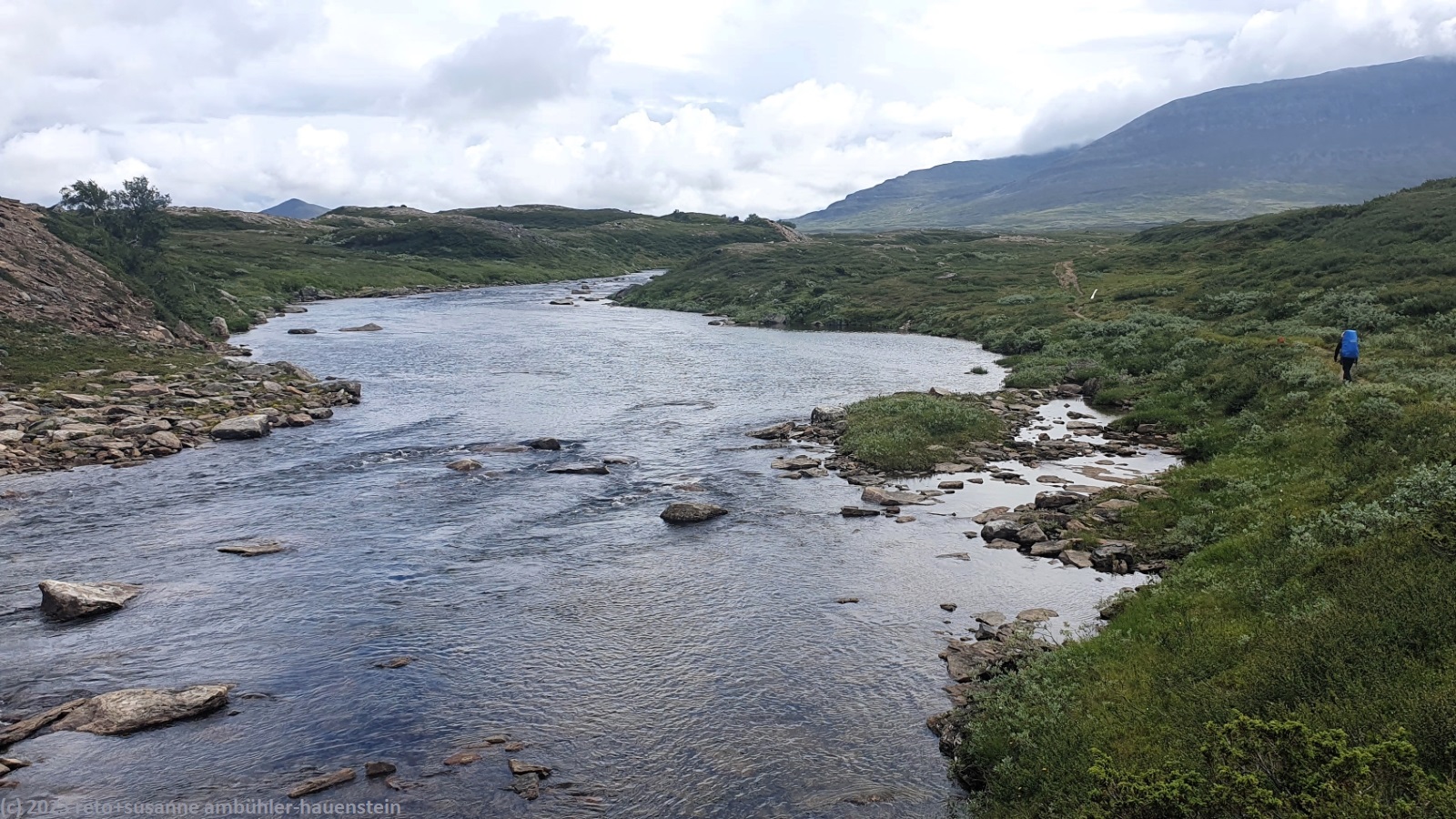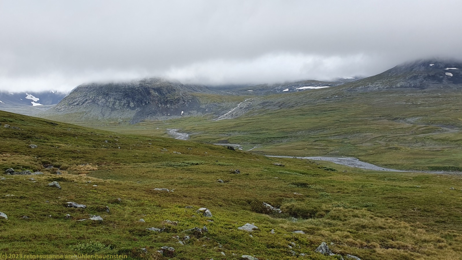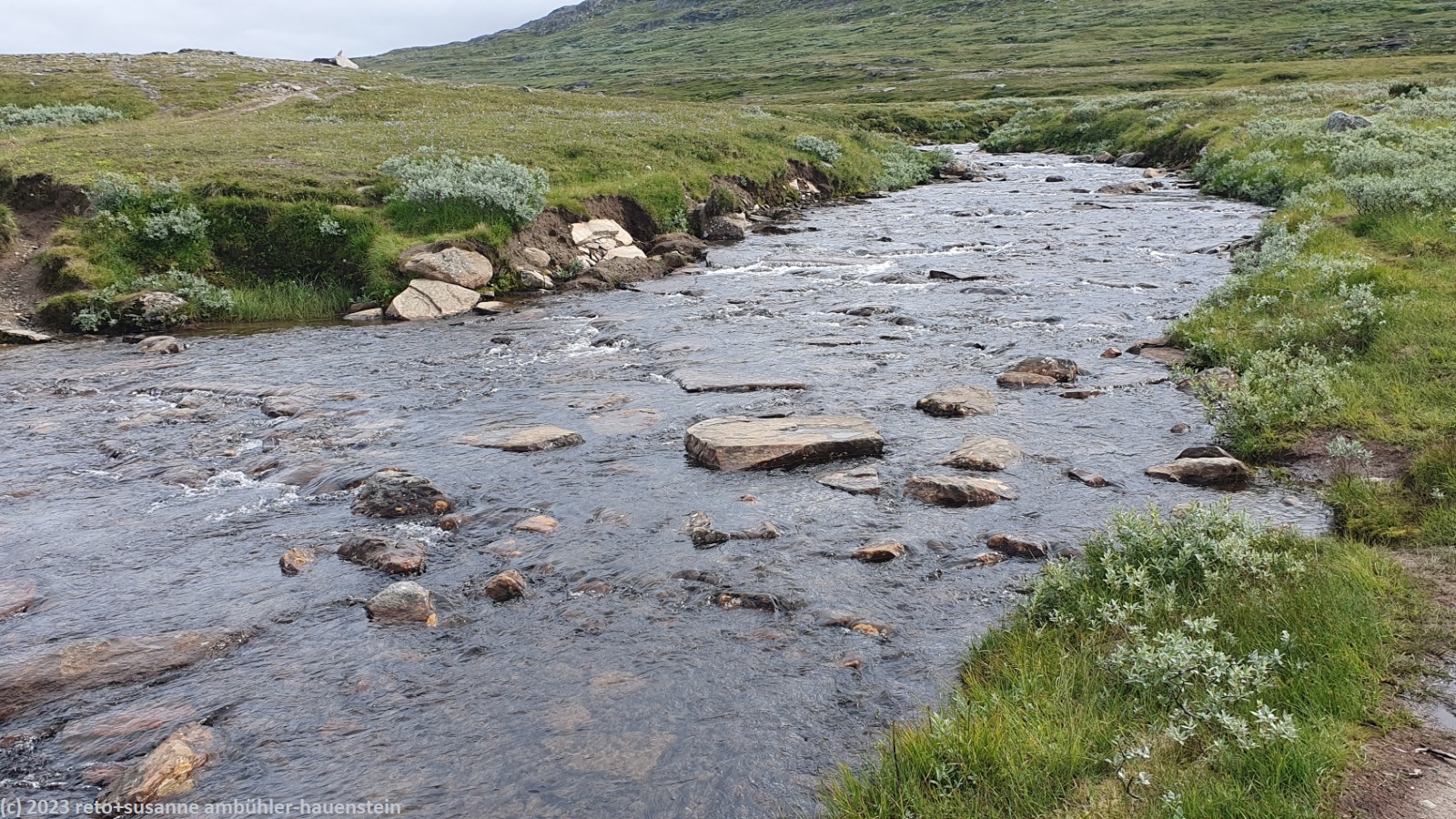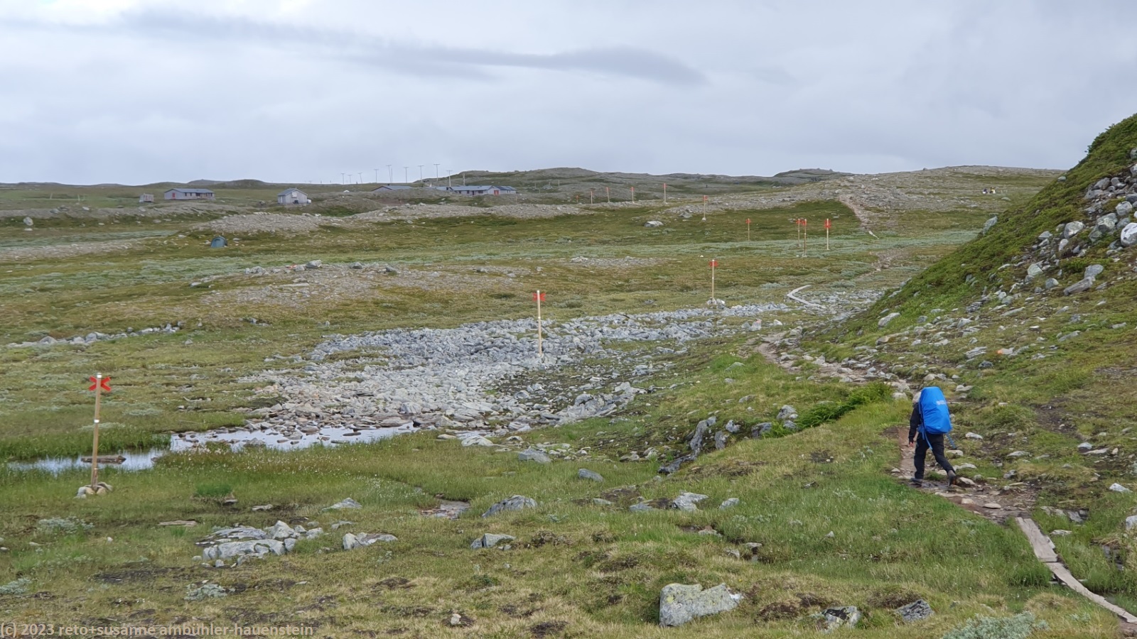 wir stehen kurz nach 7 uhr auf und frühstücken im esssaal. knapp zwei stunden später wären wir eigentlich startbereit, aber es giesst gerade wie aus kübeln. eine weitere halbe stunde später machen wir uns mit regenjacken und -hosen ausgerüstet auf den weg. als wir ins freie treten, nieselt es bloss noch. auf den ersten 1.5 km gilt es 160 höhenmeter zu überwinden. da es inzwischen ganz aufgehört hat zu regnen, ziehen wir die regenkleider aus, danach nehmen wir den abstieg zum pojktjärnen in angriff. der pfad folgt nun erst der höhenlinie, dann geht es in die ausgedehnte hochebene des handölan hinunter. kurz bevor wir die schutzhütte miesehketjahke erreichen, gilt es noch einen etwas breiteren zufluss des handölan zu überwinden. als wir die schutzhütte erreichen, scheint die sonne, aber schon augenblicke später verdunkeln wolken den himmel und es fällt etwas regen. wir picknicken deshalb in der schutzhütte. auf dem weiteren weg überqueren wir den östra ekorrån mittels hängebrücke, dann beginnt der lange, jedoch sanfte aufstieg zur helags fjällstation. bis wir das tagesziel erreichen, gilt es zwei weitere flüsse zu durchwaten. um 17:15 uhr erreichen wir unser tagesziel. der speisesaal ist auch heute gut besucht, die meisten gäste scheinen einheimische zu sein. nach dem essen geniessen wir eine sitzung in der sauna und verbringen danach einen ruhigen abend in unserem zimmer.