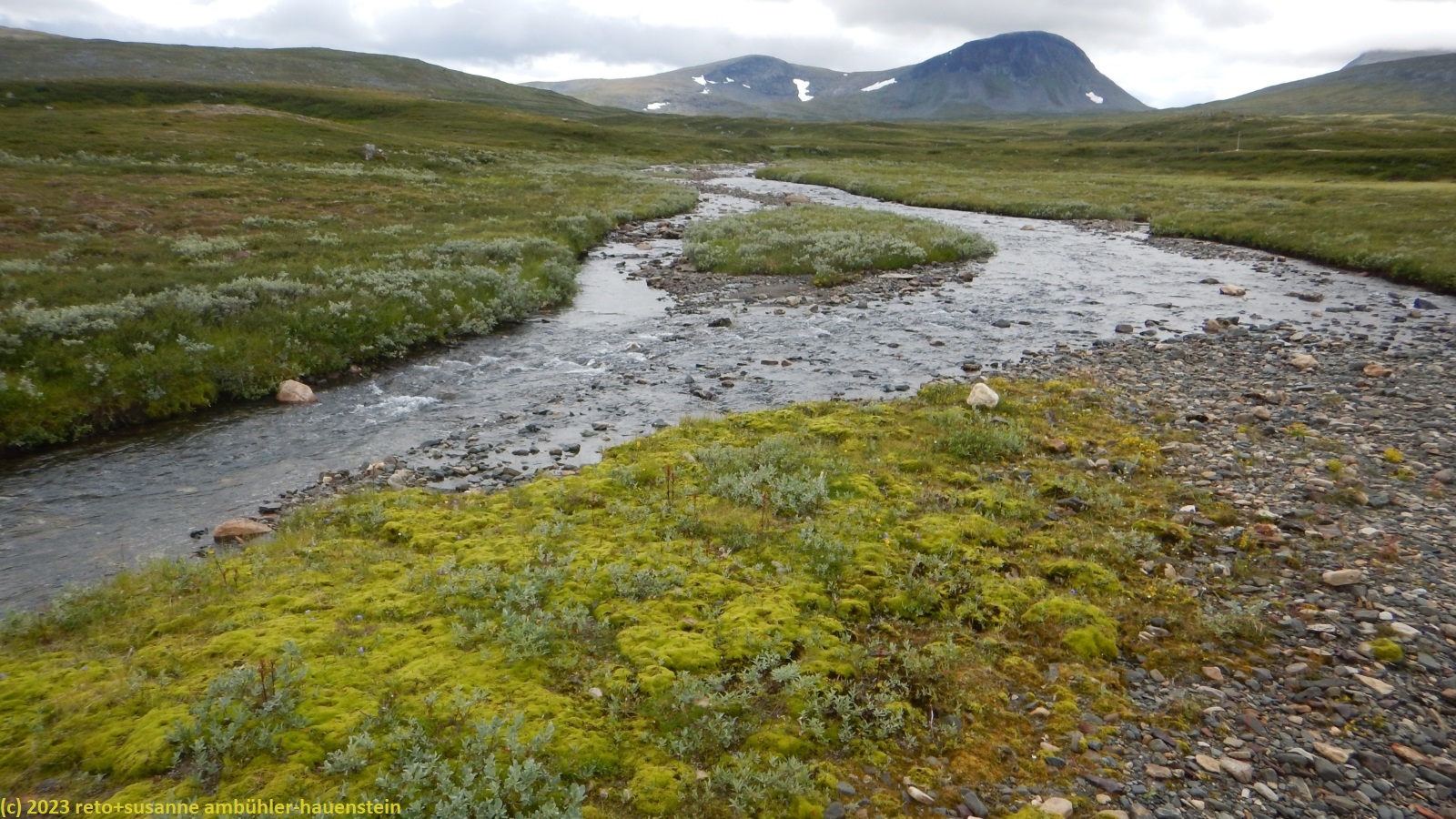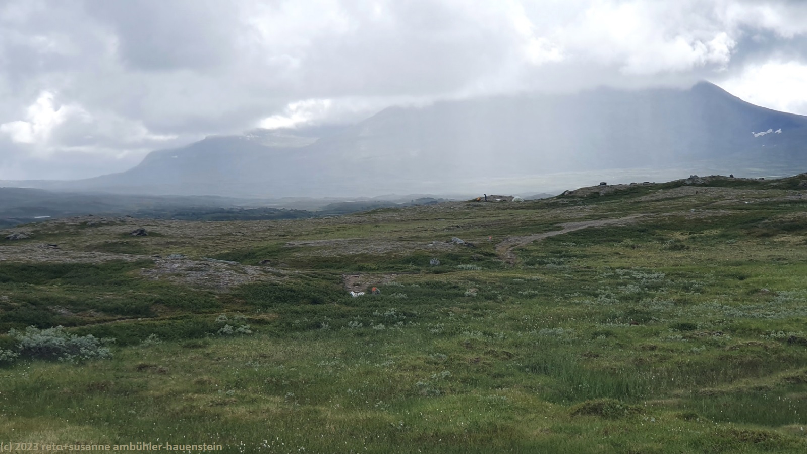 gemäss regenradar sollte es ab 9:30 uhr etwas trockener werden. wir sitzen deshalb noch eine halbe stunde im zimmer, dann ziehen wir das regenzeug an und machen uns auf den weg. als wir aus dem haus treten, hat der regen aufgehört, es nieselt nur noch ein wenig. auf den ersten 1.5 km geht es steil aufwärts, wir überwinden dabei 160 höhenmeter. um genau zu sein, ist - wie für schweden typisch - vorallem der anfang steil, nach etwa einem kilometer flacht der weg spürbar ab. auf einem etwa gleich langen abstieg geht es zum pojktjärnen hinunter. inzwischen ist das wetter richtig freundlich geworden, wir ziehen deshalb noch auf der anhöhe die regenjacken aus und verpacken sie im rucksack. wir folgen ein stück weit der höhenlinie, dann geht es nochmals abwärts richtung handölan. dieser schlängelt sich durch eine wunderschöne hochebene. während es bei uns immer noch trocken ist, sehen wir richtung helags weitere regenschauer vorbeiziehen. wir nehmen deshalb die regenjacken erneut hervor, allerdings vergeblich, also werden sie wenig später wieder im rucksack verstaut. gegen 12:30 uhr erreichen wir einen zufluss des handölan. hier gibt es keine brücke. mir gelingt es, den fluss mit den wanderschuhen trockenen fusses zu durchqueren. susanne tauscht die wanderschuhe gegen sandalen und watet mit hilfe der wanderstöcke durch's wasser. wenig später erreichen wir die schutzhütte miesehketjahke. während der wanderung zwischen fluss und schutzhütte scheint die sonne und es ist richtig warm. wir setzen uns deshalb auf die bank aussen an der hütte. doch kaum haben wir unsere brote ausgepackt, frischt der wind auf, die sonne verschwindet hinter grauen wolken und es fallen erste regentropfen. so suchen wir in der schutzhütte zuflucht. der regen hört zwar bald wieder auf, aber es bleibt kühl und windig.